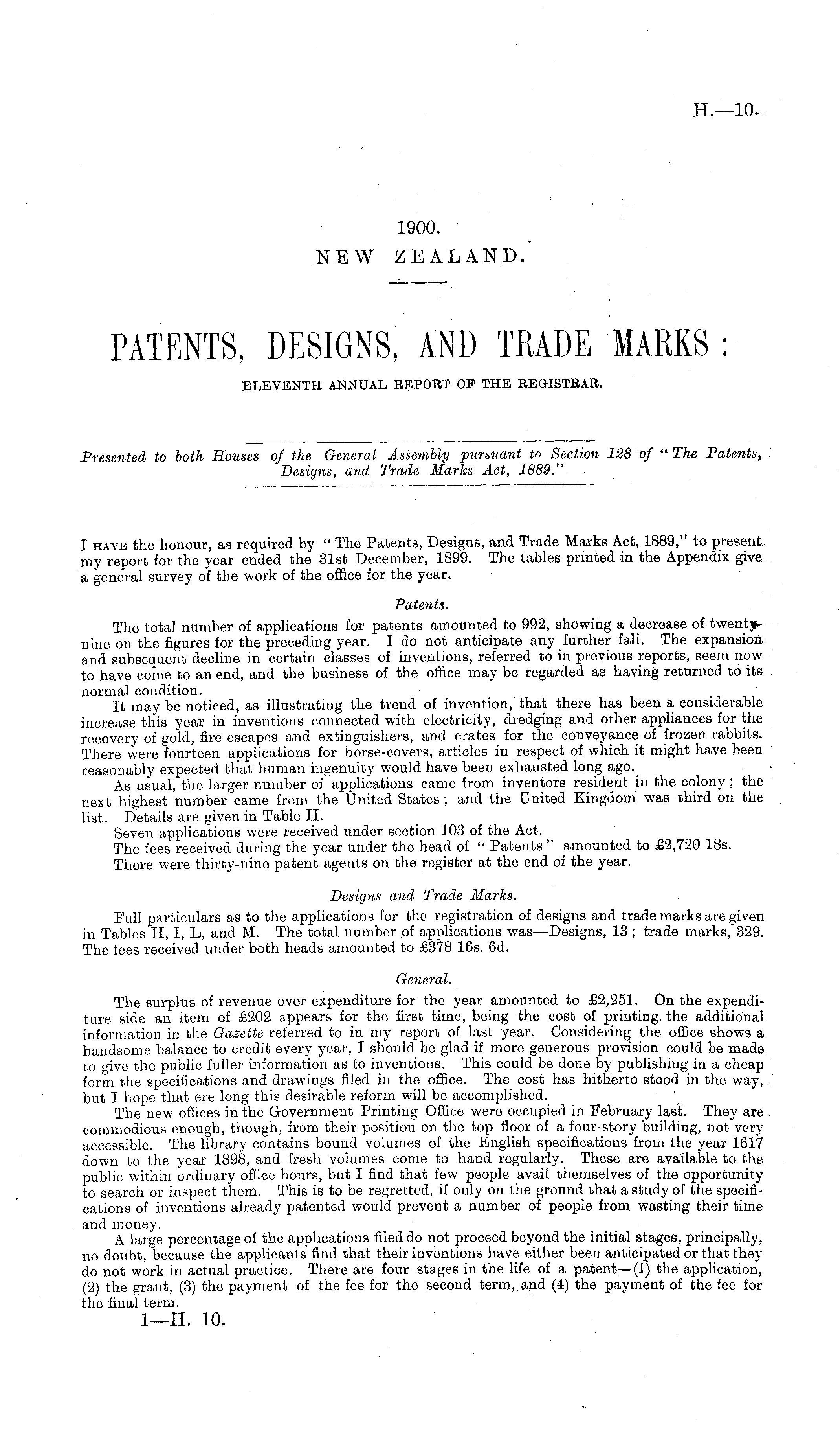 I have the honour, as required by " The Patents, Designs, and Trade Marks Act, 1889," to present, my report for the year ended the 31st December, 1899. The tables printed in the Appendix give a general survey of the work of the office for the year. Patents. The total number of applications for patents amounted to 992, showing a decrease of twentj*nine on the figures for the preceding year. I do not anticipate any further fall. The expansion and subsequent decline in certain classes of inventions, referred to in previous reports, seem now to have come to an end, and the business of the office may be regarded as having returned to its normal condition. It may be noticed, as illustrating the trend of invention, that there has been a considerable increase this year in inventions connected with electricity, dredging and other appliances for the recovery of gold, fire escapes and extinguishers, and crates for the conveyance of frozen rabbits. There were fourteen applications for horse-covers, articles in respect of which it might have been reasonably expected that human ingenuity would have been exhausted long ago. As usual, the larger number of applications came from inventors resident in the colony ; the next highest number came from the United States ; and the United Kingdom was third on the list. Details are given in Table H. Seven applications were received under section 103 of the Act. The fees received during the year under the head of " Patents " amounted to £2,720 18s. There were thirty-nine patent agents on the register at the end of the year. Designs and Trade Marks. Pull particulars as to the applications for the registration of designs and trade marks are given in Tables H, I, L, and M. The total number of applications was—Designs, 13; trade marks, 329. The fees received under both heads amounted to £378 16s. 6d. General. The surplus of revenue over expenditure for the year amounted to £2,251. On the expenditure side an item of £202 appears for the first time, being the cost of printing, the additional information in the Gazette referred to in my report of last year. Considering the office shows a handsome balance to credit every year, I should be glad if more generous provision could be made to give the public fuller information as to inventions. This could be done by publishing in a choap form the specifications and drawings filed in the office. The cost has hitherto stood in the way, but I hope that ere long this desirable reform will be accomplished. The new offices in the Government Printing Office were occupied in February last. They are commodious enough, though, from their position on the top floor of a four-story building, not very accessible. The library contains bound volumes of the English specifications from the year 1617 down to the year 1898, and fresh volumes come to hand regularly. These are available to the public within ordinary office hours, but I find that few people avail themselves of the opportunity to search or inspect them. This is to be regretted, if only on the ground that a study of the specifications of inventions already patented would prevent a number of people from wasting their time and money. A large percentage of the applications filed do not proceed beyond the initial stages, principally, no doubt, because the applicants find that their inventions have either been anticipated or that they do not work in actual practice. There are four stages in the life of a patent—(l) the application, (2) the grant, (3) the payment of the fee for the second term, and (4) the payment of the fee for the final term.