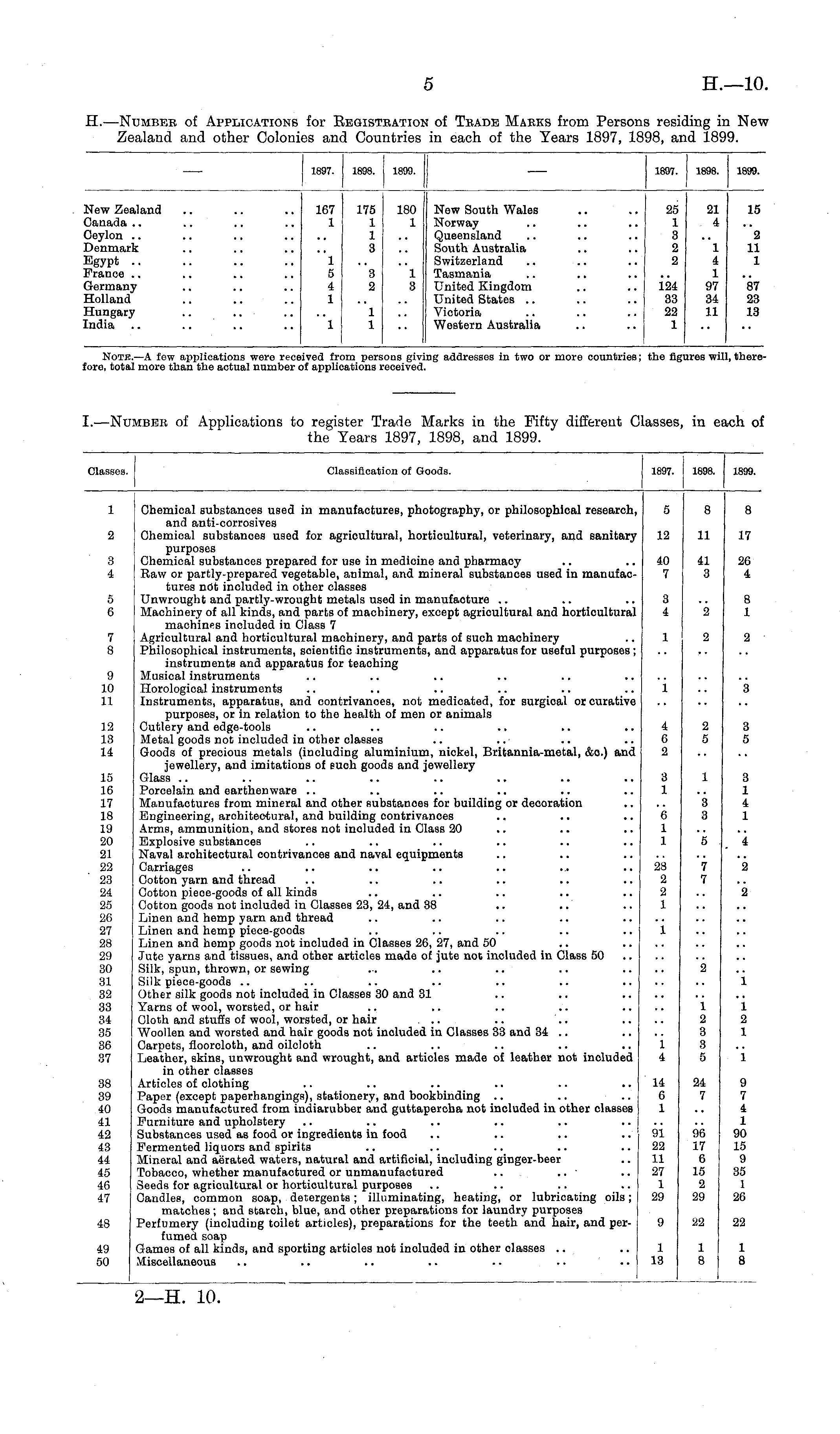 I.—Number of Applications to register Trade Marks in the Fifty different Classes, in each of the Years 1897, 1898, and 1899.