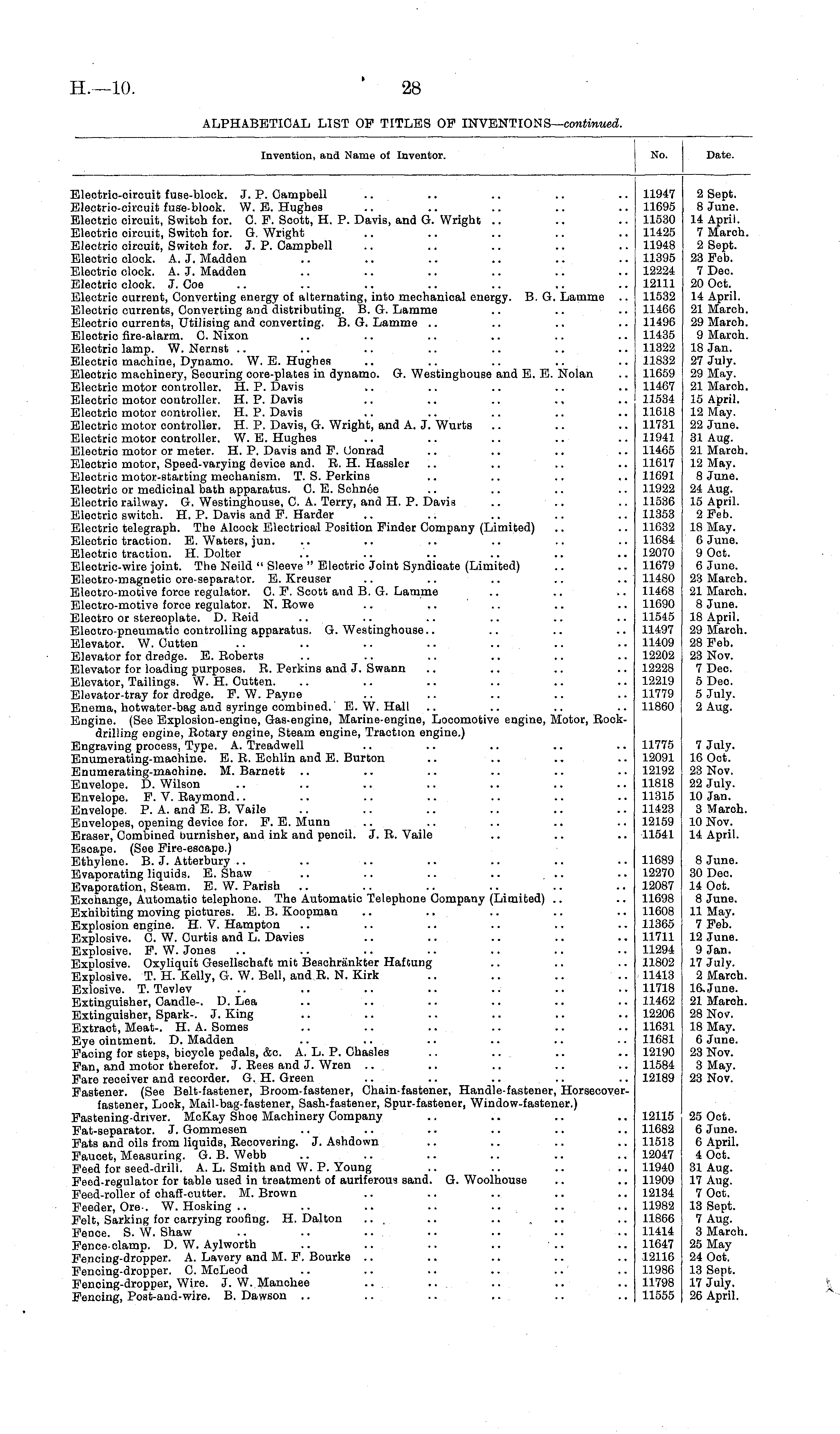 Invention, and Name of Inventor. No. Date. Eleotrio-oircuit fuse-blook. J. P. Campbell Electric-circuit fuse-block. W.E.Hughes Electric circuit, Switch for. C. F. Soott, H. P. Davis, and G. Wright Eleotric oircuit, Switch for. G. Wright Electric circuit, Switch for. J. P. Campbell Electric clock. A. J. Madden Electrio clock. A. J. Madden Electrio clock. J. Coe Electric current, Converting energy of alternating, into mechanical energy. B. G. Lamme .. Eleotric currents, Converting and distributing. B. G. Lamme Electrio currents, Utilising and converting. B. G. Lamme Eleotric fire-alarm. C. Nixon Electric lamp. W. Nernst Electrio maohine, Dynamo. W.E.Hughes Eleotric machinery, Securing core-plates in dynamo. G. Westinghouse and E. E. Nolan Electric motor controller. H. P. Davis Electrio motor controller. H. P. Davis Electric motor controller. H. P. Davis Eleotric motor controller. H. P. Davis, G. Wright, and A. J. Wurts Electrio motor controller. W. E. Hughes Electric motor or meter. H. P. Davis and F. Uonrad Eleotric motor, Speed-varying device and. R. H. Hassler Electrio motor-starting mechanism. T. S. Perkins Electric or medicinal bath apparatus. C. E. Schnee Electrio railway. G. Westinghouse, C. A. Terry, and H. P. Davis Electrio switch. H. P. Davis and F. Harder Electric telegraph. The Alcock Eleotrical Position Finder Company (Limited) Eleotric traction. E. Waters, jun. Electric traction. H. Dolter Eleotric-wire joint. The Neild " Sleeve " Eleotric Joint Syndioate (Limited) Electro-magnetic ore-separator. E. Kreuser Electro-motive force regulator. C. F. Scott and B. G. Lamme Eleotro-motive force regulator. N. Rowe Electro or stereoplate. D. Reid Eleotro-pneumatic controlling apparatus. G. Westinghouse.. Elevator. W. Cutten .. .. .. .. ... Elevator for dredge. E. Roberts Elevator for loading purposes. R. Perkins and J. Swann Elevator, Tailings. W. H. Cutten. Elevator-tray for dredge. F. W. Payne Enema, hotwater-bag and syringe combined. E.W.Hall Engine. (See Explosion-engine, Gas-engine, Marine-engine, Locomotive engine, Motor, Rockdrilling engine, Rotary engine, Steam engine, Traction engine.) Engraving process, Type. A. Treadwell Enumerating-machine. E. R. Echlin and E. Burton Enumerating-machine. M. Barnett Envelope. D. Wilson Envelope. F.V.Raymond.. Envelope. P. A. and E. B. Vaile Envelopes, opening device for. F. B. Munn Eraser, Combined burnisher, and ink and pencil. J. R. Vaile Escape. (See Fire-escape.) Ethylene. B. J. Atterbury Evaporating liquids. E. Shaw .. .. .. .. ... Evaporation, Steam. E. W. Parish Exchange, Automatic telephone. The Automatic Telephone Company (Limited) Exhibiting moving pictures. E. B. Koopman Explosion engine. H. V. Hampton Explosive. C. W. Curtis and L. Davies Explosive. F. W. Jones Explosive. Oxyliquit Gesellschaft mit Beschrankter Haftung Explosive. T. H. Kelly, G. W. Bell, and R. N. Kirk Exlosive. T. Tevlev Extinguisher, Candle-. D. Lea Extinguisher, Spark-. J. King Extract, Meat-. H. A. Somes Eye ointment. D. Madden Facing for steps, bicyole pedals, &e A. L. P. Chasles Fan, and motor therefor. J. Rees and J. Wren .. Fare receiver and recorder. G. H. Green Fastener. (See Belt-fastener, Broom-fastener, Chain-fastener, Handle-fastener, Horsecoverfastener, Look, Mail-bag-fastener, Sash-fastener, Spur-fastener, Window-faatener.) Fastening-driver. McKay Shoe Machinery Company Fat-separator. J. Gommesen Fats and oils from liquids, Recovering. J. Ashdown Faucet, Measuring. G. B. Webb Feed for seed-drill. A. L. Smith and W. P. Young Feed-regulator for table used in treatment of auriferous sand. G. Woolhouse Feed-roller of chaff-cutter. M. Brown Feeder, Ore-. W. Hosking .. Felt, Sarking for carrying roofing. H. Dalton ... .. .. ... Fence. S.W.Shaw .. .. ... Fence-clamp. D. W. Aylworth Fencing-dropper. A. Lavery and M. F. Bourke Fenoing-dropper. G. McLeod Fencing-dropper, Wire. J. W. Manchee ... ... Fencing, Post-and-wire. B. Dawson 11947 11695 11530 11425 11948 11395 12224 12111 11532 11466 11496 11435 11322 11832 11659 11467 11534 11618 11731 11941 11465 11617 11691 11922 11536 11353 11632 11684 12070 11679 11480 11468 11690 11545 11497 11409 12202 12228 12219 11779 11860 11775 12091 12192 11818 11315 11423 12159 11541 2 Sept. 8 June. 14 April. 7 Maroh 2 Sept. 23 Feb. 7 Dec. 20 Oct. 14 April. 21 March 29 March 9 Maroh 18 Jan. 27 July. 29 May. 21 March 15 April. 12 May. 22 June. 31 Aug. 21 March 12 May. 8 June. 24 Aug. 15 April. 2 Feb. 18 May. 6 June. 9 Oct. 6 June. 23 March, 21 March, 8 June. 18 April. 29 March, 28 Feb. 23 Nov. 7 Deo. 5 Deo. 5 July. 2 Aug. 7 July. 16 Oct. 23 Nov. 22 July. 10 Jan. 3 Maroh, 10 Nov. 14 April. 11689 12270 12087 11698 11608 11365 11711 11294 11802 11413 11718 11462 12206 11631 11681 12190 11584 12189 8 June. 30 Deo. 14 Oot. 8 June. 11 May. 7 Feb. 12 June. 9 Jan. 17 July. 2 March, 16 June. 21 March, 28 Nov. 18 May. 6 June. 23 Nov. 3 May. 23 Nov. 12115 11682 11513 12047 11940 11909 12134 11982 11866 11414 11647 12116 11986 11798 11555 25 Oct. 6 June. 6 April. 4 Oct. 31 Aug. 17 Aug. 7 Oct. 13 Sept. 7 Aug. 3 Maroh 25 May 24 Oct. 13 Sept. 17 July. 26 April.