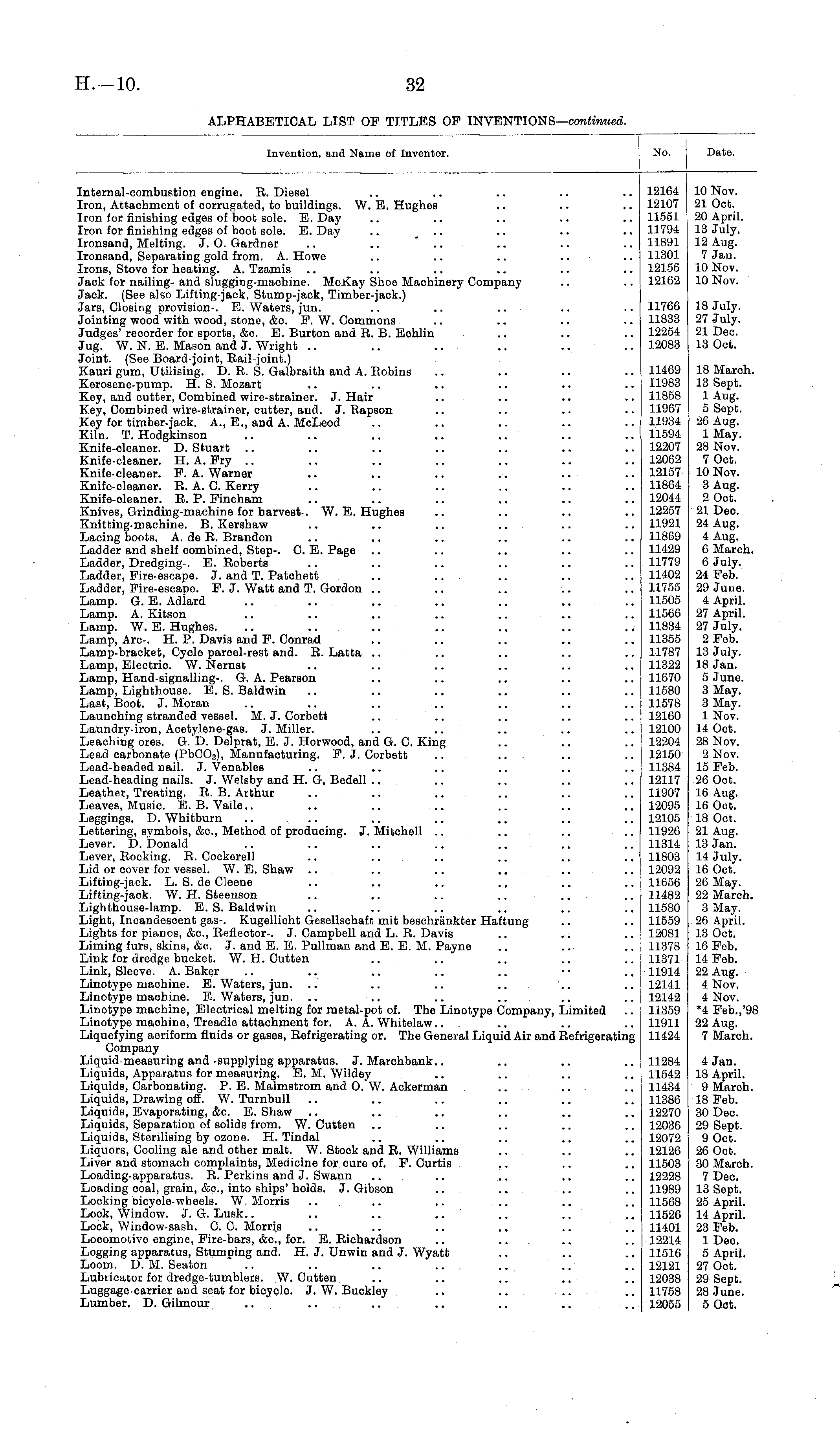 Invention, and Name of Inventor. No. Date. Internal-combustion engine. R. Diesel Iron, Attachment of corrugated, to buildings. W.E.Hughes Iron for finishing edges of boot sole. E.Day Iron for finishing edges of boot sole. E. Day Ironsand, Melting. J.O.Gardner Ironsand, Separating gold from. A. Howe Irons, Stove for heating. A. Tzamis Jack for nailing- and slugging-machine. McKay Shoe Machinery Company Jack. (See also Lifting-jack, Stump-jack, Timber-jack.) Jars, Closing provision-. E. Waters, jun. .. .. .. Jointing wood with wood, stone, &e F. W. Commons Judges' recorder for sports, &e E. Burton and R. B. Eohlin Jug. W. N. E. Mason and J. Wright .. Joint. (See Board-joint, Rail-joint.) Kauri gum, Utilising. D. R. S. Galbraith and A. Robins Kerosene-pump. H. S. Mozart Key, and cutter, Combined wire-strainer. J. Hair Key, Combined wire-strainer, cutter, and. J. Rapson Key for timber-jack. A., E., and A. MoLeod Kiln. T. Hodgkinson Knife-oleaner. D. Stuart Knife-cleaner. H. A. Fry Knife-cleaner. F.A.Warner Knife-oleaner. R. A. C. Kerry Knife-oleaner. R. P. Finoham Knives, Grinding-machine for harvest-. W.E.Hughes Knitting-machine. B. Kershaw Lacing boots. A. de R. Brandon Ladder and shelf combined, Step-. C.E.Page .. Ladder, Dredging-. E. Roberts Ladder, Fire-escape. J. and T. Patchett .. Ladder, Fire-escape. F. J. Watt and T. Gordon Lamp. G. E. Adlard .. ... Lamp. A. Kitson Lamp. W. E. Hughes. Lamp, Arc-. H. P. Davis and F. Conrad Lamp-bracket, Cycle parcel-rest and. R. Latta Lamp, Electrio. W. Nernst Lamp, Hand-signalling-. G. A. Pearson Lamp, Lighthouse. E. S. Baldwin Last, Boot. J. Moran Launching stranded vessel. M. J. Corbett Laundry-iron, Acetylene-gas. J.Miller. Leaching ores. G. D. Delprat, E. J. Horwood, and G. C. King Lead carbonate (PbC0 8 ), Manufacturing. F. J. Corbett .. .. Lead-headed nail. J. Venables Lead-heading nails. J. Welsby and H. G, Bedell .. Leather, Treating. R. B. Arthur ... Leaves, Music. E. B. Vaile.. Leggings. D. Whitburn Lettering, symbols, &e, Method of producing. J. Mitchell .. Lever. D. Donald Lever, Rocking. R. Cockerell Lid or oover for vessel. W.E.Shaw .. Lifting-jack. L. S. de Cleene Lifting-jack. W. H. Steenson Lighthouse-lamp. E.S.Baldwin Light, Inoandescent gas-. Kugellioht Gesellschaft mit besohrankter Haftung Lights for pianos, &e, Reflector-. J. Campbell and L. R. Davis Liming furs, skins, &e J. and E. E. Pullman and E. E. M. Payne Link for dredge bucket. W. H. Cutten Link, Sleeve. A. Baker Linotype maohine. E. Waters, jun. .. .. .. ... Linotype maohine. E. Waters, jun. Linotype maohine, Electrical melting for metal-pot of. The Linotype Company, Limited Linotype machine, Treadle attachment for. A. A. Whitelaw.. Liquefying aeriform fluids or gases, Refrigerating or. The General Liquid Air and Refrigerating Company Liquid-measuring and-supplying apparatus. J. Marchbank.. Liquids, Apparatus for measuring. E. M. Wildey Liquids, Carbonating. P. E. Malmstrom and 0. W. Ackerman .. ... Liquids, Drawing off. W. Turnbull Liquids, Evaporating, &e E. Shaw Liquids, Separation of solids from. W. Cutten Liquids, Sterilising by ozone. H. Tindal Liquors, Cooling ale and other malt. W. Stock and R. Williams Liver and stomach complaints, Medicine for cure of. F. Curtis Loading-apparatus. R. Perkins and J. Swann .. Loading coal, grain, &e, into ships' holds. J. Gibson Locking bicycle-wheels. W.Morris .. .. .. .. Look, Window. J. G. Lusk.. Lock, Window-sash. C. C. Morris Locomotive engine, Fire-bars, &e, for. E.Richardson .. ... Logging apparatus, Stumping and. H. J. Unwin and J. Wyatt Loom. D. M. Seaton .. .. .. ... Lubricator for dredge-tumblers. W. Cutten Luggage-carrier and seat for bicycle. J. W. Buckley .. .. Lumber. D. Gilmour .. .. 12164 12107 11551 11794 11891 11301 12156 12162 11766 11833 12254 12083 11469 11983 11858 11967 11934 11594 12207 12062 12157 11864 12044 12257 11921 11869 11429 11779 11402 11755 11505 11566 11834 11355 11787 11322 11670 11580 11578 12160 12100 12204 12150 11384 12117 11907 12095 12105 11926 11314 11803 12092 11656 11482 11580 11559 12081 11378 11371 11914 12141 12142 11359 11911 11424 10 Nov. 21 Oct. 20 April. 13 July. 12 Aug. 7 Jan. 10 Nov. 10 Nov. 18 July. 27 July. 21 Deo. 13 Oot. 18 Maroh. 13 Sept. 1 Aug. 5 Sept. 26 Aug. 1 May. 28 Nov. 7 Oot. 10 Nov. 3 Aug. 2 Oct. 21 Dec 24 Aug. 4 Aug. 6 March. 6 July. 24 Feb. 29 June. 4 April. 27 April. 27 July. 2 Feb. 13 July. 18 Jan. 5 June. 3 May. 3 May. INov. 14 Oot. 28 Nov. 2 Nov. 15 Feb. 26 Oot. 16 Aug. 16 Oct. 18 Oct. 21 Aug. 13 Jan. 14 July. 16 Oct. 26 May. 22 March. 3 May. 26 April. 13 Oct. 16 Feb. 14 Feb. 22 Aug. 4 Nov. 4 Nov. *4 Feb.,'9H 22 Aug. 7 Maroh. 11284 11542 11434 11386 12270 12036 12072 12126 11503 12228 11989 11568 11526 11401 12214 11516 12121 12038 11758 12055 4 Jan. 18 April. 9 March. 18 Feb. 30 Dec. 29 Sept. 9 Oct. 26 Oct. 30 March. 7 Deo. 13 Sept. 25 April. 14 April. 23 Feb. 1 Dec. 5 April. 27 Oct. 29 Sept. 28 June. 5 Oct.