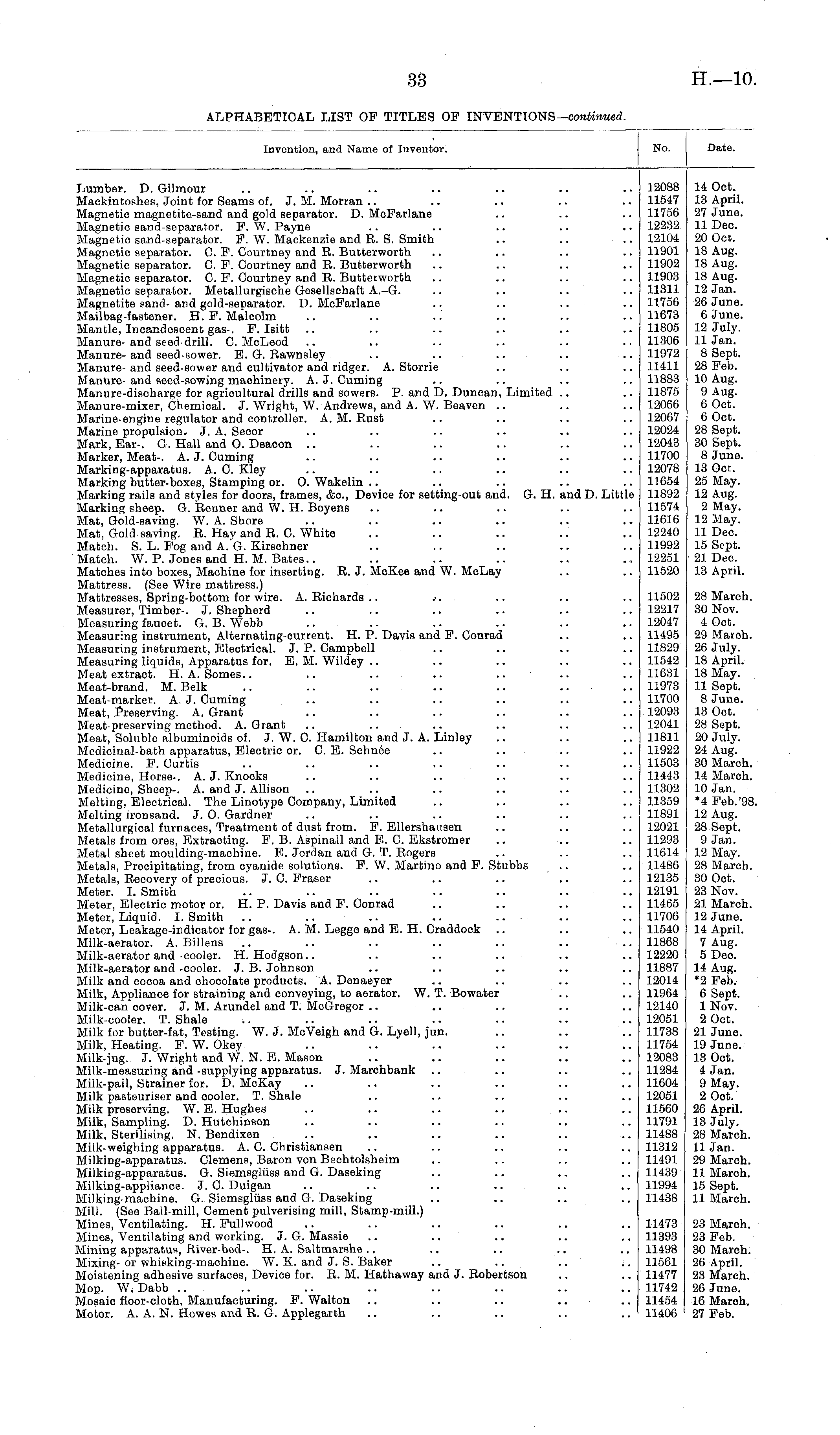 Invention, and Name of Inventor. No. Date. Lumber. D. Gilmour Mackintoshes, Joint for Seams of. J. M. Morran Magnetic magnetite-sand and gold separator. D. McFarlane Magnetic sand-separator. F. W. Payne Magnetic sand-separator. F. W. Mackenzie and R. S. Smith Magnetic separator. C. F. Courtney and R. Butterworth Magnetic separator. C. F. Courtney and R. Butterworth Magnetic separator. C. F. Courtney and R. Butterworth Magnetic separator. Metallurgisohe Gesellschaft A.-G. Magnetite sand- and gold-separator. D. McFarlane Mailbag-fastener. H. F. Malcolm Mantle, Incandescent gas-. F. Isitt Manure-and seed-drill. C. McLeod Manure-and seed-sower. E. G. Rawnsley Manure- and seed-sower and cultivator and ridger. A. Storrie Manure- and seed-sowing machinery. A. J. Cuming Manure-discharge for agricultural drills and sowers. P. and D. Dunoan, Limited Manure-mixer, Chemical. J. Wright, W. Andrews, and A. W. Beaven .. Marine-engine regulator and controller. A. M. Rust Marine propulsion. J. A. Secor Mark, Ear-. G. Hall and 0. Deaoon Marker, Meat-. A. J. Cuming Marking-apparatus. A. C. Kley Marking butter-boxes, Stamping or. 0. Wakelin Marking rails and styles for doors, frames, &e, Device for setting-out and. G. H. and D. Little Marking sheep. G. Renner and W. H. Boyens Mat, Gold-saving. W. A. Shore Mat, Gold-saving. R. Hay and R. G. White Match. S. L. Fog and A. G. Kirschner Match. W. P. Jones and H. M. Bates.. Matches into boxes, Machine for inserting. R. J. McKee and W. McLay Mattress. (See Wire mattress.) Mattresses, Spring-bottom for wire. A.Richards.. Measurer, Timber-. J. Shepherd Measuring faucet. G. B. Webb Measuring instrument, Alternating-current. H. P. Davis and F. Conrad Measuring instrument, Electrical. J.P.Campbell Measuring liquids, Apparatus for. E. M. Wildey Meat extract. H. A. Somes.. .. .. .. .. Meat-brand. M. Belk Meat-marker. A. J. Cuming ... Meat, Preserving. A. Grant Meat-preserving method. A.Grant Meat, Soluble albuminoids of. J. W. C. Hamilton and J. A. Linley Medicinal-bath apparatus, Electrio or. G. E. Sohnee Medicine. F. Curtis Medicine, Horse-. A. J. Knocks Medicine, Sheep-. A. and J. Allison Melting, Electrical. The Linotype Company, Limited Melting ironsand. J. O. Gardner Metallurgical furnaces, Treatment of dust from. F. Ellershausen Metals from ores, Extracting. F. B. Aspinall and E. C. Ekstromer Metal sheet moulding-machine. E. Jordan and G. T. Rogers Metals, Precipitating, from cyanide solutions. F. W. Martino and F. Stubbs Metals, Recovery of precious. J. C. Fraser Meter. I. Smith Meter, Electric motor or. H. P. Davis and F. Conrad Meter, Liquid. I.Smith Meter, Leakage-indicator for gas-. A. M. Legge and E. H. Craddock Milk-aerator. A. Billens Milk-aerator and -cooler. H. Hodgson... Milk-aerator and -cooler. J. B. Johnson Milk and cocoa and chocolate products. A. Denaeyer Milk, Appliance for straining and conveying, to aerator. W. T. Bowater Milk-can cover. J. M. Arundel and T. McGregor Milk-cooler. T. Shale Milk for butter-fat, Testing. W. J. McVeigh and G. Lyell, jun. Milk, Heating. F. W. Okey Milk-jug. J. Wright and W. N. E. Mason Milk-measuring and -supplying apparatus. J. Marohbank Milk-pail, Strainer for. D. McKay Milk pasteuriser and cooler. T. Shale Milk preserving. W.E.Hughes Milk, Sampling. D.Hutchinson Milk, Sterilising. N. Bendixen Milk-weighing apparatus. A. C. Christiansen Milking-apparatus. Clemens, Baron von Bechtolsheim Milking-apparatus. G. Siemsgluss and G. Daseking Milking-appliance. J. C. Duigan Milking-machine. G. Siemsgluss and G. Daseking Mill. (See Ball-mill, Cement pulverising mill, Stamp-mill.) Mines, Ventilating. H. Fullwood Mines, Ventilating and working. J. G. Massie Mining apparatus, River-bed-. H. A. Saltmarshe .. Mixing- or whisking-machine. W. K. and J. S. Baker .. .. Moistening adhesive surfaces, Device for. R. M. Hathaway and J. Robertson Mop. W. Dabb Mosaic floor-oloth, Manufacturing. F. Walton Motor. A. A. N. Howes and R. G. Applegarth 12088 11547 11756 12232 12104 11901 11902 11903 11311 11756 11673 11805 11306 11972 11411 11883 11875 12066 12067 12024 12043 11700 12078 11654 11892 11574 11616 12240 11992 12251 11520 11502 12217 12047 11495 11829 11542 11631 11973 11700 12093 12041 11811 11922 11503 11443 11302 11359 11891 12021 11293 11614 11486 12135 12191 11465 11706 11540 11868 12220 11887 12014 11964 12140 12051 11738 11754 12083 11284 11604 12051 11560 11791 11488 11312 11491 11439 11994 11438 14 Oot. 13 April. 27 June. 11 Dee 20 Oct. 18 Aug. 18 Aug. 18 Aug. 12 Jan. 26 June. 6 June. 12 July. 11 Jan. 8 Sept. 28 Feb. 10 Aug. 9 Aug. 6 Oot. 6 Oct. 28 Sept. 30 Sept. 8 June. 13 Oot. 25 May. 12 Aug. 2 May. 12 May. 11 Dec. 15 Sept. 21 Dec. 13 April. 28 March. 30 Nov. 4 Oct. 29 March. 26 July. 18 April. 18 May. 11 Sept. 8 June. 13 Oot. 28 Sept. 20 July. 24 Aug. 30 March. 14 March. 10 Jan. *4 Feb.'98 12 Aug. 28 Sept. 9 Jan. 12 May. 28 March. 30 Oct. 23 Nov. 21 March. 12 June. 14 April. 7 Aug. 5 Dec. 14 Aug. *2 Feb. 6 Sept. INov. 2 Oot. 21 June. 19 June. 13 Oot. 4 Jan. 9 May. 2 Oot. 26 April. 13 July. 28 Maroh. 11 Jan. 29 March. 11 March. 15 Sept. 11 March. 11473 11393 11498 11561 11477 11742 11454 11406 23 Maroh. 23 Feb. 30 March. 26 April. 23 March. 26 June. 16 March. 27 Feb.