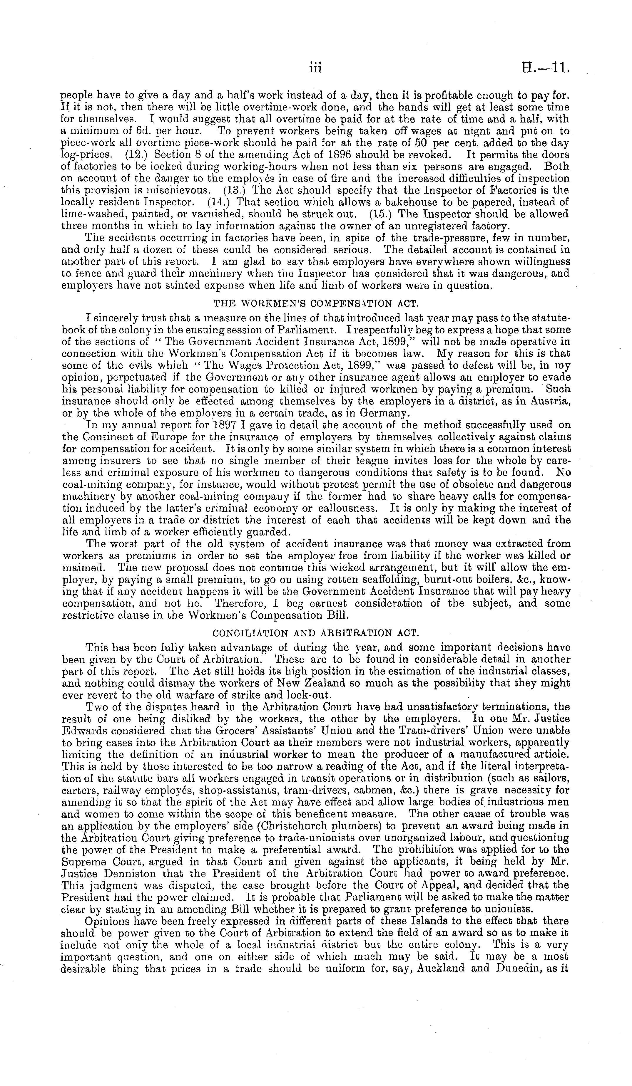 people have to give a day and a half's work instead of a day, then it is profitable enough to pay for. If it is not, then there will be little overtime-work done, and the hands will get at least some time for themselves. I would suggest that all overtime be paid for at the rate of time and a half, with a minimum of 6d. per hour. To prevent workers being taken off wages at nignt and put on to piece-work all overtime piece-work should be paid for at the rate of 50 per cent, added to the day log-prices. (12.) Section Bof the amending Act of 1896 should be revoked. It permits the doors of factories to be locked during working-hours when not less than six persons are engaged. Both on account of the danger to the employes in case of fire and the increased difficulties of inspection this provision is mischievous. (13.) The Act should specify that the Inspector of Factories is the locally resident Inspector. (14.) That section which allows a bakehouse to be papered, instead of lime-washed, painted, or varnished, should be struck out. (15.) The Inspector should be allowed three months in which to lay information against the owner of an unregistered factory. The accidents occurring in factories have been, in spite of the trade-pressure, few in number, and only half a dozen of these could be considered serious. The detailed account is contained in another part of this report. I am glad to say that employers have everywhere shown willingness to fence and guard their machinery when the Inspector has considered that it was dangerous, and employers have not stinted expense when life and limb of workers were in question. THE WORKMEN'S COMPENSATION ACT. I sincerely trust that a measure on the lines of that introduced last year may pass to the statutebook of the colony in the ensuing session of Parliament. I respectfully beg to express a hope that some of the sections of " The Government Accident Insurance Act, 1899," will not be made operative in connection with the Workmen's Compensation Act if it becomes law. My reason for this is that some of the evils which " The Wages Protection Act, 1899," was passed to defeat will be, in my opinion, perpetuated if the Government or any other insurance agent allows an employer to evade his personal liability for compensation to killed or injured workmen by paying a premium. Such insurance should only be effected among themselves by the employers in a district, as in Austria, or by the whole of the employers in a certain trade, as in Germany. In my annual report for 1897 I gave in detail the account of the method successfully used on the Continent of Europe for the insurance of employers by themselves collectively against claims for compensation for accident. It is only by some similar system in which there is a common interest among insurers to see that no single member of their league invites loss for the whole by careless and criminal exposure of his workmen to dangerous conditions that safety is to be found. No coal-mining company, for instance, would without protest permit the use of obsolete and dangerous machinery by another coal-mining company if the former had to share heavy calls for compensation induced by the latter's criminal economy or callousness. It is only by making the interest of all employers in a trade or district the interest of each that accidents will be kept down and the life and limb of a worker efficiently guarded. The worst part of the old system of accident insurance was that money was extracted from workers as premiums in order to set the employer free from liability if the worker was killed or maimed. The new proposal does not continue this wicked arrangement, but it will allow the employer, by paying a small premium, to go on using rotten scaffolding, burnt-out boilers, &c, knowing that if any accident happens it will be the Government Accident Insurance that will pay heavy compensation, and not he. Therefore, I beg earnest consideration of the subject, and some restrictive clause in the Workmen's Compensation Bill. CONCILIATION AND ARBITRATION ACT. This has been fully taken advantage of during the year, and some important decisions have been given by the Court of Arbitration. These are to be found in considerable detail in another part of this report. The Act still holds its high position in the estimation of the industrial classes, and nothing could dismay the workers of New Zealand so much as the possibility that they might ever revert to the old warfare of strike and lock-out. Two of the disputes heard in the Arbitration Court have had unsatisfactory terminations, the result of one being disliked by the workers, the other by the employers. In one Mr. Justice Edwards considered that the Grocers' Assistants' Union and the Tram-drivers' Union were unable to bring cases into the Arbitration Court as their members were not industrial workers, apparently limiting the definition of an industrial worker to mean the producer of a manufactured article. This is held by those interested to be too narrow a reading of the Act, and if the literal interpretation of the statute bars all workers engaged in transit operations or in distribution (such as sailors, carters, railway employes, shop-assistants, tram-drivers, cabmen, &c.) there is grave necessity for amending it so that the spirit of the Act may have effect and allow large bodies of industrious men and women to come within the scope of this beneficent measure. The other cause of trouble was an application by the employers' side (Christchurch plumbers) to prevent an award being made in the Arbitration Court giving preference to trade-unionists over unorganized labour, and questioning the power of the President to make a preferential award. The prohibition was applied for to the Supreme Court, argued in that Court and given against the applicants, it being held by Mr. Justice Denniston that the President of the Arbitration Court had power to award preference. This judgment was disputed, the 