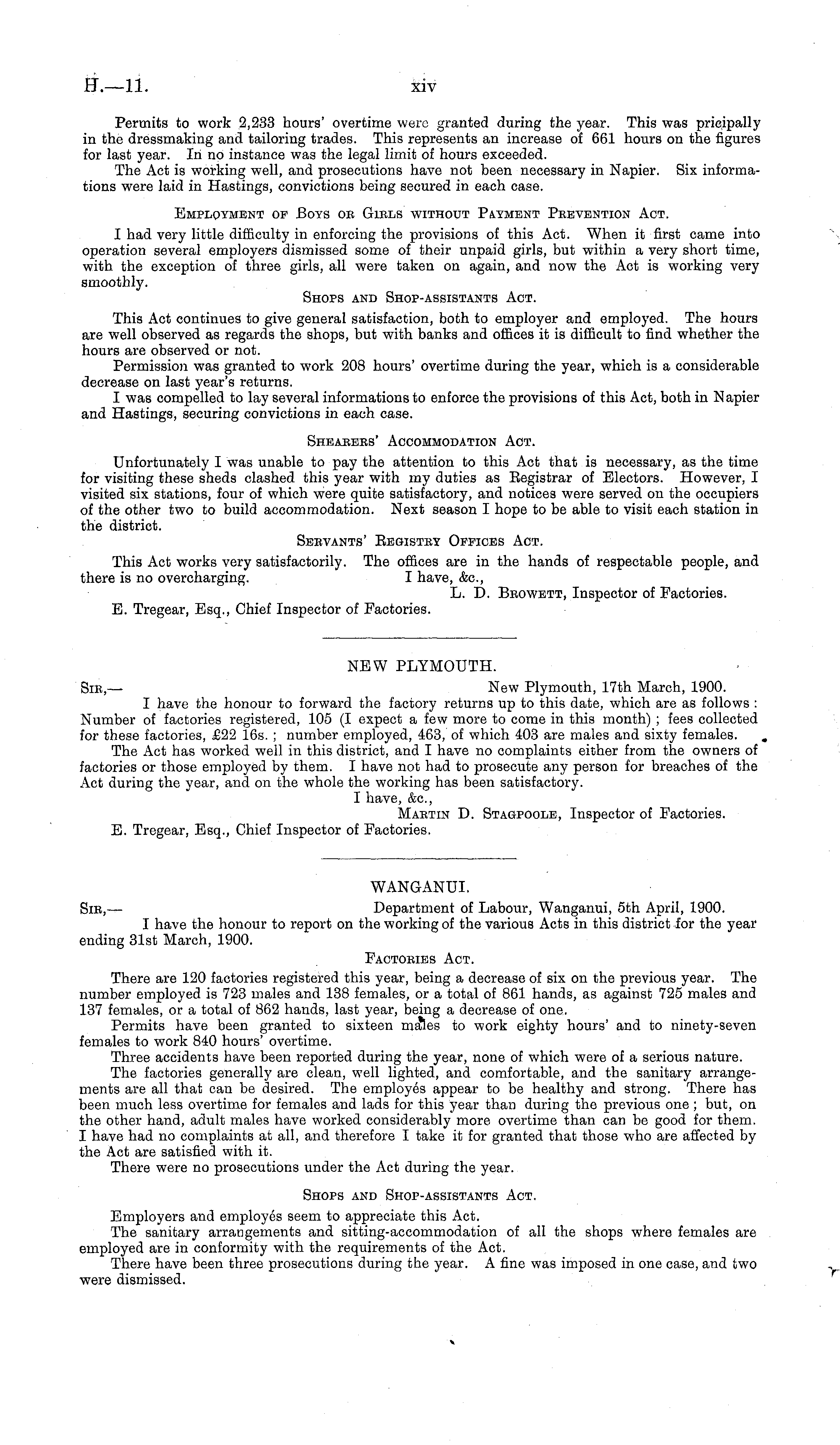 WANGANUI. Sir, — Department of Labour, Wanganui, sth April, 1900. I have the honour to report on the working of the various Acts in this district for the year ending 31st March, 1900. Factories Act. There are 120 factories registered this year, being a decrease of six on the previous year. The number employed is 723 males and 138 females, or a total of 861 hands, as against 725 males and 137 females, or a total of 862 hands, last year, being a decrease of one. Permits have been granted to sixteen males to work eighty hours' and to ninety-seven females to work 840 hours' overtime. Three accidents have been reported during the year, none of which were of a serious nature. The factories generally are clean, well lighted, and comfortable, and the sanitary arrangements are all that can be desired. The employes appear to be healthy and strong. There has been much less overtime for females and lads for this year than during the previous one ; but, on the other hand, adult males have worked considerably more overtime than can be good for them. I have had no complaints at all, and therefore I take it for granted that those who are affected by the Act are satisfied with it. There were no prosecutions under the Act during the year. Shops and Shop-assistants Act. Employers and employes seem to appreciate this Act. The sanitary arrangements and sitting-accommodation of all the shops where females are employed are in conformity with the requirements of the Act. There have been three prosecutions during the year. A fine was imposed in one case, and two were dismissed.