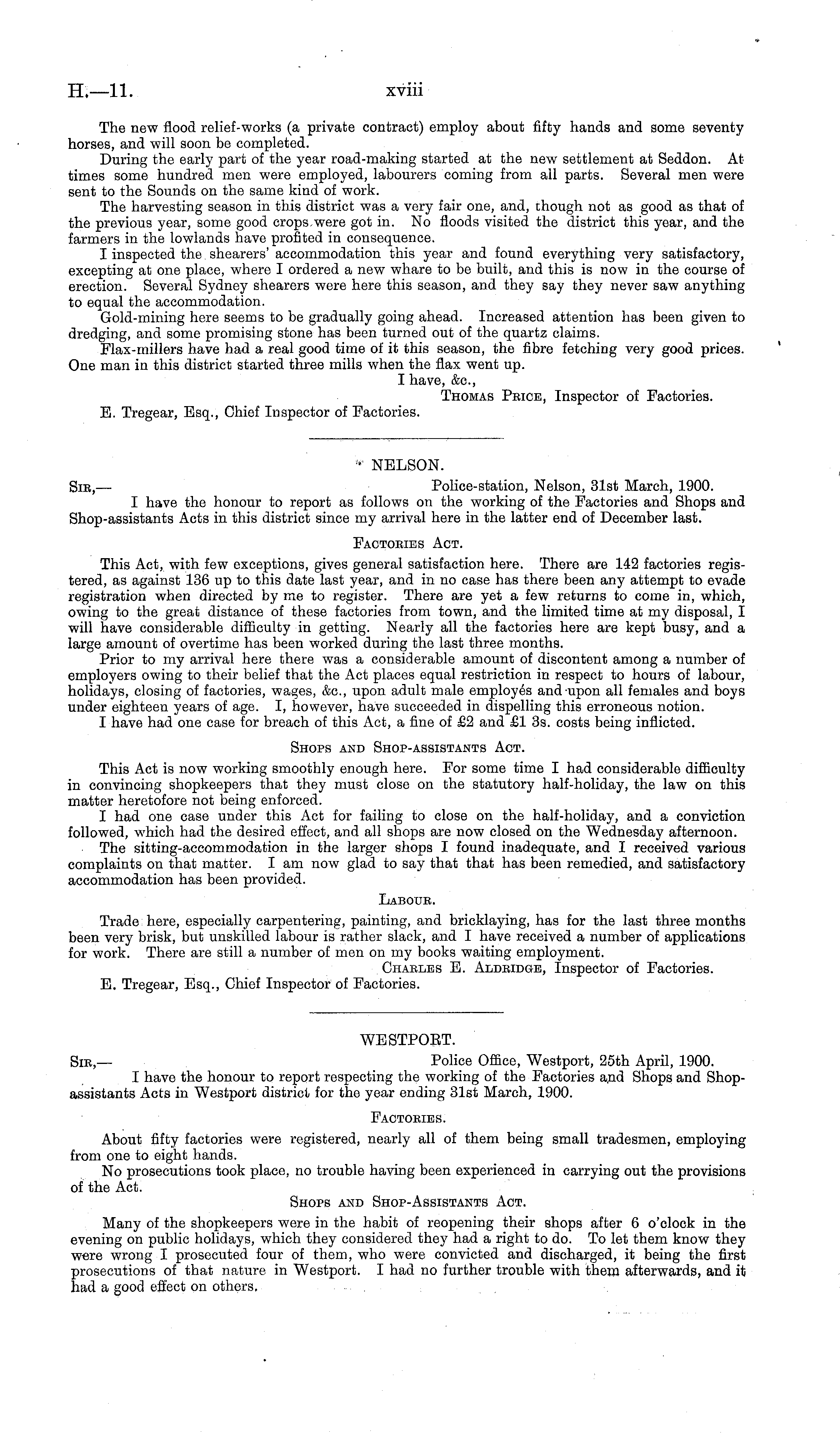 NELSON. Sir, — Police-station, Nelson, 31st March, 1900. I have the honour to report as follows on the working of the Factories and Shops and Shop-assistants Acts in this district since my arrival here in the latter end of December last. Factories Act. This Act, with few exceptions, gives general satisfaction here. There are 142 factories registered, as against 136 up to this date last year, and in no case has there been any attempt to evade registration when directed by me to register. There are yet a few returns to come in, which, owing to the great distance of these factories from town, and the limited time at my disposal, I will have considerable difficulty in getting. Nearly all the factories here are kept busy, and a large amount of overtime has been worked during the last three months. Prior to my arrival here there was a considerable amount of discontent among a number of employers owing to their belief that the Act places equal restriction in respect to hours of labour, holidays, closing of factories, wages, &c, upon adult male employes and upon all females and boys under eighteen years of age. I, however, have succeeded in dispelling this erroneous notion. I have had one case for breach of this Act, a fine of £2 and £1 3s. costs being inflicted. Shops and Shop-assistants Act. This Act is now working smoothly enough here. For some time I had considerable difficulty in convincing shopkeepers that they must close on the statutory half-holiday, the law on this matter heretofore not being enforced. I had one case under this Act for failing to close on the half-holiday, and a conviction followed, which had the desired effect, and all shops are now closed on the Wednesday afternoon. The sitting-accommodation in the larger shops I found inadequate, and I received various complaints on that matter. I am now glad to say that that has been remedied, and satisfactory accommodation has been provided. Labour. Trade here, especially carpentering, painting, and bricklaying, has for the last three months been very brisk, but unskilled labour is rather slack, and I have received a number of applications for work. There are still a number of men on my books waiting employment. Charles E. Aldridgb, Inspector of Factories. E. Tregear, Esq., Chief Inspector of Factories.