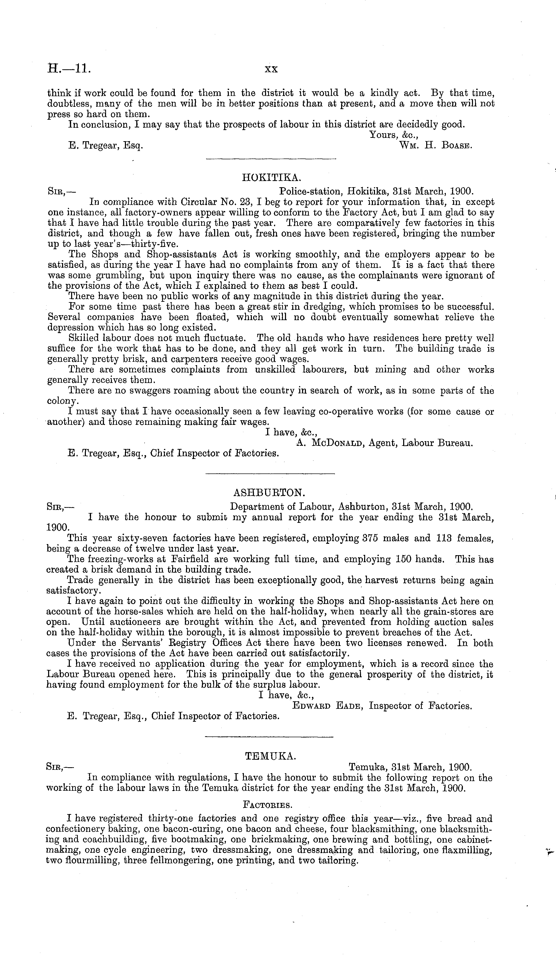 ASHBURTON. Sir, — Department of Labour, Ashburton, 31st March, 1900. I have the honour to submit my annual report for the year ending the 31st March, 1900. This year sixty-seven factories have been registered, employing 375 males and 113 females, being a decrease of twelve under last year. The freezing-works at Fairfield are working full time, and employing 150 hands. This has created a brisk demand in the building trade. Trade generally in the district has been exceptionally good, the harvest returns being again satisfactory. I have again to point out the difficulty in working the Shops and Shop-assistants Act here on account of the horse-sales which are held on the half-holiday, when nearly all the grain-stores are open. Until auctioneers are brought within the Act, and prevented from holding auction sales on the half-holiday within the borough, it is almost impossible to prevent breaches of the Act. Under the Servants' Registry Offices Act there have been two licenses renewed. In both cases the provisions of the Act have been carried out satisfactorily. I have received no application during the year for employment, which is a record since the Labour Bureau opened here. This is principally due to the general prosperity of the district, it having found employment for the bulk of the surplus labour. I have, &c, Edward Eadb, Inspector of Factories. E. Tregear, Esq., Chief Inspector of Factories.