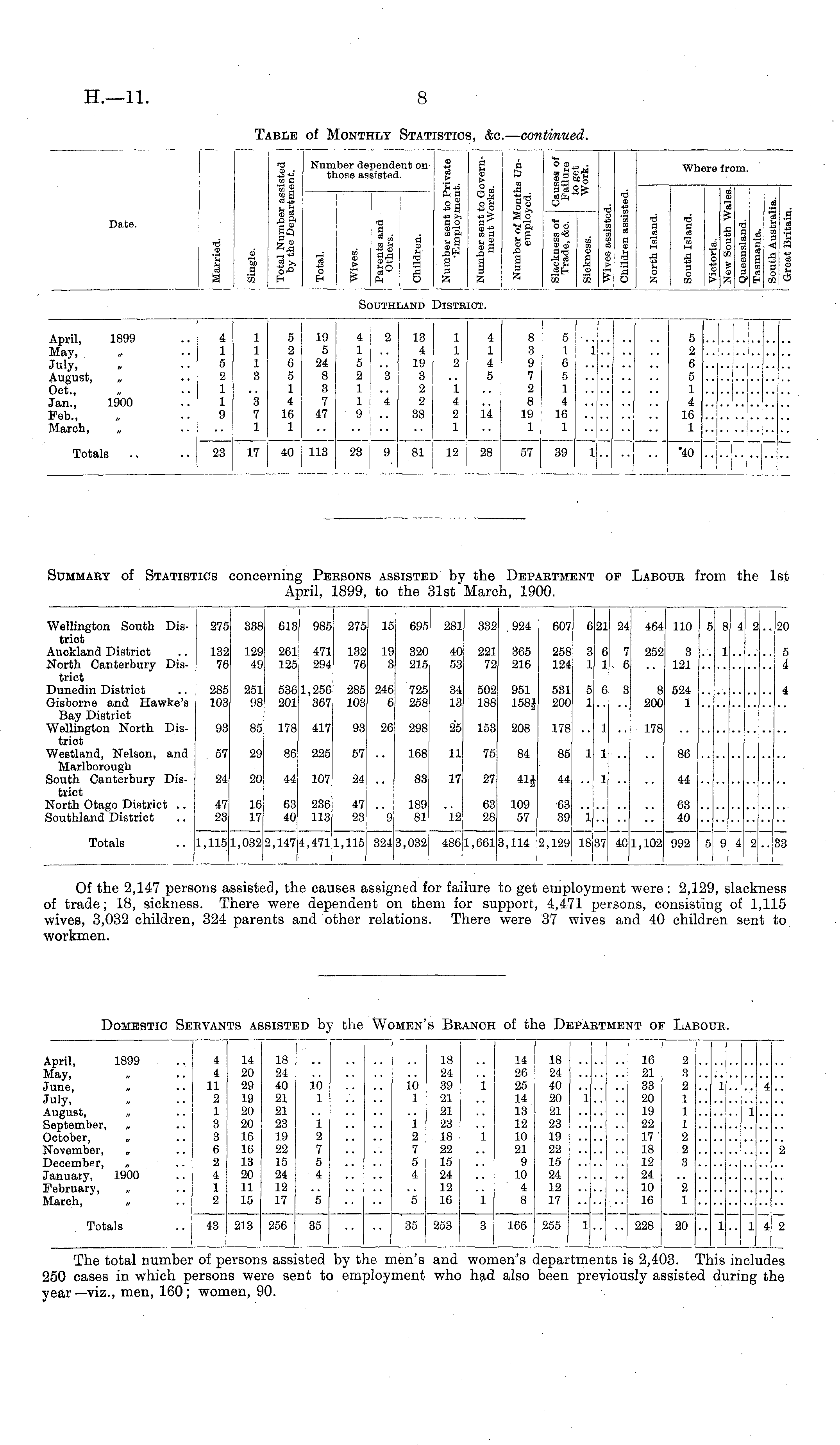Summary of Statistics concerning Persons assisted by the Department of Labour from the 1st April, 1899, to the 31st March, 1900.