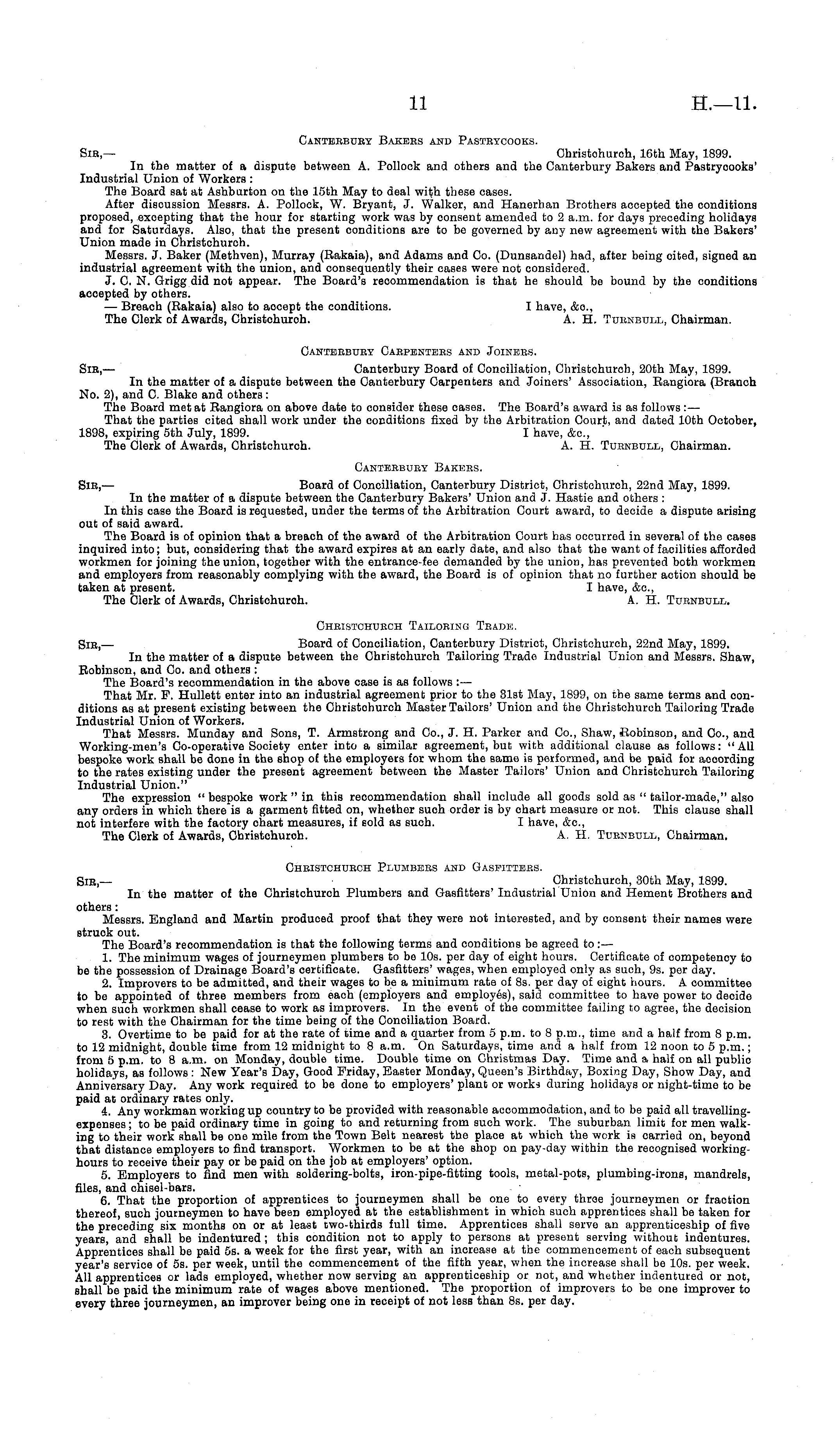 Canterbury Bakers and Pastrycooks. Sir,— Christchurch, 16th May, 1899. In the matter of a dispute between A. Pollock and others and the Canterbury Bakers and Pastrycooks' Industrial Union of Workers : The Board sat at Ashburton on the 15th May to deal with these cases. After discussion Messrs. A. Pollock, W. Bryant, J. Walker, and Hanerhan Brothers accepted the conditions proposed, excepting that the hour for starting work was by consent amended to 2 a.m. for days preceding holidays and for Saturdays. Also, that the present conditions are to be governed by any new agreement with the Bakers' Union made in Christchuroh. Messrs. J. Baker (Methven), Murray (Rakaia), and Adams and Co. (Dunsandel) had, after being oited, signed an industrial agreement with the union, and consequently their cases were not considered. J. C. N. Grigg did not appear. The Board's recommendation is that he should be bound by the conditions accepted by others. — Breach (Bakaia) also to accept the conditions. I have, &c, The Clerk of Awards, Christchuroh. A. H. Turnbull, Chairman. Canterbury Carpenters and Joiners. Sir, — Canterbury Board of Conciliation, Christohurch, 20th May, 1899. In the matter of a dispute between the Canterbury Carpenters and Joiners' Association, Rangiora (Branch No. 2), and C. Blake and others: The Board met at Rangiora on above date to consider these cases. The Board's award is as follows : — That the parties cited shall work under the conditions fixed by the Arbitration Court, and dated 10th October, 1898, expiring sth July, 1899. I have, &c, The Clerk of Awards, Christchuroh. A. H. Turnbull, Chairman. Canterbury Bakers. Sir, — Board of Conciliation, Canterbury District, Christchurch, 22nd May, 1899. In the matter of a dispute between the Canterbury Bakers' Union and J. Hastie and others : In this case the Board is requested, under the terms of the Arbitration Court award, to decide a dispute arising out of said award. The Board is of opinion that a breach of the award of the Arbitration Court has occurred in several of the cases inquired into; but, considering that the award expires at an early date, and also that the want of facilities afforded workmen for joining the union, together with the entrance-fee demanded by the union, has prevented both workmen and employers from reasonably complying with the award, the Board is of opinion that no further action should be taken at present. I have, &c, The Clerk of Awards, Christchurch. A. H. Turnbull. Christchurch Tailoring Trade. Sir, — Board of Conciliation, Canterbury District, Christchurch, 22nd May, 1899. In the matter of a dispute between the Christohurch Tailoring Trade Industrial Union and Messrs. Shaw, Robinson, and Co. and others : The Board's recommendation in the above case is as follows :— That Mr. P. Hullett enter into an industrial agreement prior to the 31st May, 1899, on the same terms and conditions as at present existing between the Christohurch Master Tailors' Union and the Christchurch Tailoring Trade Industrial Union of Workers. That Messrs. Munday and Sons, T. Armstrong and Co., J. H. Parker and Co., Shaw, Robinson, and Co., and Working-men's Co-operative Society enter into a similar agreement, but with additional clause as follows: "All bespoke work shall be done in the shop of the employers for whom the same is performed, and be paid for according to the rates existing under the present agreement between the Master Tailors' Union and Christchurch Tailoring Industrial Union." The expression " bespoke work " in this recommendation shall include all goods sold as " tailor-made," also any orders in which there is a garment fitted on, whether such order is by chart measure or not. This clause shall not interfere with the factory chart measures, if sold as such. I have, &c, The Clerk of Awards, Christchuroh. A. H. Turnbull, Chairman. Christchurch Plumbers and Gasfitters. Sir,— Christchurch, 30th May, 1899. In the matter of the Chrißtchurch Plumbers and Gasfitters' Industrial Union and Hement Brothers and others: Messrs. England and Martin produced proof that they were not interested, and by consent their names were struok out. The Board's recommendation is that the following terms and conditions be agreed to: — 1. The minimum wages of journeymen plumbers to bo 10s. per day of eight hours. Certificate of competency to be the possession of Drainage Board's certificate. Gasfitters' wages, when employed only as such, 9s. per day. 2. Improvers to be admitted, and their wages to be a minimum rate of Bs. per day of eight hoars. A committee to be appointed of three members from each (employers and employes), said committee to have power to decide when such workmen shall cease to work as improvers. In the event of the committee failing to agree, the decision to rest with the Chairman for the time being of the Conciliation Board. 3. Overtime to be paid for at the rate of time and a quarter from 5 p.m. to 8 p.m., time and a half from 8 p.m. to 12 midnight, double time from 12 midnight to 8 a.m. On Saturdays, time and a half from 12 noon to 5 p.m.; from 5 p.m. to 8 a.m. on Monday, double time. Double time on Christmas Day. Time and a half on all public holidays, as follows : New Year's Day, Good Friday, Easter Monday, Queen's Birthday, Boxing Day, Show Day, and Anniversary Day. Any work required to be done to employers' plant or works during holidays or night-time to be paid at ordinary rates only. 4. Any workman working up country to be provided with reasonable accommodation, and to be paid all travellingexpenses ;to be paid ordinary time in going to and returning from such work. The suburban limit for men walking to their work shall be one mile from the Town Belt nearest the place at which the work is carried on, beyond that distance employers to find transport. Workmen to be at the shop on pay-day within the recognised workinghours to reoeive their pay or be paid on the job at employers' option. 5. Employers to find m