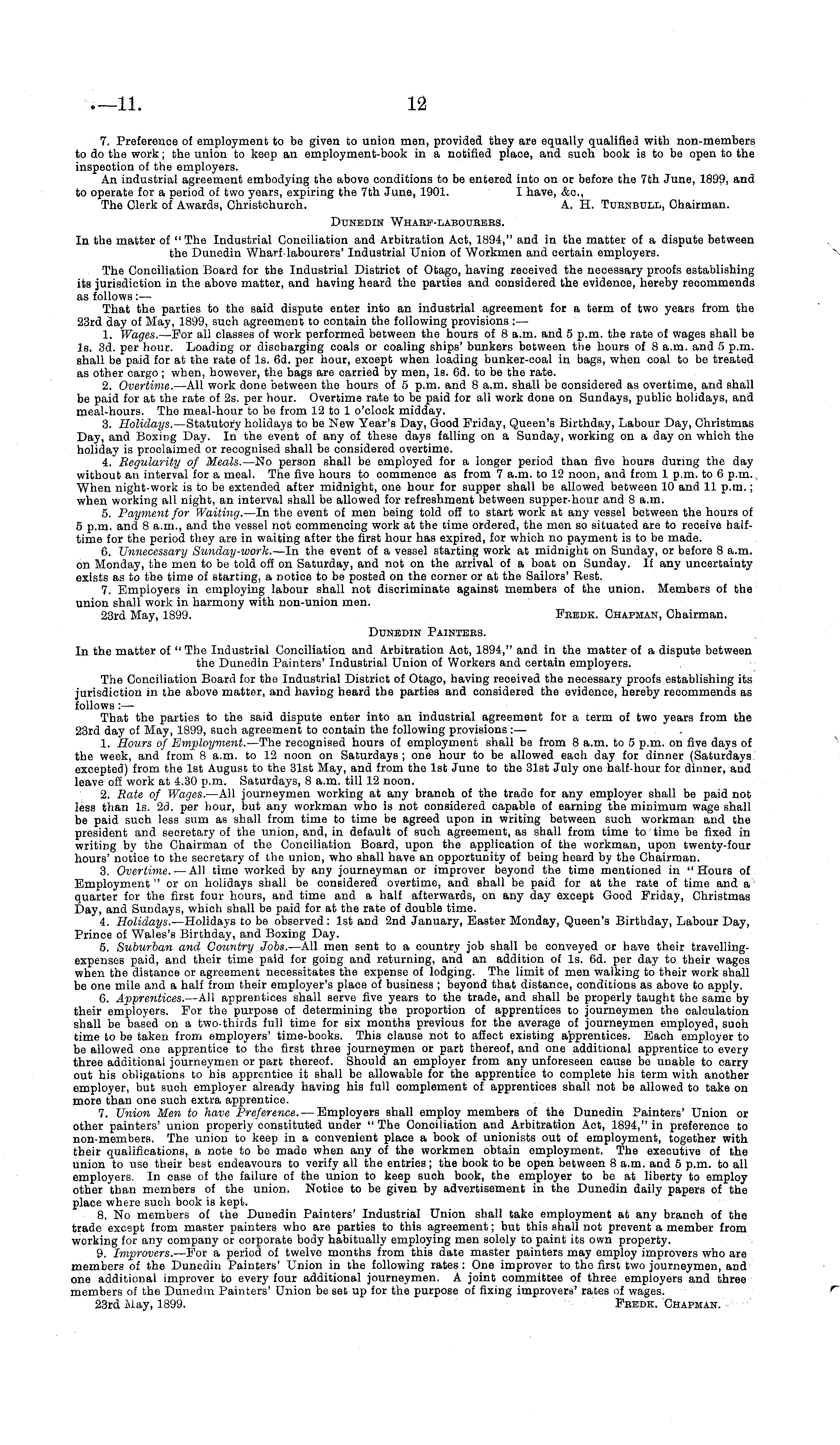7. Preference of employment to be given to union men, provided they are equally qualified with non-members to do the work; the union to keep an employment-book in a notified plaoe, and such book is to be open to the inspection of the employers. An industrial agreement embodying the above conditions to be entered into on or before the 7th June, 1899, and to operate for a period of two years, expiring the 7th June, 1901. I have, &c, The Clerk of Awards, Christchurch. A. H. Turnbull, Chairman. Dunedin Wharf-labourers. In the matter of " The Industrial Conciliation and Arbitration Act, 1894," and in the matter of a dispute between the Dunedin Wharf-labourers' Industrial Union of Workmen and certain employers. The Conciliation Board for the Industrial District of Otago, having received the necessary proofs establishing its jurisdiction in the above matter, and having heard the parties and considered the evidence, hereby recommends as follows:— That the parties to the said dispute enter into an industrial agreement for a term of two years from the 23rd day of May, 1899, such agreement to contain the following provisions : — 1. Wages. —For all classes of work performed between the hours of 8 a.m. and 5 p.m. the rate of wages shall be Is. 3d. per hour. Loading or discharging coals or coaling ships' bunkers between the hours of 8 a.m. and 5 p.m. shall be paid for at the rate of Is. 6d. per hour, except when loading bunker-coal in bags, when coal to be treated as other cargo; when, however, the bags are carried by men, Is. 6d. to be the rate. 2. Overtime. —All work done between the hours of 5 p.m. and 8 a.m. shall be considered as overtime, and shall be paid for at the rate of 2s. per hour. Overtime rate to be paid for all work done on Sundays, public holidays, and meal-hours. The meal-hour to be from 12 to 1 o'clock midday. 3. Holidays. —Statutory holidays to be New Year's Day, Good Friday, Queen's Birthday, Labour Day, Christmas Day, and Boxing Day. In the event of any of these days falling on a Sunday, working on a day on which the holiday is proclaimed or recognised shall be considered overtime. 4. Regularity of Meals. —No person shall be employed for a longer period than five hours during the day without au interval for a meal. The five hours to commence as from 7 a.m. to 12 noon, and from 1 p.m. to 6 p.m. When night-work is to be extended after midnight, one hour for supper shall be allowed between 10 and 11 p.m.; when working all night, an interval shall be allowed for refreshment between supper-hour and 8 a.m. 5. Payment for Waiting. —ln the event of men being told off to start work at any vessel between the hours of 5 p.m. and 8 a.m., and the vessel not commencing work at the time ordered, the men so situated are to receive halftime for the period they are in waiting after the first hour has expired, for which no payment is to be made. 6. Unnecessary Sunday-work. —ln the event of a vessel starting work at midnight on Sunday, or before 8 a.m. on Monday, the men to be told off on Saturday, and not on the arrival of a boat on Sunday. If any uncertainty exists as to the time of starting, a notice to be posted on the corner or at the Sailors' Rest. 7. Employers in employing labour shall not discriminate against members of the union. Members of the union shall work in harmony with non-union men. 23rd May, 1899. Fredk. Chapman, Chairman. Dunedin Painters. In the matter of " The Industrial Conciliation and Arbitration Act, 1894," and in the matter of a dispute between the Dunedin Painters' Industrial Union of Workers and certain employers. The Conciliation Board for the Industrial District of Otago, having reoeived the necessary proofs establishing its jurisdiction in the above matter, and having heard the parties and considered the evidence, hereby recommends as follows: — That the parties to the said dispute enter into an industrial agreement for a term of two years from the 23rd day of May, 1899, such agreement to contain the following provisions:— 1. Hours of Employment. —The recognised hours of employment shall be from 8 a.m. to 5 p.m. on five days of the week, and from 8 a.m. to 12 noon on Saturdays ; one hour to be allowed each day for dinner (Saturdays excepted) from the Ist August to the 31st May, and from the Ist June to the 31st July one half-hour for dinner, and leave off work at 4.30 p.m. Saturdays, 8 a.m. till 12 noon. 2. Rate of Wages. —All journeymen working at any branoh of the trade for any employer shall be paid not less than Is. 2d. per hour, but any workman who is not considered capable of earning the minimum wage shall be paid such less sum as shall from time to time be agreed upon in writing between such workman and the president and secretary of the union, and, in default of such agreement, as shall from time to time be fixed in writing by the Chairman of the Conciliation Board, upon the application of the workman, upon twenty-four hours' notice to the secretary of the union, who shall have an opportunity of being heard by the Chairman. 3. Overtime. — All time worked by any journeyman or improver beyond the time mentioned in "Hours of Employment " or on holidays shall be considered overtime, and shall be paid for at the rate of time and a quarter for the first four hours, and time and a half afterwards, on any day except Good Friday, Christmas Day, and Sundays, which shall be paid for at the rate of double time. 4. Holidays. —Holidays to be observed: Ist and 2nd January, Easter Monday, Queen's Birthday, Labour Day, Prince of Wales's Birthday, and Boxing Day. 5. Suburban and Country Jobs. —All men sent to a country job shall be conveyed or have their travellingexpenses paid, and their time paid for going and returning, and an addition of Is. 6d. per day to their wages when the distance or agreement necessitates the expense of lodging. The limit of men walking to their work shall be one mile and a half from their employer's place of business ; b