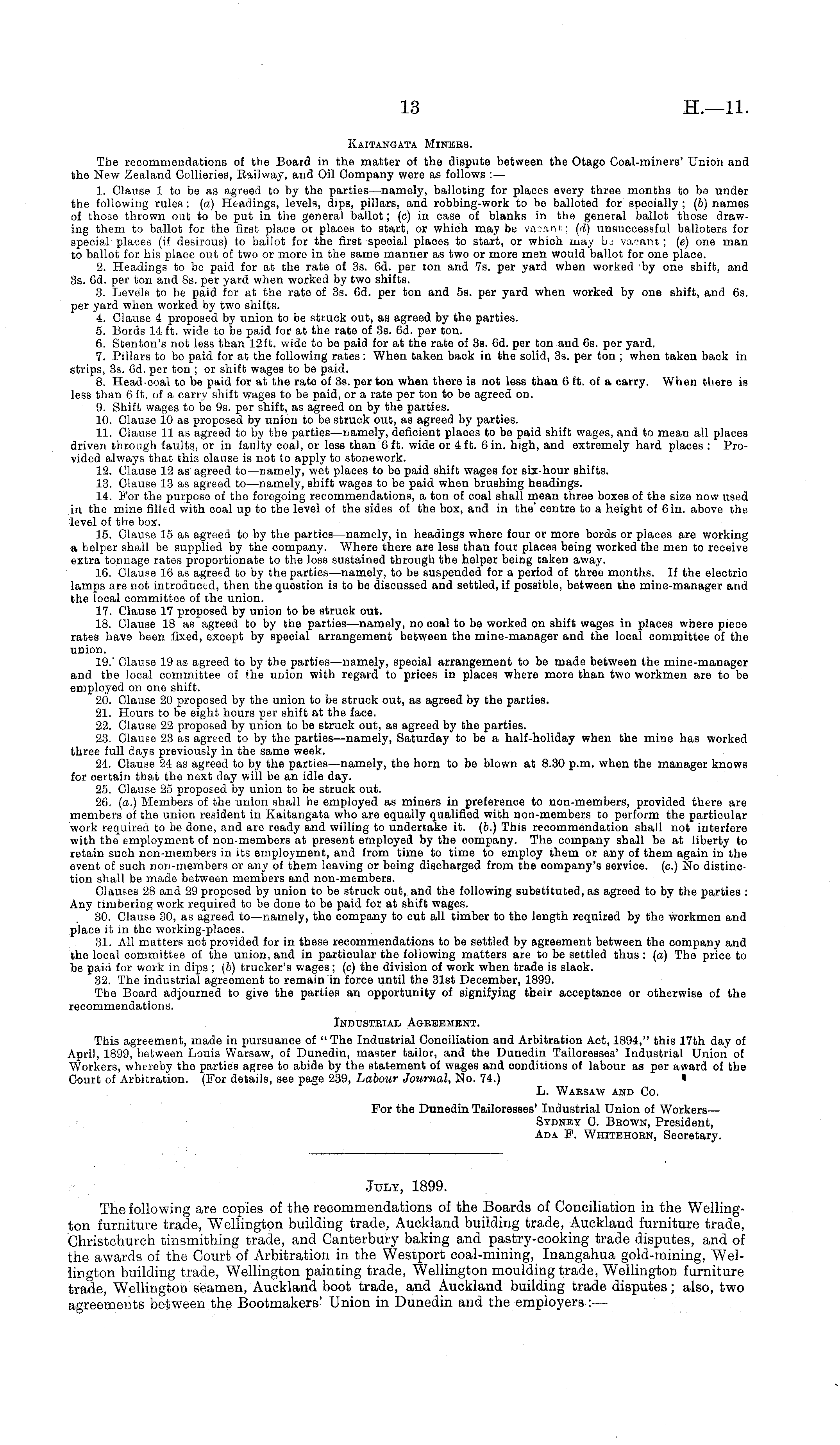 Kaitangata Miners. The recommendations of the Board in the matter of the dispute between the Otago Coal-miners' Union and the New Zealand Collieries, Railway, and Oil Company were as follows :— 1. Clause 1 to be as agreed to by the parties—namely, balloting for places every three months to bo under the following rules : (a) Headings, levels, dips, pillars, and robbing-work to be balloted for specially ; (6) names of tho3e thrown out to be put in the general ballot; (c) in case of blanks in the general ballot those drawing them to ballot for the first place or places to start, or which may be vaoan*; (d) unsuccessful balloters for special places (if desirous) to ballot for the first special places to start, or which may b_ vacant; (c) one man to ballot for his place out of two or more in the same manner as two or more men would ballot for one place. 2. Headings to ba paid for at the rate of 3s. 6d. per ton and 7s. per yard when worked by one shift, and 3s. 6d. per ton and Bs. per yard when worked by two shifts. 3. Levels to be paid for at the rate of 3s. 6d. per ton and ss. per yard when worked by one shift, and 6s. per yard when worked by two shifts. 4. Clause 4 proposed by union to be struck out, as agreed by the parties. 5. Bords 14 ft. wide to be paid for at the rate of 3s. 6d. per ton. 6. Stenton's not less than 12 ft. wide to be paid for at the rate of 3s. 6d. per ton and 6s. per yard. 7. Pillars to be paid for at the following rates : When taken back in the solid, 3s. per ton ; when taken back in strips, 3s. 6d. per ton ; or shift wages to be paid. 8. Head-coal to be paid for at the rate of 3s. per ton when there is not less than 6 ft. of a carry. When there is less than 6 ft. of a carry shift wages to be paid, or a rate per ton to be agreed on. 9. Shift wages to be 9s. per shift, as agreed on by the parties. 10. Clause 10 as proposed by union to be struck out, as agreed by parties. 11. Clause 11 as agreed to by the parties—namely, deficient places to be paid shift wages, and to mean all places driven through faults, or in faulty coal, or less than 6 ft. wide or 4 ft. 6 in. high, and extremely hard places : Provided always that this clause is not to apply to stonework. 12. Clause 12 as agreed to—namely, wet places to be paid shift wages for six-hour shifts. 13. Clause 13 as agreed to—namely, shift wages to be paid when brushing headings. 14. For the purpose of the foregoing recommendations, a ton of coal shall mean three boxes of the size now used in the mine filled with coal up to the level of the sides of the box, and in the centre to a height of 6in. above the level of the box. 15. Clause 15 as agreed to by the parties—namely, in headings where four or more bords or places are working a helper shall be supplied by the company. Where there are less than four places being worked the men to receive extra tonnage rates proportionate to the loss sustained through the helper being taken away. 16. Clause 16 as agreed to by the parties—namely, to ba suspended for a period of three months. If the electric lamps are not introduced, then the question is to be discussed and settled, if possible, between the mine-manager and the local committee of the union. 17. Clause 17 proposed by union to be Btruok out. 18. Clause 18 as agreed to by the parties—namely, no coal to be worked on shift wages in places where piece rates have been fixed, except by special arrangement between the mine-manager and the local committee of the union. 19.' Clause 19 as agreed to by the parties—namely, special arrangement to be made between the mine-manager and the local committee of the union with regard to prices in places where more than two workmen are to be employed on one shift. 20. Clause 20 proposed by the union to be struck out, as agreed by the parties. 21. Hours to be eight hours per shift at the face. 22. Clause 22 proposed by union to be struck out, as agreed by the parties. 23. Clause 23 as agreed to by the parties—namely, Saturday to be a half-holiday when the mine has worked three full days previously in the same week. 24. Clause 24 as agreed to by the parties—namely, the horn to be blown at 8.30 p.m. when the manager knows for certain that the next day will be an idle day. 25. Clause 25 proposed by union to be struck out. 26. (a.) Members of the union shall be employed as miners in preference to non-members, provided there are members of the union resident in Kaitangata who are equally qualified with non-members to perform the particular work required to be done, and are ready and willing to undertake it. (6.) This recommendation shall not interfere with the employment of non-members at present employed by the oompany. The company shall be at liberty to retain such non-members in its employment, and from time to time to employ them or any of them again in the event of such non-members or any of them leaving or being discharged from the company's service, (c.) No distinction shall be made between members and non-members. Clauses 28 and 29 proposed by union to be struck out, and the following substituted, as agreed to by the parties : Any timbering work required to be done to be paid for at shift wages. 30. Clause 30, as agreed to —namely, the company to cut all timber to the length required by the workmen and place it in the working-places. 31. All matters not provided for in these recommendations to be settled by agreement between the company and the local committee of the union, and in particular the following matters are to be settled thus: (a) The price to be paid for work in dips ; (6) trucker's wages; (c) the division of work when trade is slack. 32. The industrial agreement to remain in force until the 31st December, 1899. The Board adjourned to give the parties an opportunity of signifying their acceptance or otherwise of the recommendations. Industrial Agreement. This agreement, made in pursuance of " The Industrial Conciliation and Arbitration Act, 1894," this 17th da