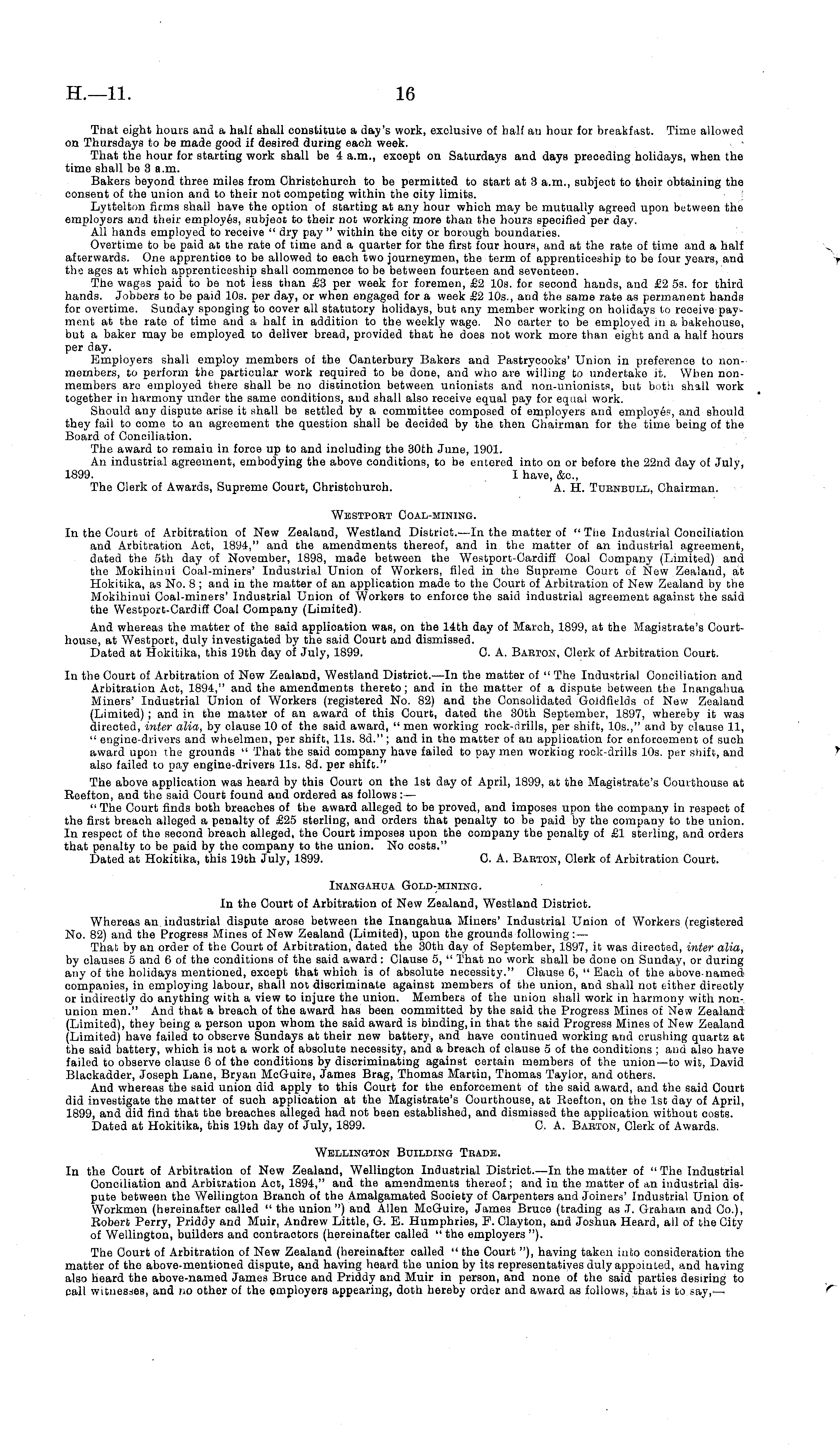 Tnat eight hours and a half shall constitute a day's work, exclusive of half an hour for breakfast. Time allowed on Thursdays to be made good if desired during each week. That the hour for starting work shall be 4 a.m., exoept on Saturdays and days preoeding holidays, when the time shall be 3 a.m. Bakers beyond three miles from Christchurch to be permitted to start at 3 a.m., subject to their obtaining the consent of the union and to their not competing within the city limits. ' Lyttelton firms shall have the option of starting at any hour which may be mutually agreed upon between the employers and their employes, subject to their not working more than the hours specified per day. AU hands employed to receive " dry pay " within the city or borough boundaries. Overtime to be paid at the rate of time and a quarter for the first four hours, and at the rate of time and a half afterwards. One apprentice to be allowed to each two journeymen, the term of apprenticeship to be four years, and the ages at which apprenticeship shall commence to be between fourteen and seventeen. The wag.s paid to be not less than £3 per week for foremen, £2 10s. for second hands, and £2 ss. for third hands. Jobbers to be paid 10s. per day, or when engaged for a week £2 10s., and the same rate as permanent hands for overtime. Sunday sponging to cover all statutory holidays, but any member working on holidays to receive payment at the rate of time and a half in addition to the weekly wage. No carter to be employed in a bakehouse, but a baker may be employed to deliver bread, provided that he does not work more than eight and a half hours per day. Employers shall employ members of the Canterbury Bakers and Pastrycooks' Union in preference to nonmembers, to perform the particular work required to be done, and who are willing to undertake it. When nonmembers are employed there shall be no distinction between unionists and non-unionists, but both shall work together in harmony under the same conditions, and shall also receive equal pay for equal work. Should any dispute arise it shall be Bettled by a committee composed of employers and employes, and should they fail to como to an agreement the question shall be deoided by the then Chairman for the time being of the Board of Conciliation. The award to remain in force up to and including the 30th June, 1901. An industrial agreement, embodying the above conditions, to be entered into on or before the 22nd day of July, 1899. I have, &c, The Clerk of Awards, Supreme Court, Christchuroh. A. H. Turnbull, Chairman. Westport Coal-mining. In the Court of Arbitration of New Zealand, Westland District. —In the matter of " Tne Industrial Conciliation and Arbitration Act, 1894," and the amendments thereof, and in the matter of an industrial agreement, dated the sth day of November, 1898, made between the Westport-Cardiff Coal Company (Limited) and the Mokihinui Coal-miners' Industrial Union of Workers, filed in the Supreme Court of New Zealand, at Hokitika, a3 No. 8 ; and in the matter of an application made to the Court of Arbitration of New Zealand by the Mokihinui Coal-miners' Industrial Union of Workers to enforce the said industrial agreement against the said the Westport-Cardiff Coal Company (Limited). And whereas the matter of the said application was, on the 14th day of March, 1899, at the Magistrate's Courthouse, at Westport, duly investigated by the said Court and dismissed. Dated at Hokitika, this 19th day of July, 1899. C. A. Barton, Clerk of Arbitration Court. In the Court of Arbitration of New Zealand, Westland District.—ln the matter of " The Industrial Conciliation and Arbitration Act, 1894," and the amendments thereto; and in the matter of a dispute between the Inangabua Miners' Industrial Union of Workers (registered No. 82) and the Consolidated Goldfields of New Zealand (Limited) ; and in the matter of an award of this Court, dated the 30th September, 1897, whereby it was directed, inter alia, by clause 10 of the said award, " men working rock-drills, per shift, 105.," and by clause 11, " engine-drivers and wheelmen, per shift, lis. Bd." ; and in the matter of au application for enforcement of such award upon the grounds " That the said company have failed to pay men working rock-drills 10s. per shift, and also failed to pay engine-drivers lis. Bd. per shift." The above application was heard by this Court on the Ist day of April, 1899, at the Magistrate's Courthouse at Reefton, and the said Court found and ordered as follows: — " The Court finds both breaches of the award alleged to be proved, and imposes upon the company in respect of the first breaoh alleged a penalty of £25 sterling, and orders that penalty to be paid by the company to the union. In respect of the second breach alleged, the Court imposes upon the company the penalty of £1 sterling, and orders that penalty to be paid by the company to the union. No costs." Dated at Hokitika, this 19th July, 1899. C. A. Barton, Clerk of Arbitration Court. Inangahua Gold-mining. In the Court of Arbitration of New Zealand, Westland District. Whereas an industrial dispute arose between the Inangahua Miners' Industrial Union of Workers (registered No. 82) and the Progress Mines of New Zealand (Limited), upon the grounds following: — That by an order of the Court of Arbitration, dated the 30th day of September, 1897, it was directed, inter alia, by clauses 5 and 6of the conditions of the said award: Clause 5, " That no work shall be done on Sunday, or during any of the holidays mentioned, except that which is of absolute necessity." Clause 6, " Each of the above-named companies, in employing labour, shall not discriminate against members of the union, and shall not either directly or indirectly do anything with a view to injure the union. Members of the union shall work in harmony with nonunion men." And that a breach of the award has been committed by the said the Progress Mines of New Zealand (Limited), 
