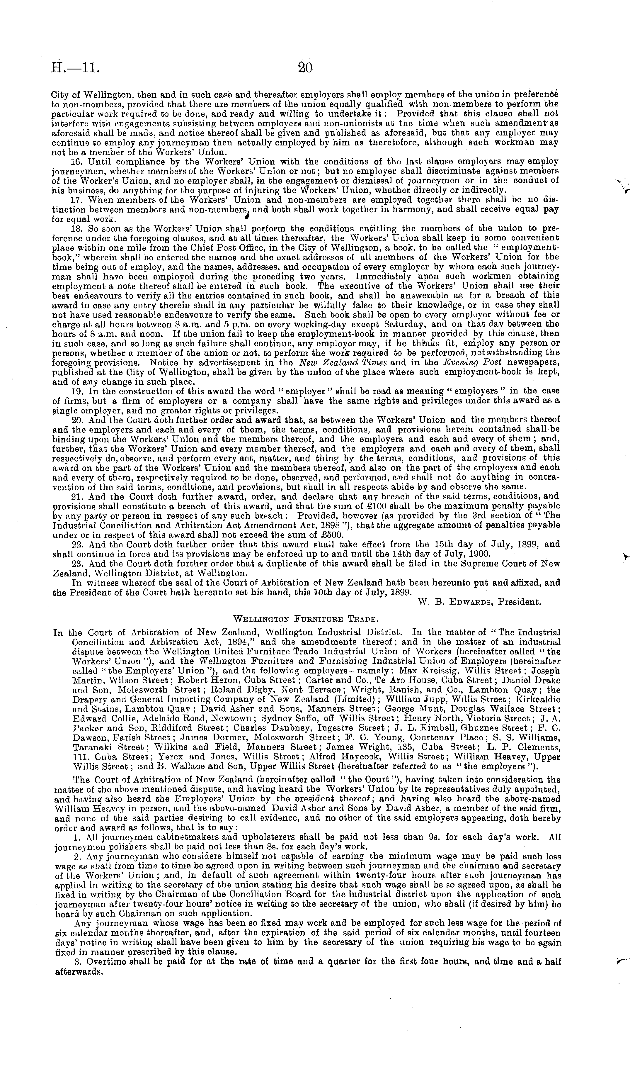 City of Wellington, then and in such case and thereafter employers shall employ members of the union in preference to non-members, provided that there are members of the union equally qualified with non members to perform the particular work required to be done, and ready and willing to undertake it: Provided that this clause shall not interfere with engagements subsisting between employers and non-unionists at the time when suoh amendment as aforesaid shall be made, and notice thereof shall be given and published as aforesaid, but that any employer may continue to employ any journeyman then actually employed by him as theretofore, although such workman may not be a member of the Workers' Union. 16. Until compliance by the Workers' Union with the conditions of the last clause employers may employ journeymen, whether members of the Workers' Union or not; but no employer shall discriminate against members of the Worker's Union, and no employer shall, in the engagement or dismissal of journeymen or in the conduct of his business, 6V> anything for the purpose of injuring the Workers' Union, whether directly or indirectly. 17. When members of the Workers' Union and non-members are employed together there shall be no distinction between members and non-members, and both shall work together in harmony, and shall receive equal pay for equal work. * 18. So soon as the Workers' Union shall perform the conditions entitling the members of the union to preference under the foregoing clauses, and at all times thereafter, the Workers' Union shall keep in some convenient place within one mile from the Chief Post Office, in the City of Wellington, a book, to be called the " employmentbook," wherein shall be entered the names and the exact addresses of all members of the Workers' Union for the time being out of employ, and the names, addresses, and occupation of every employer by whom each such journeyman shall have been employed during the preceding two years. Immediately upon such workmen obtaining employment a note thereof shall be entered in such book. The executive of the Workers' Union shall use their best endeavours to verify all the entries oontained in such book, and shall be answerable as for a breach of this award in case any entry therein shall in any particular be wilfully false to their knowledge, or in case they shall not have used reasonable endeavours to verify the same. Such book shall be open to every employer without fee or charge at all hours between 8 a.m. and 5 p.m. on every working-day except Saturday, and on that day between the hours of 8 a.m. and noon. If the union fail to keep the employment-book in manner provided by this clause, then in such case, and so long as such failure shall continue, any employer may, if he thinks fit, employ any person or persons, whether a member of the union or not, to perform the work required to be performed, notwithstanding tha foregoing provisions. Notice by advertisement in the New Zealand Times and in the Evening Post newspapers, published at the City of Wellington, shall be given by the union of the place where such employment-book is kept, and of any change in such place. 19. In the construction of this award the word " employer " shall be read as meaning " employers " in the case of firms, but a firm of employers or a company shall have the same rights and privileges under this award as a single employer, and no greater rights or privileges. 20. And the Court doth further order and award that, as between the Workers' Union and the members thereof and the employers and each and every of them, the terms, conditions, and provisions herein contained shall be binding upon the Workers' Union and the members thereof, and the employers and each and every of them ; and, further, that the Workers' Union and every member thereof, and the employers and each and every of them, shall respectively do, observe, and perform every act, matter, and thing by the terms, conditions, and provisions of this award on the part of the Workers' Union and the members thereof, and also on the part of the employers and eaoh and every of them, respectively required to be done, observed, and performed, and shall not do anything in contravention of the said terms, conditions, and provisions, but shall in all respects abide by and observe the same. 21. And the Court doth further award, order, and declare that any breach of the said terms, conditions, and provisions shall constitute a breach of this award, and that the sum of £100 shall be the maximum penalty payable by any party or person in respect of any such breach : Provided, however (as provided by the 3rd section of " The Industrial Conciliation and Arbitration Act Amendment Act, 1898 "), that the aggregate amount of penalties payable under or in respect of this award shall not exceed the sum of £500. 22. And the Court doth further order that this award shall take effect from the 15th day of July, 1899, and shall continue in force and its provisions may be enforced up to and until the 14th day of July, 1900. 23. And the Court doth further order that a duplicate of this award shall be filed in the Supreme Court of NewZealand, Wellington District, at Wellington. In witness whereof the seal of the Court of Arbitration of New Zealand hath been hereunto put and affixed, and the President of the Court hath hereunto set his hand, this 10th day of July, 1899. W. B. Edwards, President. Wellington Furniture Trade. In the Court of Arbitration of New Zealand, Wellington Industrial District.—ln the matter of " The Industrial Conciliation and Arbitration Act, 1894," and the amendments thereof; and in the matter of an industrial dispute between the Wellington United Furniture Trade Industrial Union of Workers (hereinafter called " the Workers' Union "), and the Wellington Furniture and Furnishing Industrial Union of Employers (hereinafter called "the Employers' Union "), and the following employers-namely: Max Kreissig, Willis St