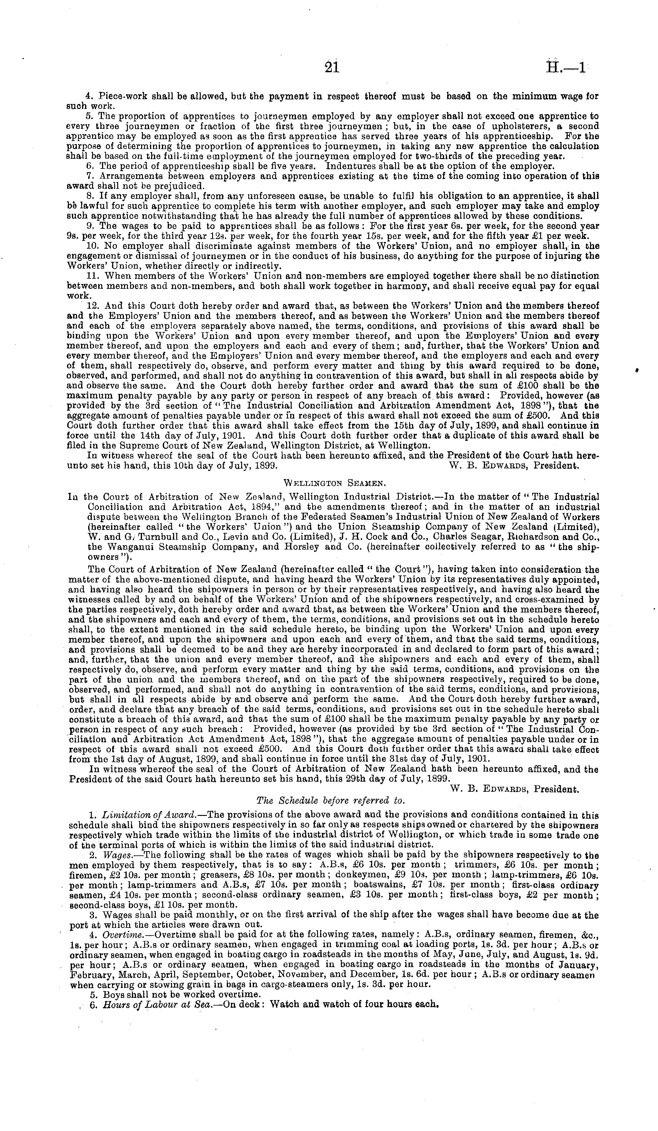 4. Piece-work shall be allowed, but the payment in respeot thereof must be based on the minimum wage for such work. 5. The proportion of apprentices to journeymen employed by any employer shall not exceed one apprentice to every three journeymen or fraction of the first three journeymen ; but, in the case of upholsterers, a second apprentice may be employed as soon as the first apprentice has served three years of his apprenticeship. For the purpose of determining the proportion of apprentices to journeymen, in taking any new apprentice the calculation shall be based on the full-time employment of the journeymen employed for two-thirds of the preceding year. 6. The period of apprenticeship shall be five years. Indentures shall be at the option of the employer. 7. Arrangements between employers and apprentices existing at the time of the coming into operation of this award shall not be prejudiced. 8. If any employer shall, from any unforeseen cause, be unable to fulfil his obligation to an apprentice, it shall be lawful for such apprentice to complete his term with another employer, and such employer may take and employ such apprentice notwithstanding that he has already the full number of apprentices allowed by these conditions. 9. The wages to be paid to apprentices shall be as follows : For the first year 6s. per week, for the second year 9s. per week, for the third year 12s. par weak, for the fourth year 15s. per week, and for the fifth year £1 per week. 10. No employer shall discriminate against members of the Workers' Union, and no employer shall, in the engagement or dismissal of journeymen or in the conduct of his business, do anything for the purpose of injuring the Workers' Union, whether directly or indirectly. 11. When members of the Workers' Union and non-members are employed together there shall be no distinction between members and non-members, and both shall work together in harmony, and shall receive equal pay for equal work. 12. And this Court doth hereby order and award that, as between the Workers' Union and the members thereof and the Employers' Union and the members thereof, and as between the Workers' Union and the members thereof and each of the employers separately above named, the terms, conditions, and provisions of this award shall be binding upon the Workers' Union and upon every member thereof, and upon the Employers' Union and every member thereof, and upon the employers and each and every of them; and, further, that the Workers' Union and every member thereof, and the Employers' Union and every member thereof, and the employers and each and every of them, shall respectively do, observe, and perform every matter and thing by this award required to be done, observed, and performed, and shall not do anything in contravention of this award, but shall in all respects abide by and observe the same. And the Court doth hereby further order and award that the sum of £100 shall be the maximum penalty payable by any party or person in respect of any breach of this award: Provided, however (as provided by the 3rd section of " The Industrial Conciliation and Arbitration Amendment Act, 1898"), that the aggregate amount of penalties payable under or in respect of this award shall not exceed the sum of £500. And this Court doth further order that this award shall take effect from the 15th day of July, 1899, and shall continue in force until the 14th day of July, 1901. And this Court doth further order that a duplicate of this award shall be filed in the Supreme Court of New Zealand, Wellington District, at Wellington. In witness whereof the seal of the Court hath been hereunto affixed, and the President of the Court hath hereunto set his hand, this 10th day of July, 1899. W. B. Edwards, President. Wellington Seamen. In the Court of Arbitration of New Zealand, Wellington Industrial Distriot. —In the matter of " The Industrial Conciliation and Arbitration Act, 1894," and the amendments thereof; and in the matter of an industrial dispute between the Wellington Branch of the Federated Seamen's Industrial Union of New Zealand of Workers (hereinafter called " the Workers' Union ") and the Union Steamship Company of New Zealand (Limited), W. and G. Turnbull and Co., Levin and Co. (Limited), J. H. Cock and Co., Charles Seagar, Richardson and Co., the Wanganui Steamship Company, and Horsley and Co. (hereinafter collectively referred to as " the shipowners "). The Court of Arbitration of New Zealand (hereinafter called " the Court"), having taken into consideration the matter of the above-mentioned dispute, and having heard the Workers' Union by its representatives duly appointed, and having also heard the shipowners in person or by their representatives respectively, and having also heard the witnesses called by and on behalf of the Workers' Union and of the shipowners respectively, and cross-examined by the parties respectively, doth hereby order and award that, as between the Workers' Union and the members thereof, and the shipowners and each and every of them, the terms, conditions, and provisions set out in the schedule hereto shall, to the extent mentioned in the said schedule hereto, be binding upon the Workers' Union and upon every member thereof, and upon the shipowners and upon each and every of them, and that the said terms, conditions, and provisions shall ba deemed to be and they are hereby incorporated in and declared to form part of this award; and, further, that the union and every member thereof, and the shipowners and each and every of them, shall respectively do, observe, and perform every matter and thing by the said terms, conditions, and provisions on the part of the union and the members thereof, and on the part of the shipowners respectively, required to be done, observed, and performed, and shall not do anything in contravention of the said terms, conditions, and provisions, but shall in all respects abide by and observe and perform the same. And the Co
