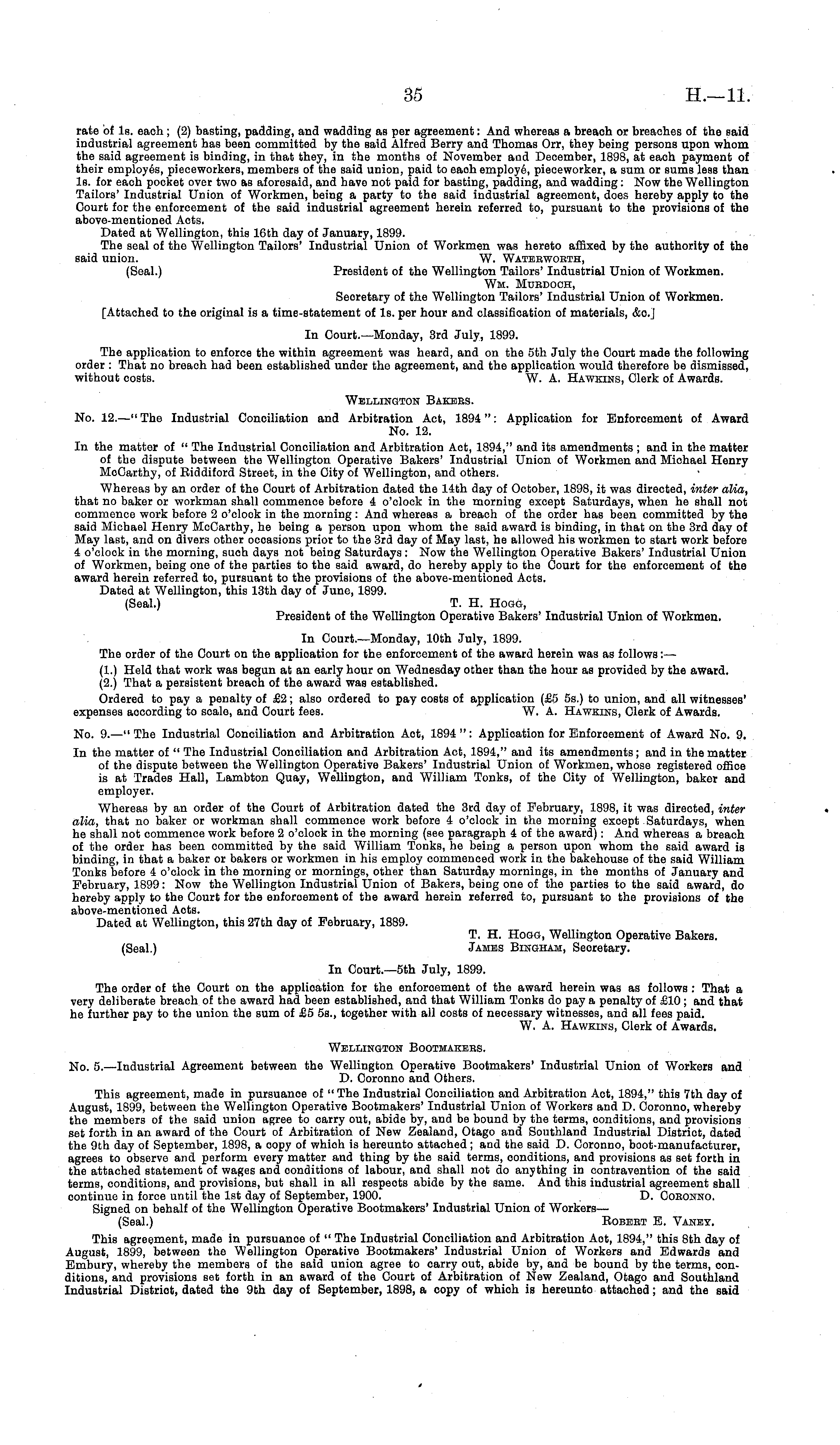 rate of Is. eaoh ; (2) basting, padding, and wadding as per agreement: And whereas a breach or breaches of the said industrial agreement has been committed by the said Alfred Berry and Thomas Orr, they being persons upon whom the said agreement is binding, in that they, in the months of November aad December, 1898, at each payment of their employes, pieceworkers, members of the said union, paid to eaoh employe, pieceworker, a sum or sums less than Is. for each pocket over two as aforesaid, and have not paid for basting, padding, and wadding: Now the Wellington Tailors' Industrial Union of Workmen, being a party to the said industrial agreement, does hereby apply to the Court for the enforcement of the said industrial agreement herein referred to, pursuant to the provisions of the above-mentioned Acts. Dated at Wellington, this 16th day of January, 1899. The seal of the Wellington Tailors' Industrial Union of Workmen was hereto affixed by the authority of the said union. W. Waterworth, (Seal.) President of the Wellington Tailors' Industrial Union of Workmen. Wm. Murdoch, Secretary of the Wellington Tailors' Industrial Union of Workmen. [Attached to the original is a time-statement of Is. per hour and classification of materials, &c.J In Court.—Monday, 3rd July, 1899. The application to enforce the within agreement was heard, and on the sth July the Court made the following order : That no breaoh had been established under the agreement, and the application would therefore be dismissed, without costs. W. A. Hawkins, Clerk of Awards. Wellington Bakers. No. 12. —" The Industrial Conciliation and Arbitration Act, 1894": Application for Enforcement of Award No. 12. In the matter of " The Industrial Conciliation and Arbitration Act, 1894," and its amendments ; and in the matter of the dispute between the Wellington Operative Bakers' Industrial Union of Workmen and Michael Henry McCarthy, of Riddiford Street, in the City of Wellington, and others. Whereas by an order of the Court of Arbitration dated the 14th day of October, 1898, it was directed, inter alia, that no baker or workman shall commence before 4 o'clock in the morning except Saturdays, when he shall not commence work before 2 o'clock in the morning: And whereas a breach of the order has been committed by the said Michael Henry McCarthy, he being a person upon whom the said award is binding, in that on the 3rd day of May last, and on divers other ocoasions prior to the 3rd day of May last, he allowed his workmen to start work before 4 o'clock in the morning, such days not beiDg Saturdays : Now the Wellington Operative Bakers' Industrial Union of Workmen, being one of the parties to the said award, do hereby apply to the Court for the enforcement of the award herein referred to, pursuant to the provisions of the above-mentioned Acts. Dated at Wellington, this 13th day of June, 1899. (Seal.) T. H. Hogg, President of the Wellington Operative Bakers' Industrial Union of Workmen. In Court.—Monday, 10th July, 1899. The order of the Court on the application for the enforcement of the award herein was as follows: — (1.) Held that work was begun at an early hour on Wednesday other than the hour as provided by the award. (2.) That a persistent breach of the award was established. Ordered to pay a penalty of £2; also ordered to pay costs of application (£5 55.) to union, and all witnesses' expenses aocording to scale, and Court fees. W. A. Hawkins, Clerk of Awards. No. 9.—" The Industrial Conciliation and Arbitration Act, 1894 ": Application for Enforcement of Award No. 9. In the matter of " The Industrial Conciliation and Arbitration Act, 1894," and its amendments ; and in the matter of the dispute between the Wellington Operative Bakers' Industrial Union of Workmen, whose registered office is at Trades Hall, Lambton Quay, Wellington, and William Tonks, of the City of Wellington, baker and employer. Whereas by an order of the Court of Arbitration dated the 3rd day of February, 1898, it was directed, inter alia, that no baker or workman shall commence work before 4 o'clock in the morning except Saturdays, when he shall not commence work before 2 o'clock in the morning (see paragraph 4of the award): And whereas a breach of the order has been committed by the said William Tonks, he being a person upon whom the said award is binding, in that a baker or bakers or workmen in his employ commenced work in the bakehouse of the said William Tonks before 4 o'clock in the morning or mornings, other than Saturday mornings, in the months of January and February, 1899: Now the Wellington Industrial Union of Bakers, being one of the parties to the said award, do hereby apply to the Court for the enforcement of the award herein referred to, pursuant to the provisions of the above-mentioned Acts. Dated at Wellington, this 27th day of February, 1889. T. H. Hogg, Wellington Operative Bakers. (Seal.) James Bingham, Secretary. In Court.—sth July, 1899. The order of the Court on the application for the enforcement of the award herein was as follows : That a very deliberate breach of the award had been established, and that William Tonks do pay a penalty of £10 ; and that he further pay to the union the sum of £5 55., together with ail costs of necessary witnesses, and all fees paid. W. A. Hawkins, Clerk of Awards. Wellington Bootmakers. No. s.—lndustrial Agreement between the Wellington Operative Bootmakers' Industrial Union of Workers and D. Coronno and Others. This agreement, made in pursuanoe of "The Industrial Conciliation and Arbitration Aot, 1894," this 7th day of August, 1899, between the Wellington Operative Bootmakers' Industrial Union of Workers and D. Coronno, whereby the members of the said union agree to carry out, abide by, and be bound by the terms, conditions, and provisions set forth in an award of the Court of Arbitration of New Zealand, Otago and Southland Industrial Distriot, dated the 9th day of September, 1898, a oopy of which 