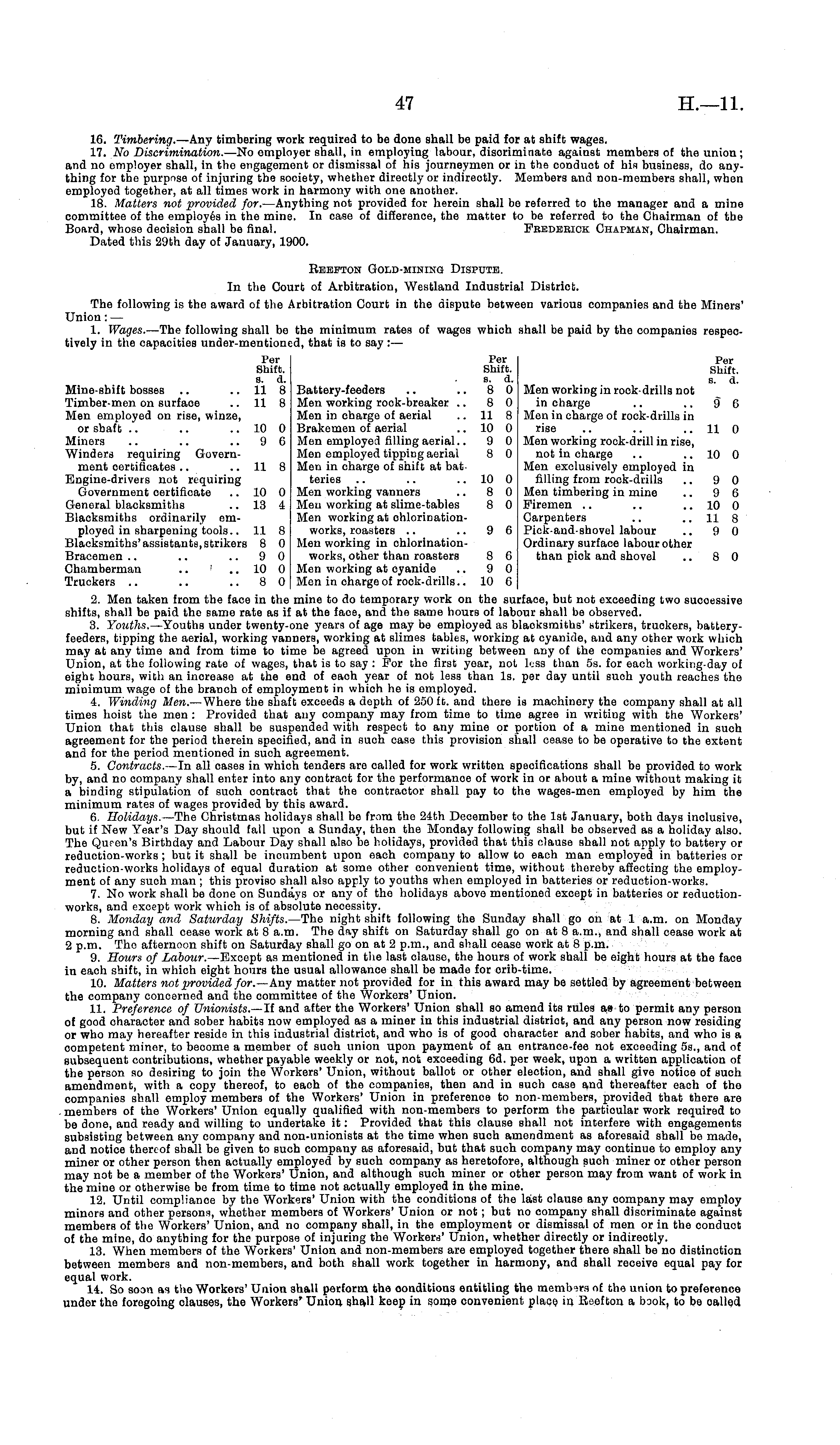 16. Timbering. —Any timbering work required to be done shall be paid for at shift wages. 17. No Discrimination. —No employer shall, in employing labour, discriminate against members of the union; and no employer shall, in the engagement or dismissal of his journeymen or in the conduot of his business, do anything for the purpose of injuring the society, whether directly or indirectly. Members and non-members shall, when employed together, at all times work in harmony with one another. 18. Matters not provided for. —Anything not provided for herein shall be referred to the manager and a mine committee of the employes in the mine. In case of difference, the matter to be referred to the Chairman of the Board, whose decision shall be final. Frederick Chapman, Chairman. Dated this 29th day of January, 1900. Reefton Gold-mining Dispute. In the Court of Arbitration, Westland Industrial District. The following is the award of the Arbitration Court in the dispute between various companies and the Miners' Union: — 1. Wages. —The following shall be the minimum rates of wages which shall be paid by the companies respectively in the capacities under-mentioned, that is to say :— Per Per Per Shift. Shift. Shift, s. d. s. d. s. d. Mine-shift bosses .. .. 11 8 Battery-feeders .. .. 8 0 Men working in rock-drills not Timber-men on surfaoe .. 11 8 Men working rook-breaker .. 8 0 in charge .. .. 9 6 Men employed on rise, winze, Men in charge of aerial .. 11 8 Men in charge of rock-drills in or shaft .. .. .. 10 0 Brakemen of aerial .. 10 0 rise .. .. .. 11 0 Miners .. .. ..9 6 Men employed filling aerial.. 9 0 Men working rock-drill in rise, Winders requiring Govern- Men employed tipping aerial 8 0 not in charge .. .. 10 0 ment certificates .. .. 11 8 Men in charge of shift at bat- Men exclusively employed in Engine-drivers not requiring teries .. .. .. 10 0 filling from rock-drills .. 9 0 Government certificate .. 10 0 Men working vanners .. 8 0 Men timbering in mine .. 9 6 General blacksmiths .. 13 4 Men working at slime-tables 8 0 Firemen .. .. .. 10 0 Blaoksmiths ordinarily em- Men working at ohlorination- Carpenters .. .. 11 8 ployed in sharpening tools.. 11 8 works, roasters .. .. 9 6 Piok-and-shovel labour .. 9 0 Blacksmiths'assistants, strikers 8 0 Men working in ohlorination- Ordinary surface labour other Bracemen .. .. .. 9 0 works, other than roasters 8 6 than pick and shovel .. 8 0 Chamberman .. .. 10 0 Men working at cyanide .. 9 0 Truckers .. .. .. 8 0 Men in charge of rock-drills.. 10 6 2. Men taken from the face in the mine to do temporary work on the surface, but not exceeding two successive shifts, shall be paid the same rate as if at the face, and the same hours of labour shall be observed. 3. Pi.Mi/is.—Youths under twenty-one years of age may be employed as blacksmiths' strikers, truckers, batteryfeeders, tipping the aerial, working vanners, working at slimes tables, working at cyanide, and any other work which may at any time and from time to time be agreed upon in writing between any of the companies and Workers' Union, at the following rate of wages, that is to say : For the first year, not less than ss. for each working-day of eight hours, with an increase at the end of eaoh year of not less than Is. per day until suoh youth reaches the minimum wage of the branch of employment in which he is employed. 4. Winding Men. — Where the shaft exceeds a depth of 250 ft. and there is machinery the company shall at all times hoist the men : Provided that any company may from time to time agree in writing with the Workers' Union that this clause shall be suspended with respect to any mine or portion of a mine mentioned in such agreement for the period therein specified, and in suoh ease this provision shall cease to be operative to the extent and for the period mentioned in such agreement. 5. Contracts. —In all cases in which tenders are called for work written specifications shall ba provided to work by, and no oompany shall enter into any contract for the performance of work in or about a mine without making it a binding stipulation of such contract that the contractor shall pay to the wages-men employed by him the minimum rates of wages provided by this award. 6. Holidays. —The Christmas holidays shall be from the 24th December to the Ist January, both days inclusive, but if New Year's Day should fall upon a Sunday, then the Monday following shall be observed as a holiday also. The Queen's Birthday and Labour Day shall also be holidays, provided that this clause shall not apply to battery or reduction-works; but it shall be inoumbent upon each company to allow to each man employed in batteries or reduction-works holidays of equal duration at some other convenient time, without thereby affecting the employment of any such man ; this proviso shall also apply to youths when employed in batteries or reduction-works. 7. No work shall be done on Sundays or any of the holidays above mentioned except in batteries or reductionworks, and except work which is of absolute necessity. 8. Monday and Saturday Shifts. —The night shift following the Sunday shall go on at 1 a.m. on Monday morning and shall cease work at 8 a.m. The day shift on Saturday shall go on at 8 a.m., and shall cease work at 2 p.m. Tho afternoon shift on Saturday shall go on at 2 p.m., and shall cease work at 8 p.m. 9. Hours of Labour. —Except as mentioned in the last clause, the hours of work shall be eight hours at the face in eaoh shift, in which eight hours the usual allowance shall be made for orib-time. 10. Matters not provided for. —Any matter not provided for in this award may be settled by agreement between the company concerned and the committee of the Workers' Union. 11. Preference of Unionists. — If and after the Workers' Union shall so amend its rules as to permit any person of good oharacter and sober habits now employed as a miner in this industrial distriot, and any person now residing or who m