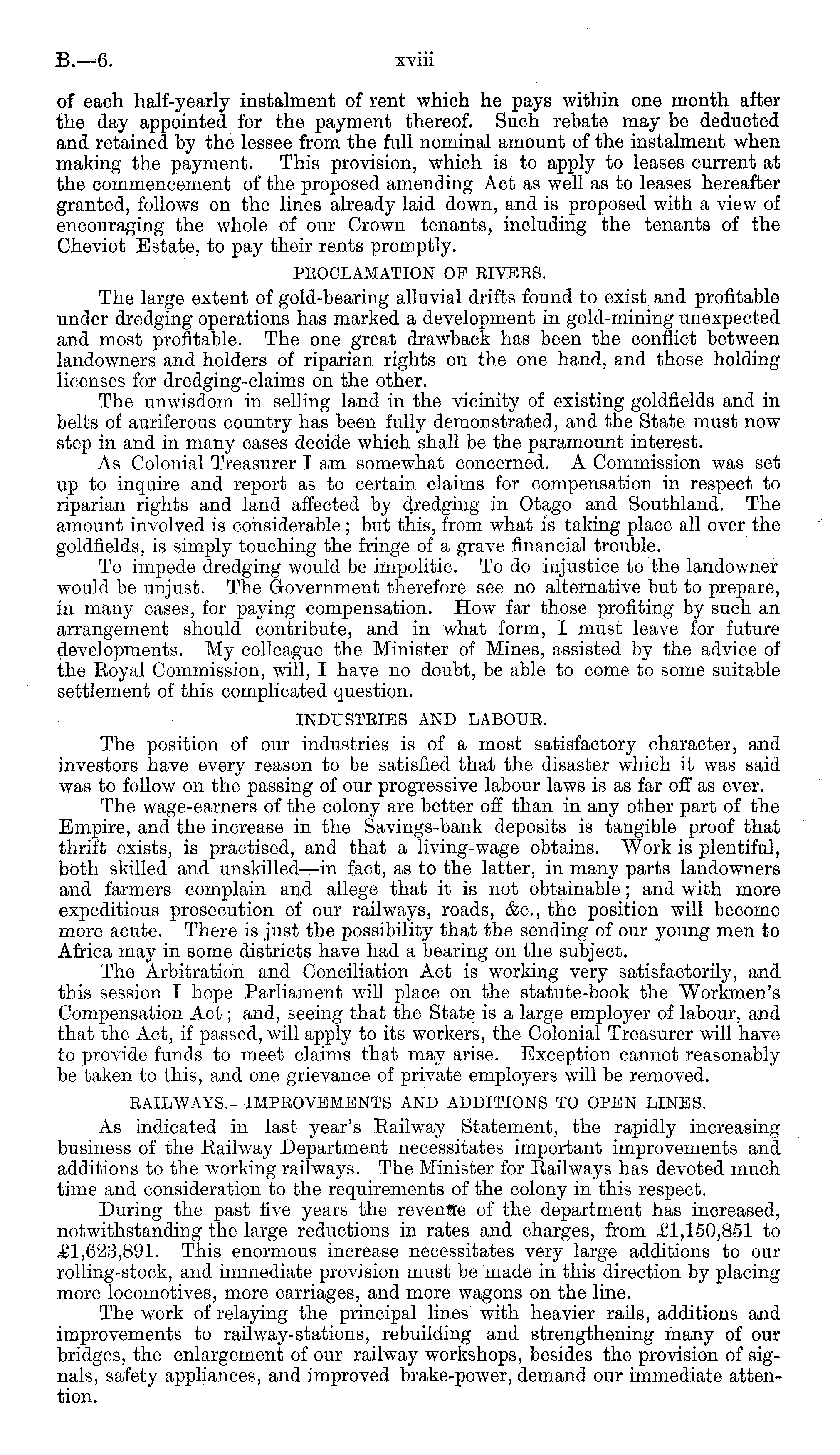 of each half-yearly instalment of rent which he pays within one month after the day appointed for the payment thereof. Such rebate may be deducted and retained by the lessee from the full nominal amount of the instalment when making the payment. This provision, which is to apply to leases current at the commencement of the proposed amending Act as well as to leases hereafter granted, follows on the lines already laid down, and is proposed with a view of encouraging the whole of our Crown tenants, including the tenants of the Cheviot Estate, to pay their rents promptly. PEOCLAMATION OP EIVERS. The large extent of gold-bearing alluvial drifts found to exist and profitable under dredging operations has marked a development in gold-mining unexpected and most profitable. The one great drawback has been the conflict between landowners and holders of riparian rights on the one hand, and those holding licenses for dredging-claims on the other. The unwisdom in selling land in the vicinity of existing goldfields and in belts of auriferous country has been fully demonstrated, and the State must now step in and in many cases decide which shall be the paramount interest. As Colonial Treasurer lam somewhat concerned. A Commission was set up to inquire and report as to certain claims for compensation in respect to riparian rights and land affected by dredging in Otago and Southland. The amount involved is considerable; but this, from what is taking place all over the goldfields, is simply touching the fringe of a grave financial trouble. To impede dredging would be impolitic. To do injustice to the landowner would be unjust. The Government therefore see no alternative but to prepare, in many cases, for paying compensation. How far those profiting by such an arrangement should contribute, and in what form, I must leave for future developments. My colleague the Minister of Mines, assisted by the advice of the Royal Commission, will, I have no doubt, be able to come to some suitable settlement of this complicated question. INDUSTRIES AND LABOUR. The position of our industries is of a most satisfactory character, and investors have every reason to be satisfied that the disaster which it was said was to follow on the passing of our progressive labour laws is as far off as ever. The wage-earners of the colony are better off than in any other part of the Empire, and the increase in the Savings-bank deposits is tangible proof that thrift exists, is practised, and that a living-wage obtains. Work is plentiful, both skilled and unskilled—in fact, as to the latter, in many parts landowners and farmers complain and allege that it is not obtainable; and with more expeditious prosecution of our railways, roads, &c, the position will become more acute. There is just the possibility that the sending of our young men to Africa may in some districts have had a bearing on the subject. The Arbitration and Conciliation Act is working very satisfactorily, and this session I hope Parliament will place on the statute-book the Workmen's Compensation Act; and, seeing that the State is a large employer of labour, and that the Act, if passed, will apply to its workers, the Colonial Treasurer will have to provide funds to meet claims that may arise. Exception cannot reasonably be taken to this, and one grievance of private employers will be removed. RAILWAYS.—IMPROVEMENTS AND ADDITIONS TO OPEN LINES. As indicated in last year's Eailway Statement, the rapidly increasingbusiness of the Railway Department necessitates important improvements and additions to the working railways. The Minister for Railways has devoted much time and consideration to the requirements of the colony in this respect. During the past five years the revenrre of the department has increased, notwithstanding the large reductions in rates and charges, from ,£1,150,851 to £1,623,891. This enormous increase necessitates very large additions to our rolling-stock, and immediate provision must be made in this direction by placing more locomotives, more carriages, and more wagons on the line. The work of relaying the principal lines with heavier rails, additions and improvements to railway-stations, rebuilding and strengthening many of our bridges, the enlargement of our railway workshops, besides the provision of signals, safety appliances, and improved brake-power, demand our immediate attention.