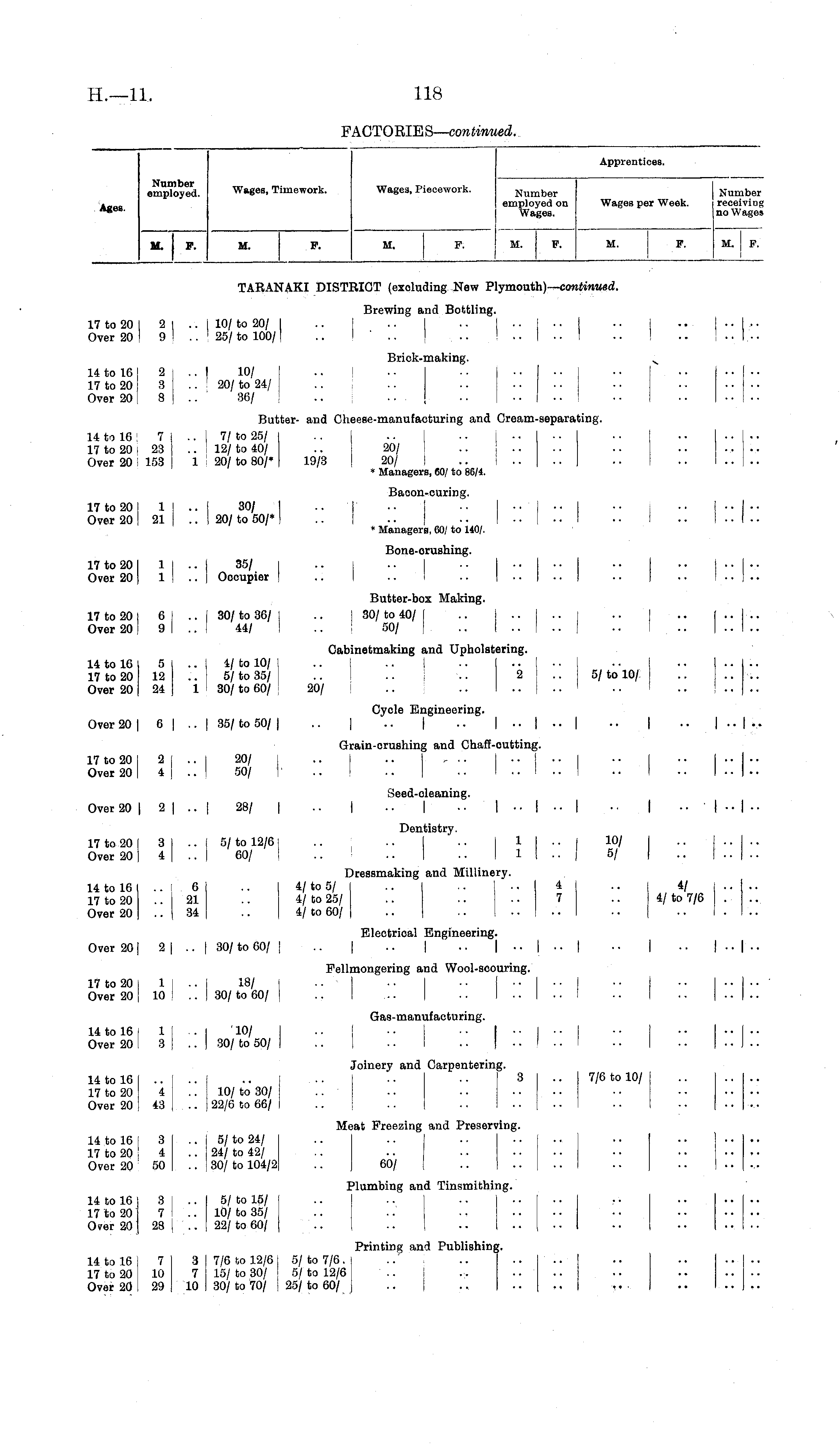 Apprentices. Number employed. Wages, Timework. Wages, Piecework. Wages per Week. | Number I receiving no Wages Ages. Number employed on Wages. M. F. M. F. M. P. M. P. M. P. M. j P. I TARANAKI DISTRICT (exoluding New Plymouth)— continued. Brewing and Bottling. 17 to 20 I 2 I .. I 10/ to 20/ I .. .. .. .. I .. •• | •. I • • I •■ Over 20 I 9 1 .. ' 25/ to 100/1 .. ! .. .. . ! .. I' .. I • • .. ' •. I ■ ■ Brick-making. 14 to 16 2 .. I 10/ .. ! .. .. • • ■■ •. 17 to 20 3 .. 1 20/ to 24/ .. .. .'. .. .. .. .. .... Over 20 8 36/ .. .. , •. ... • • ■. Butter- and Cheese-manufacturing and Cream-separating. 14 to 16' 7 .. i 7/ to 25/ .. I .. I .. .. I .. .. 17 to 20 i 23 .. I 12/to 40/ .. 20/ .. .. .. .. .. ...... Over 20 153 1 I 20/ to 80/* 19/3 20/ I .. I .. .. .. .. I .. .. * Managers, 60/ to 86/4. Bacon-curing. 17 to 201 II .. I 30/ I .. T .. •■ .. j .. I .. .. I ... I .. Over 20 ! 21 .. I 20/ to 50/* I .. .. .. •. .. I • • I .. I .. I •. * Managers, 60/ to 140/. Bone-orushing. 17 to 20 j II . - I 35/ I .. I .. I .. I •. • • .. .. I *• I •• Over 20 | 1 I .. | Occupier | .. I .. I .. | ... | .... | .. | .. I .. | .. Butter-box Making. 17to20i 6 1 .. I 30/ to 36/ I .. I 30/ to 40/ [ .. I .. I .. I .. I .. [••T" Over 201 9 I .. I 44/ I .. 50/ I .. I .. I .. | .. I .. | .. I .. Cabinetmaking and Upholstering. 14 to 16 5 .. I 4/ to 10/ I .. .. j .. .. .. .. 17 to 20 12 .. 5/ to 35/ | .. .. .. 2 .. 5/ to 10/ Over 20 24 1 30/ to 60/ 20/ .. .. .. | .. .. Cycle Engineering. Over 20 | 6 | .. | 35/ to 50/ | .. | .. ( .. | .. | .. | .. | .. | .. | ... Grain-orushing and Ohaff-outting. 17 to 20 I 2 I .. I 20/ I .. .. .. .... I .. I .. I • • I •• Over 20 I 4].. | 50/ V .. I .. | .. I .. I .. I .. I .. I .. | .. Seed-cleaning. Over 20 | 2 | .. | 28/ | .. 1 .. | .. | .. | .. | .. | .. | .. | .. Dentistry. 17 to 20 I 3 1 .. I 5/ to 12/61 .. .. I .. I 1 I . .. I 10/ I .. I .. I .. Over 20 | 4 | .. | 60/ | .. .. I .. | 1 | .. | 5/ | .. | .. | .. Dressmaking and Millinery. 14 to 16 .. 6 .. 4/ to 5/ .. I .. ■ • 4 .. 4/ .... 17 to 20 .. i 21 .. 4/ to 25/ .. .. .. 7 .. 4/ to 7/6 . - .. Over 20 .. j 34 .. 4/ to 60/ .. | .. .. I •. .. Electrical Engineering. Over 201 2 | .. | 30/ to 60/ | .. | .. | .. | .. | .. | .. | .. | .. | .. Fellmongering and Wool-soouring. 17 to 20 I II - - I 18/ I .. ■ • I •• I * * I * • I ' - - * I * * I * * Over 20 | 10 I .. | 30/ to 60/ I .. I ... I •• I .. I .. I .. I .. |.. |.. Gas-manufacturing. 14tol6| II .. | '10/ I •■ | •■ •• I ■■ I •• I I ** I ** I ** Over 20 I 3 | .. I 30/ to 50/ I .. 1 .. I .. | .. | .. I .. | .. | .. ] .. Joinery and Carpentering. 14 to 16 .. I •• •• 3 .. 7/6 to 10/ 17 to 20 4 .. 10/ to 30/ .. .. .. • • • • • ■ Over 20 43 .. 22/6 to 66/ .. .. .. .. .. •. Meat Freezing and Preserving. 14 to 16 I 3 .. 5/to 24/ .. .. I .. •- .. •. 17 to 20 I 4 .. 24/to 42/ .. .. .. .. .. .. Over 20 50 .. 30/ to 104/2 .. 60/ [ .. .. .. .. Plumbing and Tinsmithing. 14 to 16 3 I .. I 5/ to 15/ I .. .. 1 .. .. .. .. 17 to 20 7 I .. 10/ to 35/ .. .. .. ■ • • • •. Over 20 28 |'.. I 22/ to 60/ I .. .. I • • ■ • • • • • Printing and Publishing. 14 to 16 7 3 7/6 to 12/61 5/to 7/6. ..' .. .. .. .. 17 to 20 10 7 15/to 30/ 5/to 12/6 '.. . ; . .. .. .. Over 20 29 10 30/to 70/ i 25/ to 60/ .. | ... .. .. ...