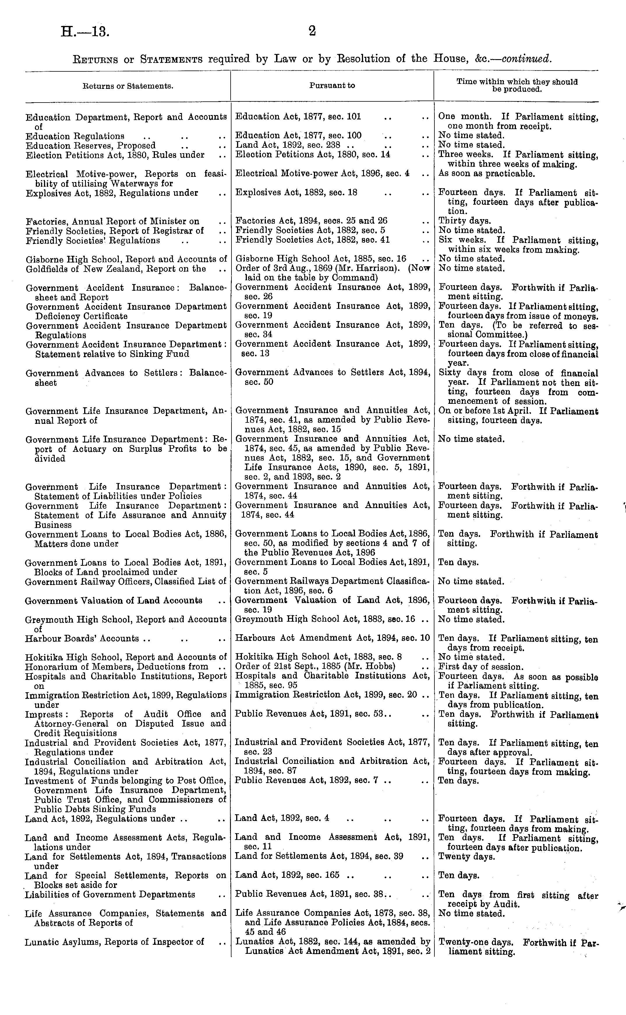 Returns or Statements. Pursuant to Time within which they should be produced. Education Department, Report and Accounts of Eduoation Regulations Education Reserves, Proposed Eleotion Petitions Act, 1880, Rules under Education Act, 1877, sec. 101 Education Aot, 1877, sec 100 Land Act, 1892, sec. 238 .. Eleotion Petitions Aot, 1880, sec 14 One month. If Parliament sitting, one month from receipt. No time stated. No time stated. Three weeks. If Parliament sitting, within three weeks of making. As soon as practicable. Electrical Motive-power, Reports on feasibility of utilising Waterways for Explosives Act, 1882, Regulations under Electrical Motive-power Aot, 1896, sec 4 Explosives Aot, 1882, seo. 18 Fourteen days. If Parliament sitting, fourteen days after publication. Thirty days. No time stated. Six weeks. If Parliament sitting, within six weeks from making. No time stated. No time stated. Factories, Annual Report of Minister on Friendly Societies, Report of Registrar of Friendly Societies' Regulations Factories Act, 1894, seos. 25 and 26 Friendly Sooieties Act, 1882, seo. 5 Friendly Sooieties Act, 1882, seo. 41 Gisborne High School, Report and Accounts of Goldfields of New Zealand, Report on the Gisborne High School Act, 1885, sec. 16 Order of 3rd Aug., 1869 (Mr. Harrison). (Now laid on the table by Command) Government Accident Insurance Aot, 1899, sec. 26 Government Accident Insurance: Balancesheet and Report Government Accident Insurance Department Deficiency Certificate Government Accident Insurance Department Regulations Government Aooident Insurance Department: Statement relative to Sinking Fund Government Aooident Insurance Aot, 1899, seo. 19 Government Accident Insurance Aot, 1899, sec. 34 Government Aooident Insurance Aot, 1899, seo. 13 Fourteen days. Forthwith if Parliament sitting. Fourteen days. If Parliament sitting, fourteen days from issue of moneys. Ten days. (To be referred to sessional Committee.) Fourteen days. If Parliament sitting, fourteen days from close of finanoial year. Sixty days from close of finanoial year. If Parliament not then sitting, fourteen days from commencement of session. On or before 1st April. If Parliament sitting, fourteen days. Government Advances to Settlers: Balancesheet Government Advances to Settlers Act, 1894, seo. 50 Government Life Insurance Department, Annual Report of Government Life Insurance Department: Report of Actuary on Surplus Profits to be divided Government Insurance and Annuities Act, 1874, sec. 41, as amended by Public Revenues Act, 1882, sec. 15 Government Insurance and Annuities Act, 1874, sec. 45, as amended by Publio Revenues Act, 1882, sec. 15, and Government Life Insurance Acts, 1890, seo. 5, 1891, seo. 2, and 1893, seo. 2 Government Insurance and Annuities Aot, 1874, sec. 44 Government Insurance and Annuities Act, 1874, sec. 44 No time stated. Government Life Insurance Department : Statement of Liabilities under Polioies Government Life Insurance Department : Statement of Life Assurance and Annuity Business Government Loans to Local Bodies Act, 1886, Matters done under Fourteen days. Forthwith if Parliament sitting. Fourteen days. Forthwith if Parliament sitting. Government Loans to Local Bodies Act, 1891, Blocks of Land proclaimed under Government Railway Officers, Classified List of Government Loans to Local Bodies Act, 1886, sec. 50, as modified by sections 4 and 7 of the Public Revenues Act, 1896 Government Loans to Local Bodies Act, 1891, sec. 5 Government Railways Department Classification Act, 1896, sec. 6 Government Valuation of Land Aot, 1896, seo. 19 Greymouth High School Act, 1883, seo. 16 .. Ten days. Forthwith if Parliament sitting. Ten days. No time stated. Government Valuation of Land Accounts Fourteen days. Forthwith if Parliament sitting. No time stated. Greymouth High School, Report and Aocounts of Harbour Boards' Aocounts Ten days. If Parliament sitting, ten days from receipt. No time stated. First day of session. Fourteen days. As soon as possible if Parliament sitting. Ten days. If Parliament sitting, ten days from publication. Ten days. Forthwith if Parliament sitting. Harbours Aot Amendment Aot, 1894, sec 10 Hokitika High School, Report and Accounts of Honorarium of Members, Deductions from .. Hospitals and Charitable Institutions, Report on Immigration Restriction Act, 1899, Regulations under Imprests : Reports of Audit Offioe and Attorney-General on Disputed Issue and Credit Requisitions Industrial and Provident Societies Act, 1877, Regulations under Industrial Conciliation and Arbitration Act, 1894, Regulations under Investment of Funds belonging to Post Office, Government Life Insurance Department, Public Trust Offioe, and Commissioners of Public Debts Sinking Funds Land Act, 1892, Regulations under Hokitika High Sohool Act, 1883, sec. 8 Order of 21st Sept., 1885 (Mr. Hobbs) Hospitals and Charitable Institutions Act, 1885, seo. 95 Immigration Restriction Act, 1899, seo. 20 .. Publio Revenues Act, 1891, sec. 53.. Industrial and Provident Societies Act, 1877, sec. 23 Industrial Conciliation and Arbitration Act, 1894, seo. 87 Public Revenues Aot, 1892, sec. 7 .. Ten days. If Parliament sitting, ten days after approval. Fourteen days. If Parliament sitting, fourteen days from making. Ten days. Land Act, 1892, seo. 4 Fourteen days. If Parliament sitting, fourteen days from making. Ten days. If Parliament sitting, fourteen days after publication. Twenty days. Land and Income Assessment Acts, Regulalations under Land for Settlements Aot, 1894, Transactions under Land for Special Settlements, Reports on Blooks set aside for Liabilities of Government Departments Land and Income Assessment Aot, 1891, sec. 11 Land for Settlements Aot, 1894, sec 39 Land Act, 1892, seo. 165 .. Ten days. Publio Revenues Act, 1891, seo. 38.. Ten days from first sitting after receipt by Audit. No time stated. Life Assurance Companies, Statements and Abstracts of Reports of Life Assurance Companies Aot, 1873, seo. 38, and Lif
