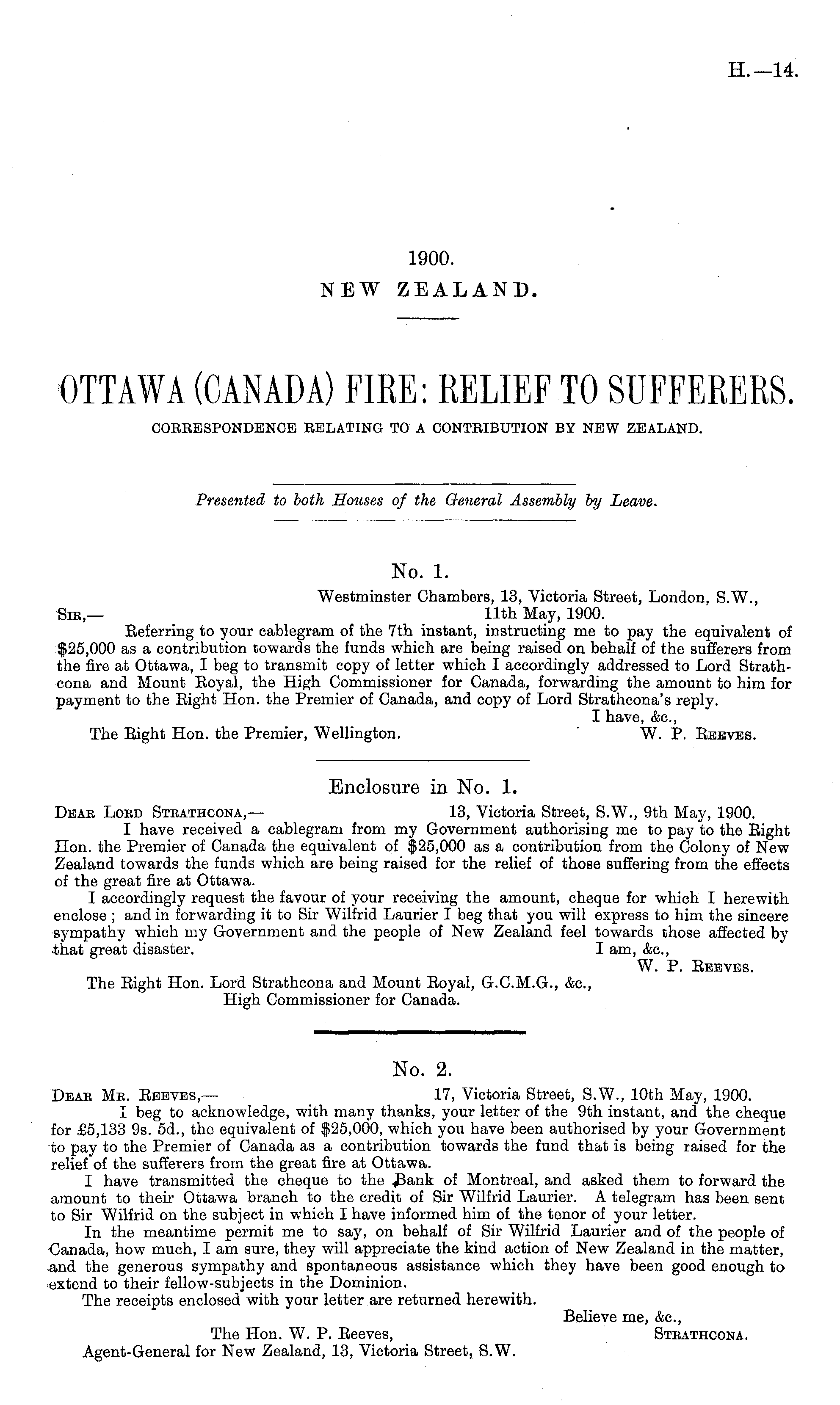 No. 1. Westminster Chambers, 13, Victoria Street, London, S.W., Sib,— 11th May, 1900. Eeferring to your cablegram of the 7th instant, instructing me to pay the equivalent of $25,000 as a contribution towards the funds which are being raised on behalf of the sufferers from the fire at Ottawa, I beg to transmit copy of letter which I accordingly addressed to Lord Strathcona and Mount Eoyal, the High Commissioner for Canada, forwarding the amount to him for payment to the Eight Hon. the Premier of Canada, and copy of Lord Strathcona's reply. I have, &c, The Eight Hon. the Premier, Wellington. W. P. Eeeves.