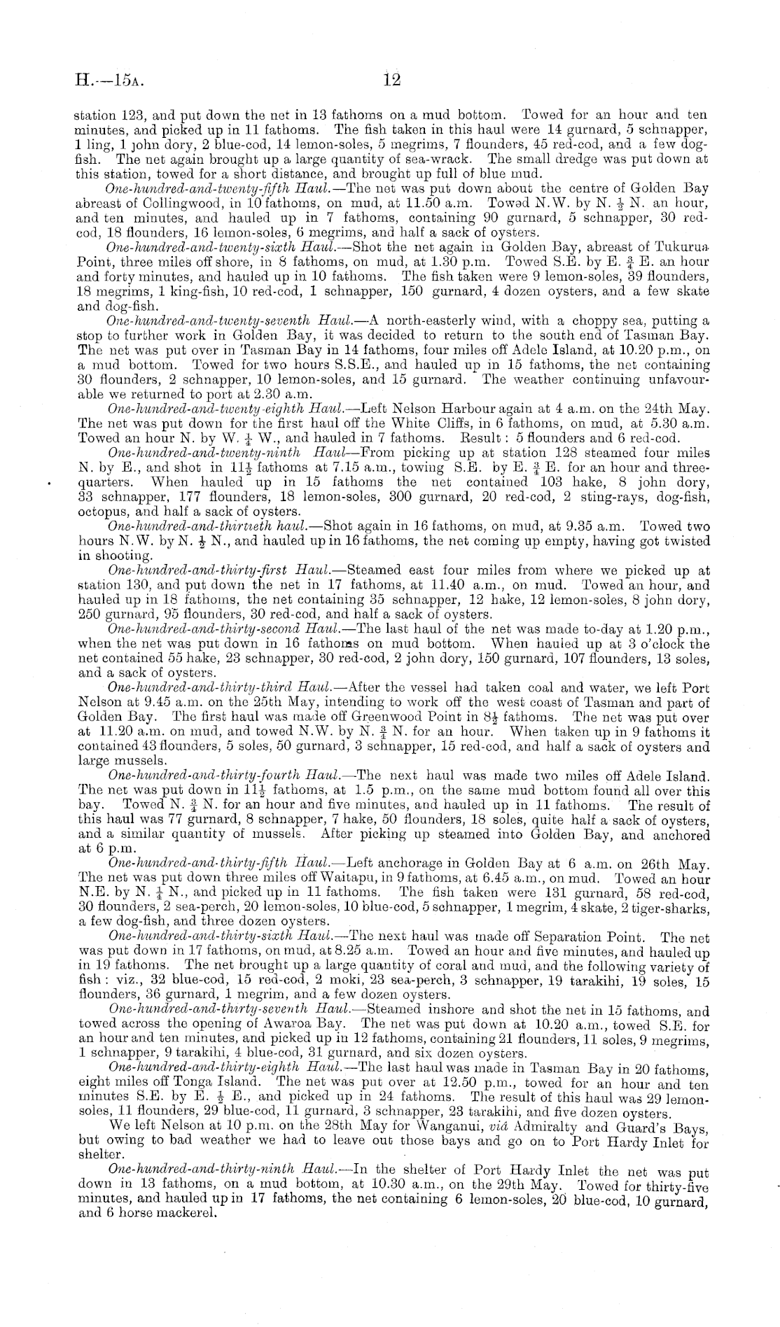 station 123, and put down the net in 13 fathoms on a mud bottom. Towed for an hour and ten minutes, and picked up in 11 fathoms. The fish taken in this haul were 14 gurnard, 5 schnapper, 1 ling, 1 john dory, 2 blue-cod, 14 lemon-soles, 5 megrims, 7 flounders, 45 red-cod, and a few dogfish. The net again brought up a large quantity of sea-wrack. The small dredge was put down at this station, towed for a short distance, and brought up full of blue mud. One-hundred-and-twenty-fifth Haul. —The net was put down about the centre of Golden Bay abreast of Collingwood, in 10 fathoms, on mud, at 11.50 a.m. Towad N.W. by N. \N. an hour, and ten minutes, and hauled up in 7 fathoms, containing 90 gurnard, 5 schnapper, 30 redcod, 18 flounders, 16 lemon-soles, 6 megrims, and half a sack of oysters. One-hundred-and-twenty-sixth Haul. —Shot the net again in Golden Bay, abreast of Tukurua Point, three miles offshore, in 8 fathoms, on mud, at 1.30 p.m. Towed S.E. by B. fB. an hour and forty minutes, and hauled up in 10 fathoms. The fish taken were 9 lemon-soles, 39 flounders, 18 megrims, 1 king-fish, 10 red-cod, 1 schnapper, 150 gurnard, 4 dozen oysters, and. a few skate and dog-fish. One-hundred-and-hventy-seventh Haul. —A north-easterly wind, with a choppy sea, putting a stop to further work in Golden Bay, it was decided to return to the south end of Tasman Bay. The net was put over in Tasman Bay in 14 fathoms, four miles off' Adele Island, at 10.20 p.m., on a mud bottom. Towed for two hours 8.5.8., and hauled up in 15 fathoms, the net containing 30 flounders, 2 schnapper, 10 lemon-soles, and 15 gurnard. The weather continuing unfavourable we returned to port at 2.30 a.m. One-hundred-and-twenty-eighth Haul. —Left Nelson Harbour again at 4 a.m. on the 24th May. The net was put down for the first haul off the White Cliffs, in 6 fathoms, on mud, at 5.30 a.m. Towed an hour N. by W, J W., and hauled in 7 fathoms. Eesult : 5 flounders and 6 red-cod. One-hundred-and-twenty-ninth Haul —From picking up at station 128 steamed four miles N. by E., and shot in fathoms at 7.15 a.m., towing S.B. by B. -| B. for an hour and threequarters. When hauled up in 15 fathoms the net contained 103 hake, 8 John dory, 33 schnapper, 177 flounders, 18 lemon-soles, 300 gurnard, 20 red-cod, 2 sting-rays, dog-fish, octopus, and half a sack of oysters. One-hundred-and-thimeih haul. —Shot again in 16 fathoms, on mud, at 9.35 a.m. Towed two hours N.W. by N. -J N., and hauled up in 16 fathoms, the net coming up empty, having got twisted in shooting. One-hundred-and-thirty-first Haul. —Steamed east four miles from where we picked up at station 130, and put down the net in 17 fathoms, at 11.40 a.m., on mud. Towed an hour, and hauled up in 18 fathoms, the net containing 35 schnapper, 12 hake, 12 lemon-soles, 8 John dory, 250 gurnard, 95 flounders, 30 red-cod, and half a sack of oysters. One-hundred-and-thirty-second Haul. —The last haul of the net was made to-day at 1.20 p.m., when the net was put down in 16 fathoms on mud bottom. When hauled up at 3 o'clock the net contained 55 hake, 23 schnapper, 30 red-cod, 2 John dory, 150 gurnard, 107 flounders, 13 soles, and a sack of oysters. One-hundred-and-thirty-third Haul. —After the vessel had taken coal and water, we left Port Nelson at 9.45 a.m. on the 25th May, intending to work off the west coast of Tasman and part of Golden Bay. The first haul was made off Greenwood Point in 8J fathoms. The net was put over at 11.20 a.m. on mud, and towed N.W. by N. fN. for an hour. When taken up in 9 fathoms it contained 43 flounders, 5 soles, 50 gurnard, 3 schnapper, 15 red-cod, and half a sack of oysters and large mussels. One-hundred-and-thirty-fourth Haul. —The next haul was made two miles off Adele Island. The net was put down in 11J fathoms, at 1.5 p.m., on the same mud bottom found all over this bay. Towed N. fN. for an hour and five minutes, and hauled up in 11 fathoms. The result of this haul was 77 gurnard, 8 schnapper, 7 hake, 50 flounders, 18 soles, quite half a sack of oysters, and a similar quantity of mussels. After picking up steamed into Golden Bay, and anchored at 6 p.m. One-hundred-and- thirty -fifth Haul. —Left anchorage in Golden Bay at 6 a.m. on 26th May. The net was put down three miles off Waitapu, in 9 fathoms, at 6.45 a.m., on mud. Towed an hour N.B. by N. J N., and picked up in 11 fathoms. The fish taken were 131 gurnard, 58 red-cod, 30 flounders, 2 sea-perch, 20 lemon-soles, 10 blue-cod, 5 schnapper, 1 megrim, 4 skate, 2 tiger-sharks, a few dog-fish, and three dozen oysters. One-hundred-and-thirty-sixth Haul. —The next haul was made off Separation Point. The net was put down in 17 fathoms, on mud, at 8.25 a.m. Towed an hour and five minutes, and hauled up in 19 fathoms. The net brought up a large quantity of coral and mud, and the following variety of fish : viz., 32 blue-cod, 15 red-cod, 2 moki, 23 sea-perch, 3 schnapper, 19 tarakihi, 19 soles, 15 flounders, 36 gurnard, 1 megrim, and a few dozen oysters. One-hundred-and-tMrty-seventh Haul. —Steamed inshore and shot the net in 15 fathoms, and towed across the opening of Awaroa Bay. The net was put down at 10.20 a.m., towed S.E. for an hour and ten minutes, and picked up in 12 fathoms, containing 21 flounders, 11 soles, 9 megrims, 1 schnapper, 9 tarakihi, 4 blue-cod, 31 gurnard, and six dozen oysters. One-hundred-and-thirty-eighth Haul. —The last haul was made in Tasman Bay in 20 fathoms, eight miles off Tonga Island. The net was put over at 12.50 p.m., towed for an hour and ten minutes S.E. by E. -| E., and picked up in 24 fathoms. The result of this haul was 29 lemonsoles, 11 flounders, 29 blue-cod, 11 gurnard, 3 schnapper, 23 tarakihi, and five dozen oysters. We left Nelson at 10 p.m. on the 28th May for Wanganui, vid Admiralty and Guard's Bays, but owing to bad weather we had to leave out those bays and go on to Port Hardy Inlet for shelter. One-hundred-and-thirty-ninth Haul. —ln the shelter of Po
