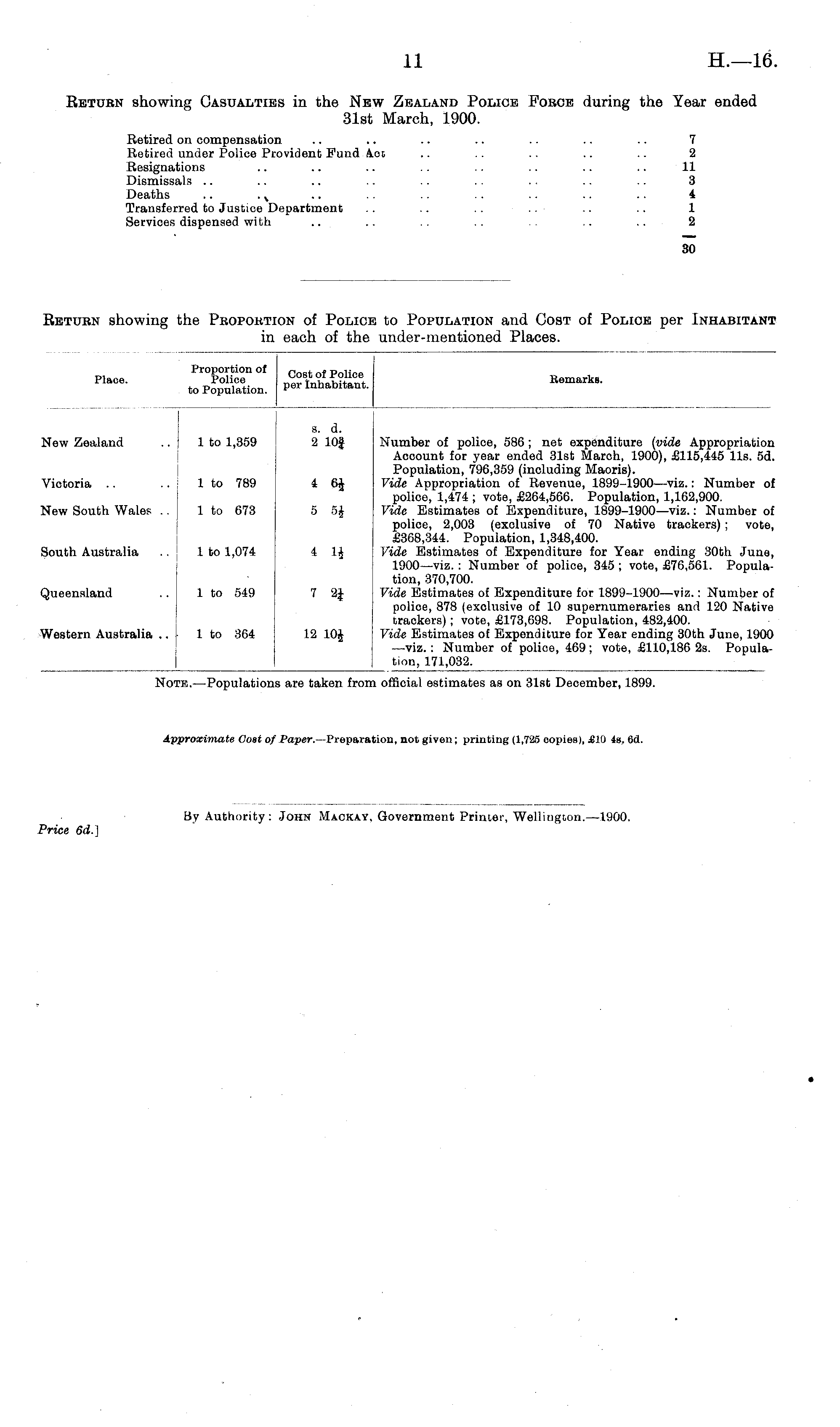 Keturn showing Casualties in the New Zealand Police Force during the Year ended 31st March, 1900. Retired on compensation .. .. .. .. .. .. .. 7 Retired under Police Provident Fund Aot .. .. .. .. .. 2 Resignations .. .. .. .. .. .. .. .. 11 Dismissals .. .. .. .. .. .. .. .. .. 3 Deaths .. . v .. .. .. .. .. 4 Transferred to Justice Department .. .. .. .. .. 1 Services dispensed with .. .. .. .. .. 2 30