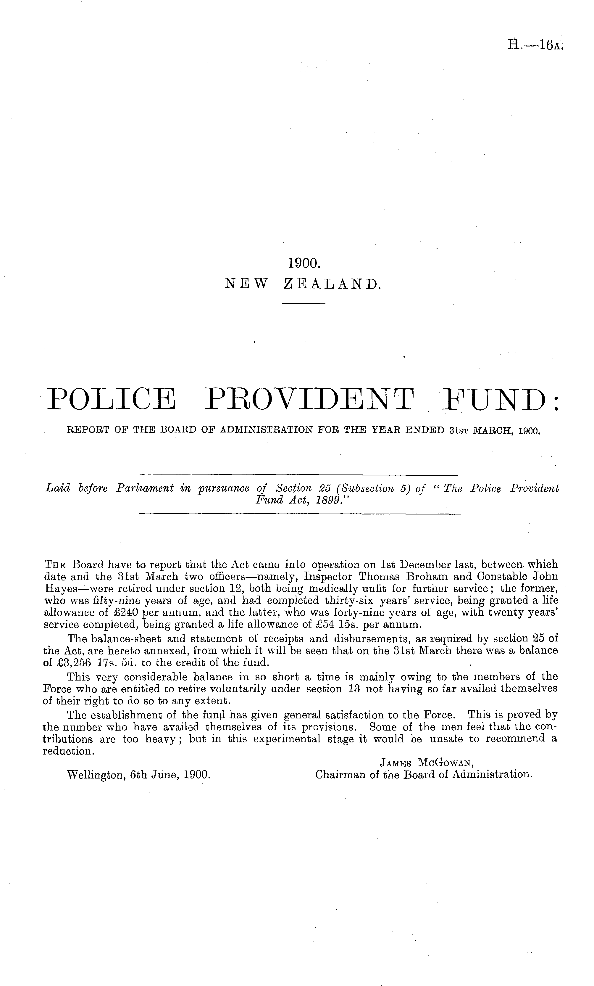 The Board have to report that the Act came into operation on Ist December last, between which date and the 31st March two officers—namely, Inspector Thomas Broham and Constable John Hayes—were retired under section 12, both being medically unfit for further service; the former, who was fifty-nine years of age, and had completed thirty-six years' service, being granted a life allowance of £240 per annum, and the latter, who was forty-nine years of age, with twenty years' service completed, being granted a life allowance of £54 15s. per annum. The balance-sheet and statemenb of receipts and disbursements, as required by section 25 of the Act, are hereto annexed, from which it will be seen that on the 31st March there was a balance of £3,256 17s. sd. to the credit of the fund. This very considerable balance in so short a time is mainly owing to the members of the Force who are entitled to retire voluntarily under section 13 not having so far availed themselves of their right to do so to any extent. The establishment of the fund has given general satisfaction to the Force. This is proved by the number who have availed themselves of its provisions. Some of the men feel that the contributions are too heavy ; but in this experimental stage it would be unsafe to recommend a reduction. James McGowan, Wellington, 6th June, 1900. Chairman of the Board of Administration.