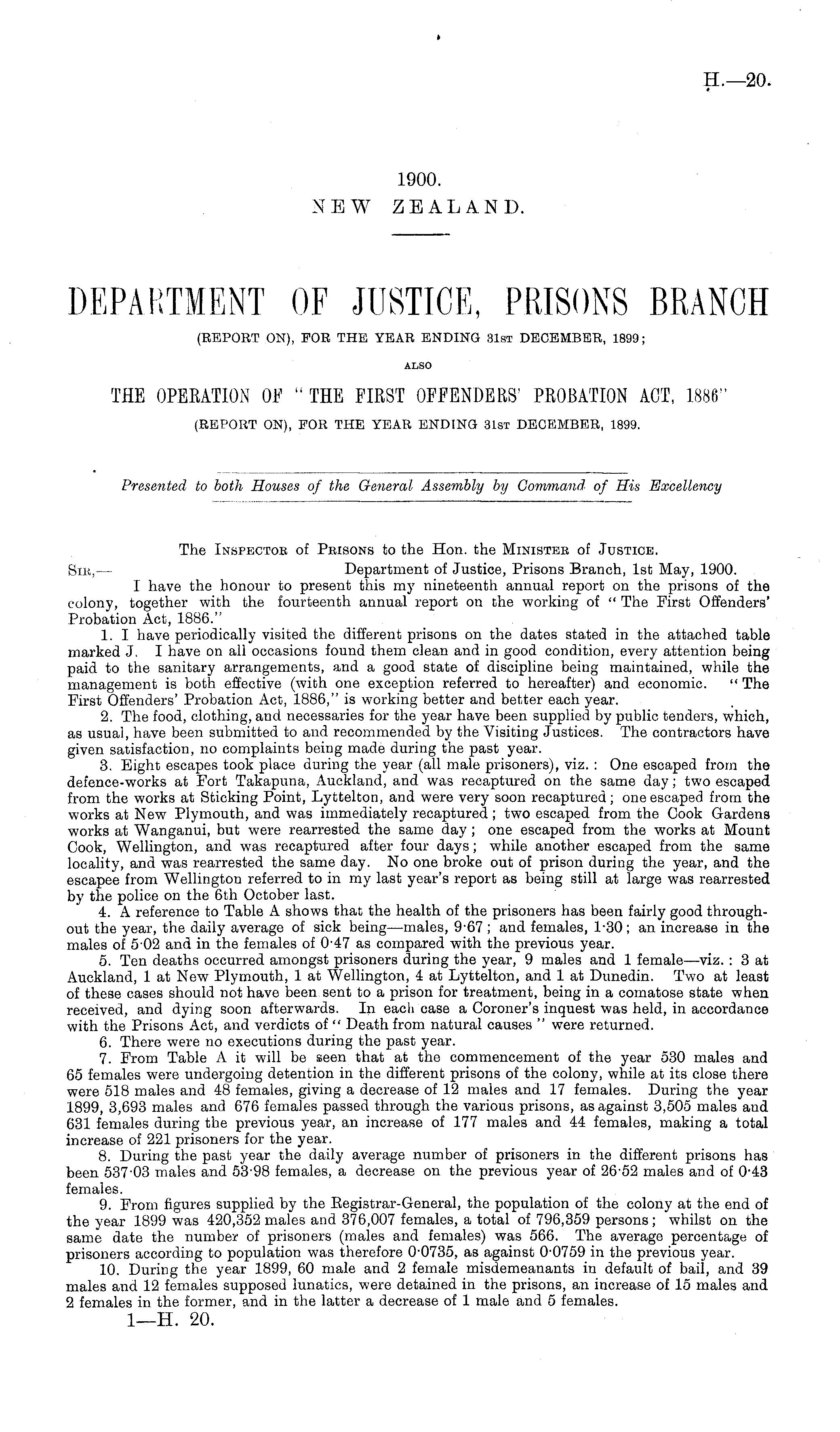 DEPARTMENT OF JUSTICE, PRISONS BRANCH (REPORT ON), FOR THE YEAR ENDING 31st DECEMBER, 1899; ALSO THE OPERATION OF "THE FIRST OFFENDERS' PROBATION ACT, 1886" (REPORT ON), FOR THE YEAR ENDING 31st DECEMBER, 1899.