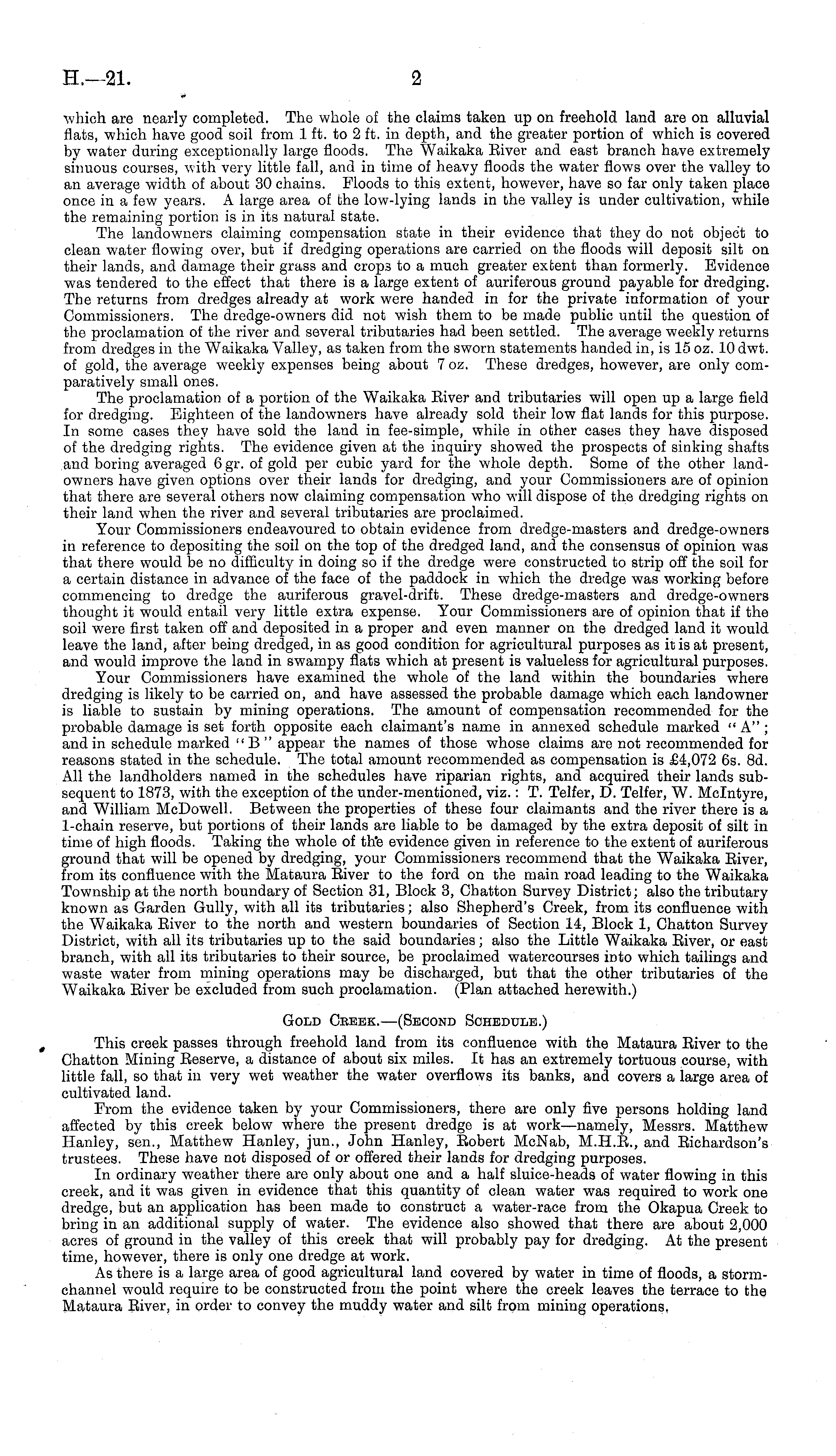 which are nearly completed. The whole of the claims taken up on freehold land are on alluvial flats, which have good soil from 1 ft. to 2 ft. in depth, and the greater portion of which is covered by water during exceptionally large floods. The Waikaka Eiver and east branch have extremely sinuous courses, with very little fall, and in time of heavy floods the water flows over the valley to an average width of about 30 chains. Floods to this extent, however, have so far only taken place once in a few years. A large area of the low-lying lands in the valley is under cultivation, while the remaining portion is in its natural state. The landowners claiming compensation state in their evidence that they do not object to clean water flowing over, but if dredging operations are carried on the floods will deposit silt on their lands, and damage their grass and crops to a much greater extent than formerly. Evidence was tendered to the effect that there is a large extent of auriferous ground payable for dredging. The returns from dredges already at work were handed in for the private information of your Commissioners. The dredge-owners did not wish them to be made public until the question of the proclamation of the river and several tributaries had been settled. The average weekly returns from dredges in the Waikaka Valley, as taken from the sworn statements handed in, is 15 oz. 10 dwt. of gold, the average weekly expenses being about 7 oz. These dredges, however, are only comparatively small ones. The proclamation of a portion of the Waikaka Eiver and tributaries will open up a large field for dredging. Eighteen of the landowners have already sold their low flat lands for this purpose. In some cases they have sold the land in fee-simple, while in other cases they have disposed of the dredging rights. The evidence given at the inquiry showed the prospects of sinking shafts and boring averaged 6 gr. of gold per cubic yard for the whole depth. Some of the other landowners have given options over their lands for dredging, and your Commissioners are of opinion that there are several others now claiming compensation who will dispose of the dredging rights on their land when the river and several tributaries are proclaimed. Your Commissioners endeavoured to obtain evidence from dredge-masters and dredge-owners in reference to depositing the soil on the top of the dredged land, and the consensus of opinion was that there would be no difficulty in doing so if the dredge were constructed to strip off the soil for a certain distance in advance of the face of the paddock in which the dredge was working before commencing to dredge the auriferous gravel-drift. These dredge-masters and dredge-owners thought it would entail very little extra expense. Your Commissioners are of opinion that if the soil were first taken off and deposited in a proper and even manner on the dredged land it would leave the land, after being dredged, in as good condition for agricultural purposes as it is at present, and would improve the land in swampy flats which at present is valueless for agricultural purposes. Your Commissioners have examined the whole of the land within the boundaries where dredging is likely to be carried on, and have assessed the probable damage which each landowner is liable to sustain by mining operations. The amount of compensation recommended for the probable damage is set forth opposite each claimant's name in annexed schedule marked " A" ; and in schedule marked "B" appear the names of those whose claims are not recommended for reasons stated in the schedule. The total amount recommended as compensation is £4,072 6s. Bd. All the landholders named in the schedules have riparian rights, and acquired their lands subsequent to 1873, with the exception of the under-mentioned, viz.: T. Telfer, D. Telfer, W. Mclntyre, and William McDowell. Between the properties of these four claimants and the river there is a 1-chain reserve, but portions of their lands are liable to be damaged by the extra deposit of silt in time of high floods. Taking the whole of the evidence given in reference to the extent of auriferous ground that will be opened by dredging, your Commissioners recommend that the Waikaka Eiver, from its confluence with the Mataura Eiver to the ford on the main road leading to the Waikaka Township at the north boundary of Section 31, Block 3, Chatton Survey District; also the tributary known as Garden Gully, with all its tributaries; also Shepherd's Creek, from its confluence with the Waikaka Eiver to the north and western boundaries of Section 14, Block 1, Chatton Survey District, with all its tributaries up to the said boundaries; also the Little Waikaka Eiver, or east branch, with all its tributaries to their source, be proclaimed watercourses into which tailings and waste water from mining operations may be discharged, but that the other tributaries of the Waikaka Eiver be excluded from such proclamation. (Plan attached herewith.) Gold Creek.—(Second Schedule.) # This creek passes through freehold land from its confluence with the Mataura Eiver to the Chatton Mining Eeserve, a distance of about six miles. It has an extremely tortuous course, with little fall, so that in very wet weather the water overflows its banks, and covers a large area of cultivated land. From the evidence taken by your Commissioners, there are only five persons holding land affected by this creek below where the present dredge is at work—namely, Messrs. Matthew Hanley, sen., Matthew Hanley, jun., John Hanley, Bobert McNab, M.H.E., and Eichardson's trustees. These have not disposed of or offered their lands for dredging purposes. In ordinary weather there are only about one and a half sluice-heads of water flowing in this creek, and it was given in evidence that this quantity of clean water was required to work one dredge, but an application has been made to construct a water-race from the Okapua Creek to bring in an additiona