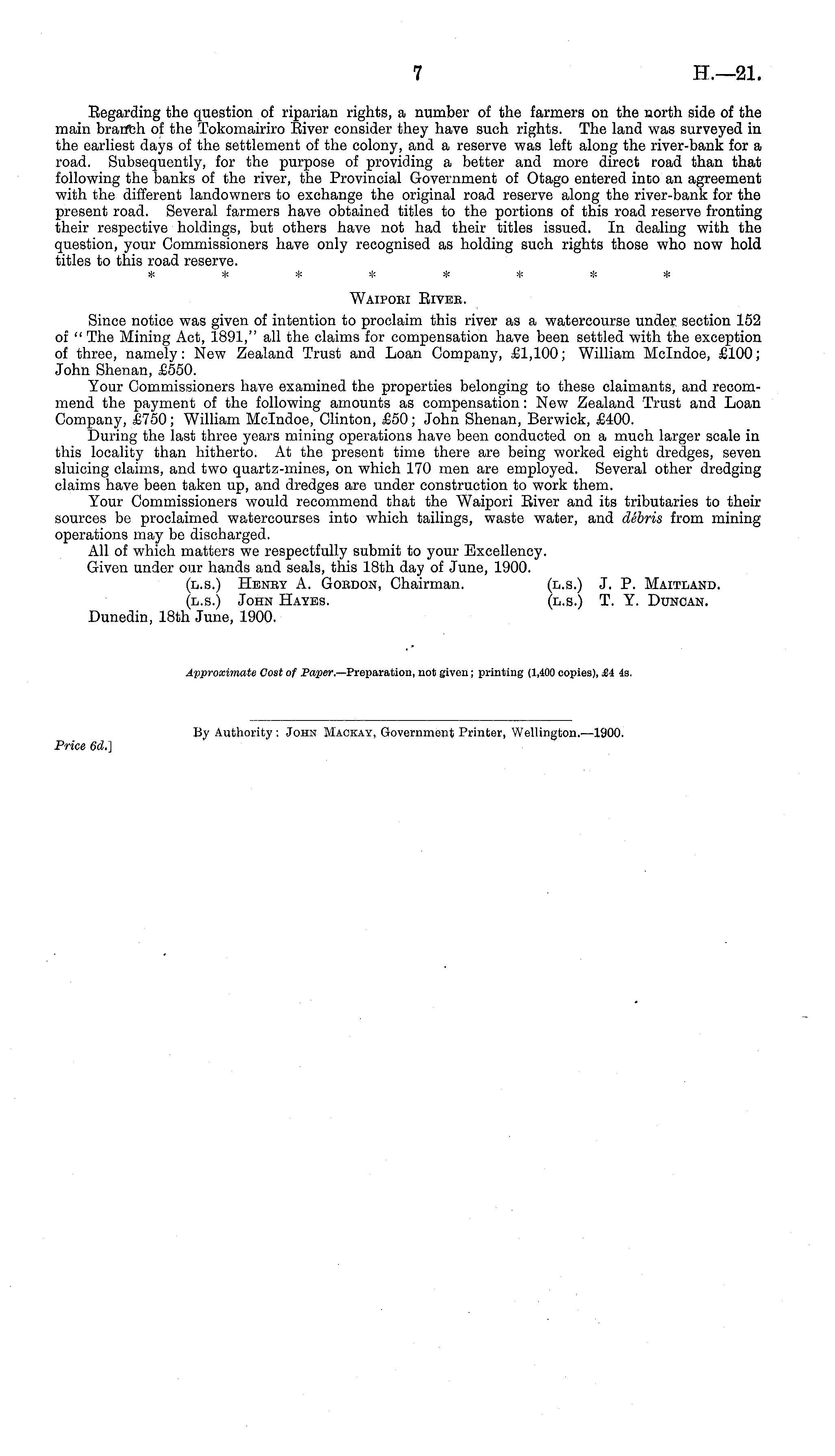 Regarding the question of riparian rights, a number of the farmers on the north side of the main branch of the Tokomairiro Biver consider they have such rights. The land was surveyed in the earliest days of the settlement of the colony, and a reserve was left along the river-bank for a road. Subsequently, for the purpose of providing a better and more direct road than that following the banks of the river, the Provincial Government of Otago entered into an agreement with the different landowners to exchange the original road reserve along the river-bank for the present road. Several farmers have obtained titles to the portions of this road reserve fronting their respective holdings, but others have not had their titles issued. In dealing with the question, your Commissioners have only recognised as holding such rights those who now hold titles to this road reserve. * * * * * * :!< % Waipoei Eivee. Since notice was given of intention to proclaim this river as a watercourse under, section 152 of " The Mining Act, 1891," all the claims for compensation have been settled with the exception of three, namely: New Zealand Trust and Loan Company, £1,100; William Mclndoe, £100; John Shenan, £550. Your Commissioners have examined the properties belonging to these claimants, and recommend the payment of the following amounts as compensation: New Zealand Trust and Loan Company, £750; William Mclndoe, Clinton, £50; John Shenan, Berwick, £400. During the last three years mining operations have been conducted on a much larger scale in this locality than hitherto. At the present time there are being worked eight dredges, seven sluicing claims, and two quartz-mines, on which 170 men are employed. Several other dredging claims have been taken up, and dredges are under construction to work them. Your Commissioners would recommend that the Waipori Eiver and its tributaries to their sources be proclaimed watercourses into which tailings, waste water, and debris from mining operations may be discharged. All of which matters we respectfully submit to your Excellency. Given under our hands and seals, this 18th day of June, 1900. (1.5.) Henby A. Gobdon, Chairman. (1.5.) J. P. Maitland. (ii.s.) John Hayes. (1.5.) T. Y. Duncan. Dunedin, 18th June, 1900.