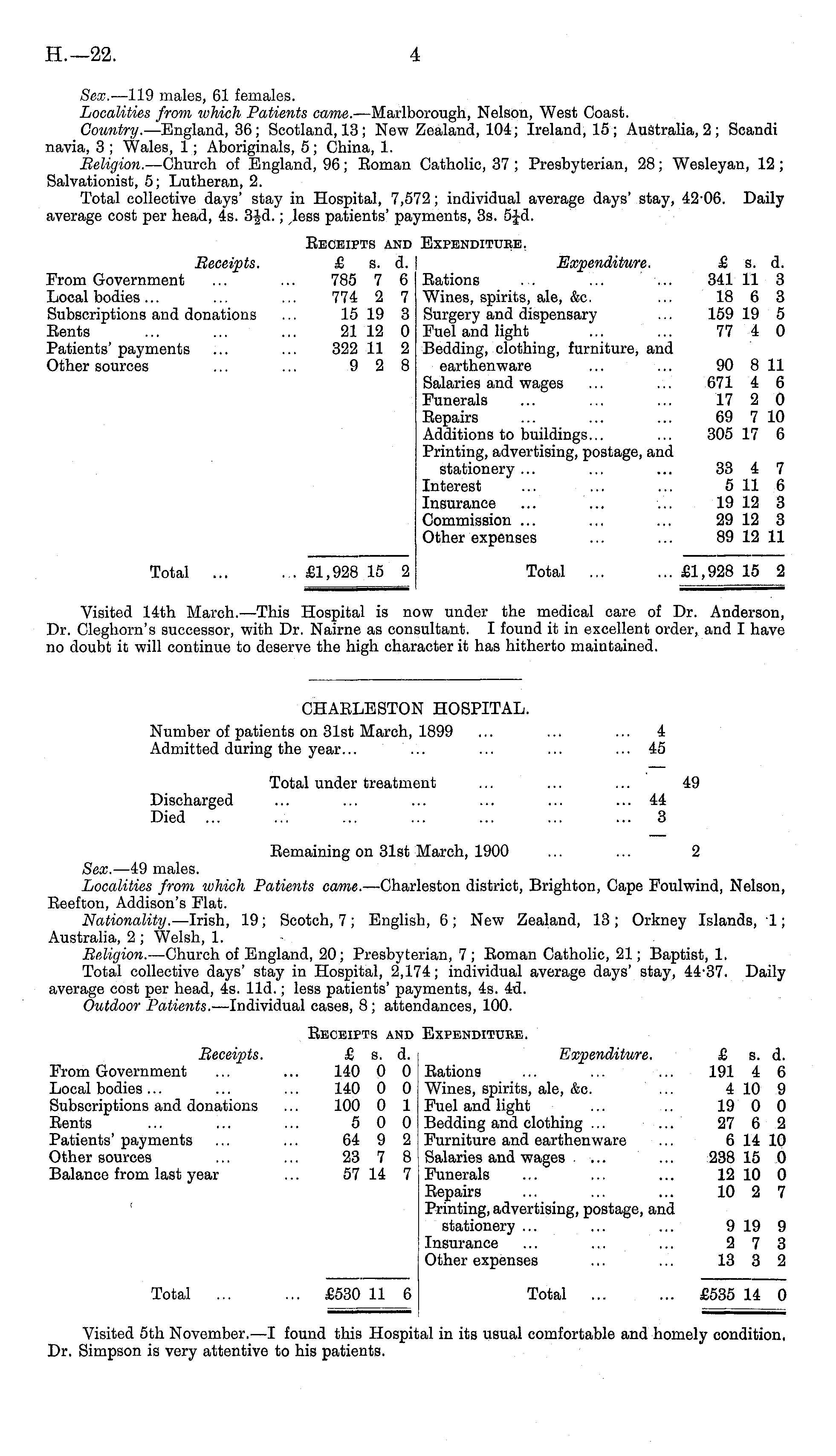 CHARLESTON HOSPITAL. Number of patients on 31st March, 1899 ... ... ... 4 Admitted during the year... ... ... ... ... 45 Total under treatment ... ... ... 49 Discharged ... ... ... ... ... ... 44 Died ... ... ... ... ... ... ... 3 Eemaining on 31st March, 1900 ... ... 2 Sex. —49 males. Localities from which Patients came. —Charleston district, Brighton, Cape Foulwind, Nelson, Eeefton, Addison's Flat. Nationality. —lrish, 19; Scotch, 7 ; English, 6; New Zealand, 13 ; Orkney Islands, 1; Australia, 2 ; Welsh, 1. Religion. —Church of England, 20; Presbyterian, 7 ; Eoman Catholic, 21; Baptist, 1. Total collective days' stay in Hospital, 2,174; individual average days' stay, 44-37. Daily average cost per head, 4s. lid.; less patients' payments, 4s. 4d. Outdoor Patients. —lndividual cases, 8 ; attendances, 100. Receipts and Expenditure. Beceipts. £ s. d. Expenditure. £ s. d. From Government ... ... 140 0 0 Eations ... ... ... 191 4 6 Local bodies... ... ... 140 0 0 Wines, spirits, ale, &c. ... 4 10 9 Subscriptions and donations ... 100 0 1 Fuel and light ... .. 1900 Eents ... ... ... 5 0 0 Bedding and clothing ... ... 27 6 2 Patients' payments ... ... 64 9 2 Furniture and earthenware ... 614 10 Other sources ... ... 23 7 8 Salaries and wages ... ... 238 15 0 Balance from last year ... 57 14 7 Funerals ... ... ... 12 10 0 Eepairs ... ... ... 10 2 7 Printing, advertising, postage, and stationery ... ... ... 9 19 9 Insurance ... ... ... 273 Other expenses ... ... 13 3 2 Total ... ... £530 11 6 Total ... ... £535 14 0 Visited sth November.—l found this Hospital in its usual comfortable and homely condition, Dr. Simpson is very attentive to his patients.