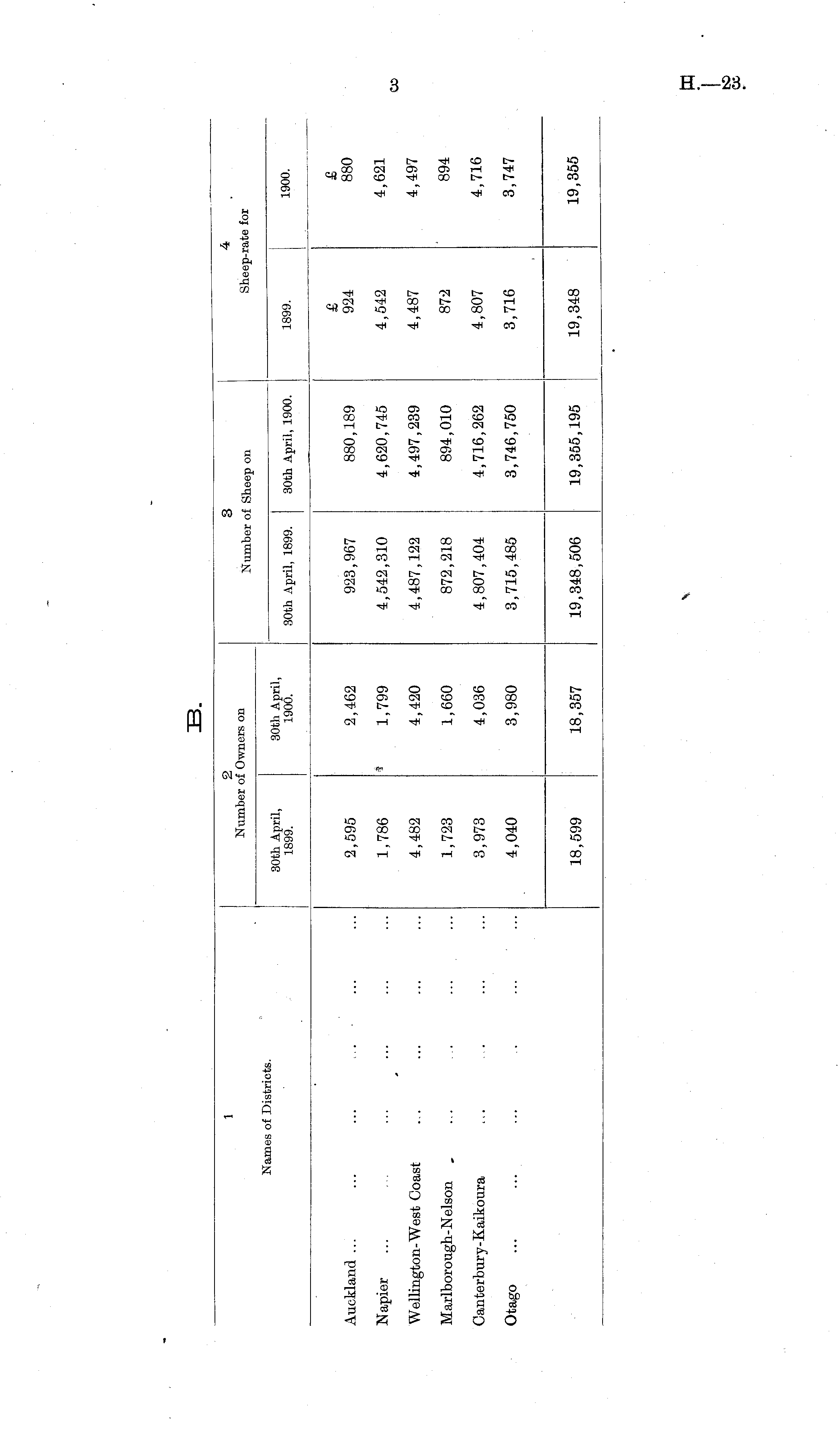 1 2 Number of Owners on 3 4 Number of Sheep on Sheep-rate for Names of Districts. 30th April, 1899. 30th April, 1900. 1900. 30th April, 1899. 30th April, 1900. 1899. Auckland ... 2,595 2,462 923,967 880,189 £ 924 £ 880 Napier 1,786 1,799 4,542,310 4,620,745 4,542 4,621 Wellington- West Coast 4,482 4,420 4,487,122 4,497,239 4,487 4,497 Marlborough-Nelson 1,723 1,660 872,218 894,010 872 894 Canterbury-Kaikoura 3,973 4,036 4,807,404 4,716,262 4,807 4,716 Otago 4,040 3,980 3,715,485 3,746,750 3,716 3,747 18,599 18,357 19,348,506 19,355,195 19,348 19,355
