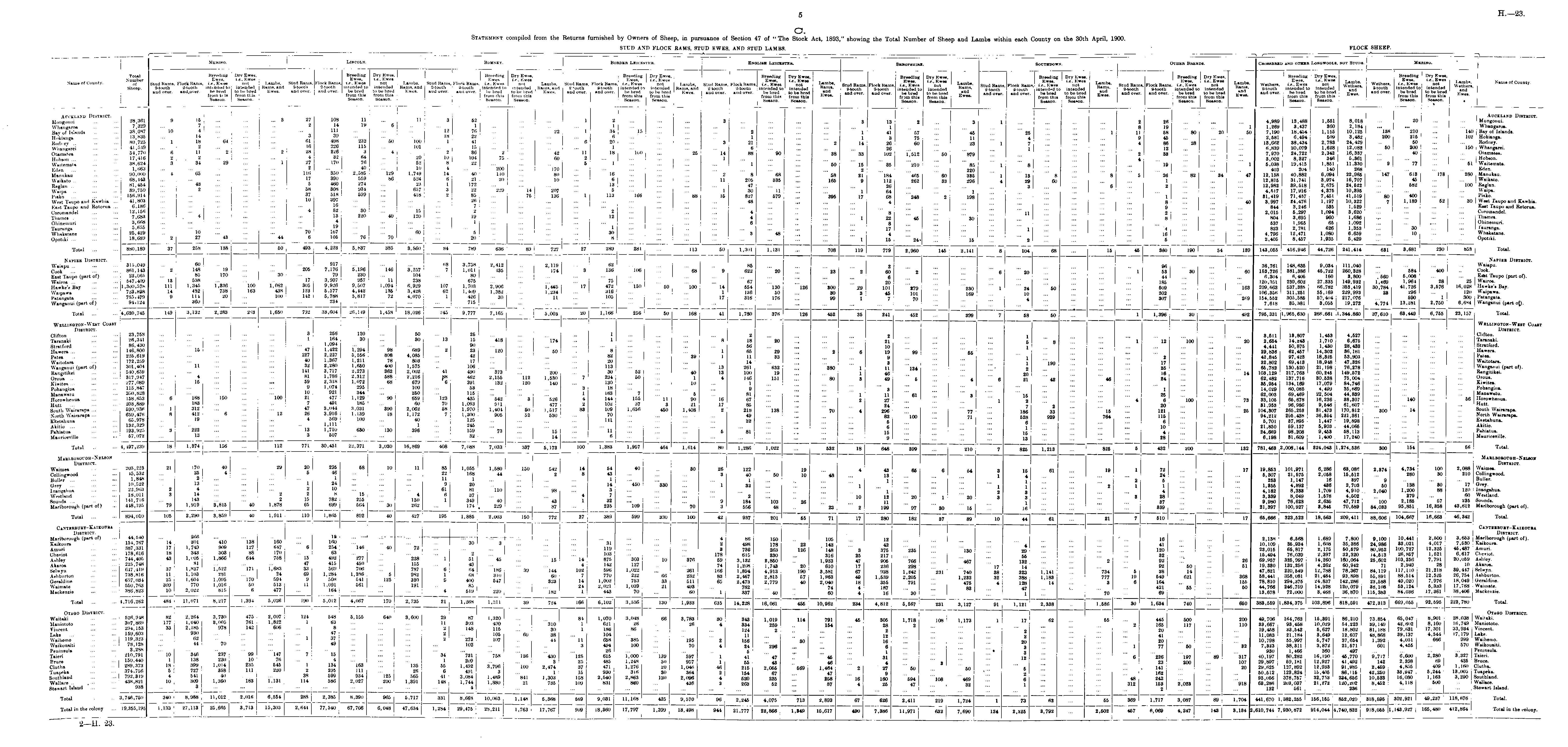 Statement compiled from the Returns furnished by Owners of Sheep, in pursuance of Section 4 r STUD AND FLOCK BAMS, STOD EWES, AND STU: v 1. of "The Stock Act, 1893, ," showing the Total Number of Sheep and Lai mbs within each County on the 30th April, 1900. LAMBS. FLOCK SHEEP. Merino. Lixcoln. Eomney. Border Leicester. Engi Breeding Dry Ewes, i Breeding Dry Ewes, Breeding Dry Ewes, Breeding Dry Ewes Ewes, le.,Ewes j Ewes, i.e., Ewes Ewes i.e., Ewes Ewes ie Ewes Stud Rams, Flock Earns, i.e., Kwes not ! Lambs, Stud Rains, Floek Rams i.e., Ewes not Lambs, Stud Rams, Flock Italic, U.,Y.wm not Lambs, Stud Rams, Flock Rains, i.e., Ewos not Lambs StiulEams, Flock i;;uus, 2-tooth 2-r,oOth intended to intended Rams, and 2-tooth 2-tooth intended to intended Rams, and 2-tootll 2-tooth intended to mteudod Rams, and -2-tooth 2-tootb im.cndedt' intended Kan,sand L! tooth and over. ando\er. be bred to be bred Ewes. and over. and over. be bred to be bred Ewes. and over. and over. be bred to be bred Ewes and over and over be bred to be bred Ewes and over and over from tnis from this ; from this from this from this from this from this from this Season. Season, i Season. Season. Season. Season. Season. Season. 9 15 ... ... ... 3 27 108 11 ... 11 3 52 12 3 7 ... ... ... 2 14 19 G ... ... 1 ... ... 1 10 4 ... ... ... ... Ill ... ... ... 12 76 ... .. 22 1 34 15 ... " 2 14 ... ... ... 3 39 ... ... ... 18 22 6 1 1 18 64 ... ... 61 498 232 50 100 1 41 6 20 ... 3 21 2 ... ... ... 16 226 115 ... 101 ... 15 ..1 6 6 11 2 ... 2 28 226 3 4 ... 2 36 2 ... " 42 11 18 100 ... '" 25 " 14 88 2 2 ... ... ... 4 32 64 ... 20 10 104 75 ... 60 2 ... ... . 1 3 34 29 ... 1 27 170 76 ... 52 8 22 5 1 ' 1 2 - 40 ... 10 4 ... 200 ... 'l70 ... ... ... ... '.'.'. 4 65 ... ... ... 111! 350 2,585 129 1,749 11 40 110 80 ... 16 2 " 8 17 390 559 86 524 6 21 20 10 ... 6 ... u 205 43 ... ... ... 5 460 274 ... 2a 1 172 ... ... ... 13 ... . 47 2 ... ... ... 58 308 934 ... 657 3 22 229 14 207 ... 5 ■■■ 1 30 37 518 699 ... 418 2 85 ... 75 136 1 113 166 " '" 88 15 827 10 397 ... ... ... ... 26 ! . .. .. ... 48 16 7 ::: ::: ::: 4 52 30 ... 15 J ... 2 ... ... 2 .... 4 4 ... ... ... ... 13 220 40 120 | ... 19 12 4 4 ... ... ... ... i ... .. ■" ... ... ... ■" ■■ e 19 ... ... ... ... ... ... ... ... 1 10 ... ... ... 70 167 ... ... 60 ! ... 5 30 "' a 2 27 43 ... 44 6 105 76 70 ... ... 20 ... ... "'. ... 8 ... ... .'.'. '". 37 258 138 ... 60 493 4,223 5,837 385 3,860 84 789 636 89 I 727 27 289 281 ... 113 50 1,301 60 .. ... ... ... 917 ... ... ... US 3,758 2,412 ... 2,119 :.. 62 ... .. 85 2 148 19 ... ... 205 7,176 5,196 146 3,257 7 1,011 435 174 3 136 106 68 9 622 85 170 ... 30 .. 79 230 ... 104 ... 80 13 538 ... ... ... 17 3,907 957 11 238 ... 675 75 '" 67 111 1,345 1,336 100 1,082 305 9,926 9,507 1,094 6,929 107 1,703 2,906 ... i"485 17 472 150 '" 50 "lOO '" 14 554 14 482 738 163 438 123 5,577 4,142 136 3,428 62 1,4*9 1 382 1 234 •■ 316 1 116 9 111 20 ... 100 142 5,788 5,817 72 4,070 1 426 30 11 105 17 316 360 ... ... ... ... 234 ... ... ... ... 715 149 3,132 2,283 213 1,650 792 33,604 26,149 1,458 18,026 245 9,777 7,165 .. 5,003 20 1,166 256 50 168 41 l^780 3 256 120 ... 50 ... 25 1 2 1 161 30 ... 30 13 15 '418 '.'.'. '"174 ... 1 ... '.'.'. '.'.'. '" 8 18 1,091 ... ... ... ... 90 ... ... ... ... 56 15 ... ... ... 17 1,422 1,294 98 689 2 23 120 ... "' 50 . 8 ... ... '" " 1 65 227 2,227 5,556 808 4,085 ... 42 .. 82 " 39 1 u 40 1,367 1,211 78 803 ... 17 ... 20 ... ' 14 11 ■•■ ... ... 32 2,280 1,650 400 1,575 ... 106 ... 113 ... ' 13 261 141 3,717 2,273 362 2,002 41 490 373 200 30 52 40 13 100 4 ... ... ... 81 1,786 2,312 588 2,216 88 462 2,155 112 1,530 7 234 50 ... 1 4 146 15 ... ... ... 59 2,318 1,072 68 679 6 391 132 120 140 ... 130 ... 10 . 1 9 1,074 295 ... 100 ... 53 3 18 ... 9 10 921 344 ... 260 ... 115 ... ." " 1 163 7 '" '" 5 '" 81 6 168 150 ... 100 21 477 1,129 90 659 123 435 542 I 3 "526 4 141 155 11 90 16 67 183 ... ... ... 7 491 185 ... 60 70 1,093 911 I 477 2 102 37 3 21 17 85 1 312 ... ... ... 47 3,044 3,031 390 2,062 58 1,970 1,404 50 1 517 83 109 1,656 450 1 408 2 218 8 412 6 ... 12 26 3,916 1,139 18 1,172 7 1,200 905 52 '530 ... 70 ... ' 19 19 ... ... ... 4 569 100 ... 40 ... 125 ... ... ... 141 ... ... ~, " 22 1,U1 ... ... 1 ... 245 3 222 ... ... ... 13 1,710 630 130 396 ... 159 73 15 . 11 ... 5 "' 81 13 •■ ■■■ - 3 5 °7 - - - ... 32 ... ::: il ... s ... ;;; ;;; 18 1,374 156 ... 112 771 30,451 22,371 3,030 16,869 408 7,088 7,033 337 '5,173 100 1,383 1,957 464 1,614 80 l^286 - ~ 21 170 40 ... 29 20 295 68 10 11 85 1,055 1,580 150 512 14 54 40 30 26 122 25 4 ... ... 5 46 ... ... ... 22 168 44 ... 2 8 43 ... " 3 40 2 ... ... ... ... 1 ... ... ... 11 1 ... ... ... 1 ... .. " 13 ... ... ... 1 24 ... ... ... 9 20 .14 450 330 1 32 2 4 ... ... ... 2 10 ... ... ... 61 81 110 . " 98 ... 3 3 14 ... ... 2 2 8 15 ... 4 6 37 4 7 '" 2 143 ... ... 2 15 782 255 ... 150 1 349 40 "" 43 1 32 ... 9 184 79 1,919 3,815 40 1,878 65 699 664 3(1 262 ... 174 , 229 ... 87 ... 235 109 '." '" 70 3 556 105 2,290 3,859 40 1,911 110 1,865 892 40 427 195 1,885 2,003 150 772~ 27 389 599 330 100 42 937~~ 266 ... ... ... ... 12 ... 4 8S 14 301 410 138 160 ... 160 ... ... ... ... 30 3 31 2 40a 17 1,749 909 127 647 6 254 116 40 72 119 3 ,,? 18 343 303 88 170 ... 63 ... ... ... .. 2 " 103 178 61° 43 1,005 1,866 644 758 15 492 277 ... 228 1 51 45 '.'.'. " 15 "' 14 875 303 '" 10 "376 59 3 132 81 ... ... ... 47 415 450 ... 155 ... 49 ... ... 4 142 127 . 74 l' 2 O8 37 1,827 1,522 171 1,683 33 569 706 ... 787 6 64 186 39 " 144 102 596 1,022 Z 261 166 1894 11 1,103 281 ... 24 69 1,284 1,386 5 982 1 68 310 60 7 770 222 66 232 83 2467 25 1,604 1,095 170 594 9 508 541 125 320 S 400 547 ... 323 14 1,002 753 33 511 65 2'473 309 770 1,016 50 513 11 1,091 661 ... 191 ... 85 24 2 021 1 039 21 493 782 10 2,022 815 6 477 ... 164 ... ... ... 4 519 220 '." "l82 1 443 70 ... 60 '" 1 337 484 11,071 8,217 1,394 5,026 Wo 2 . 735 « lTsil 39~" 724~ f66 M02 7 Tio