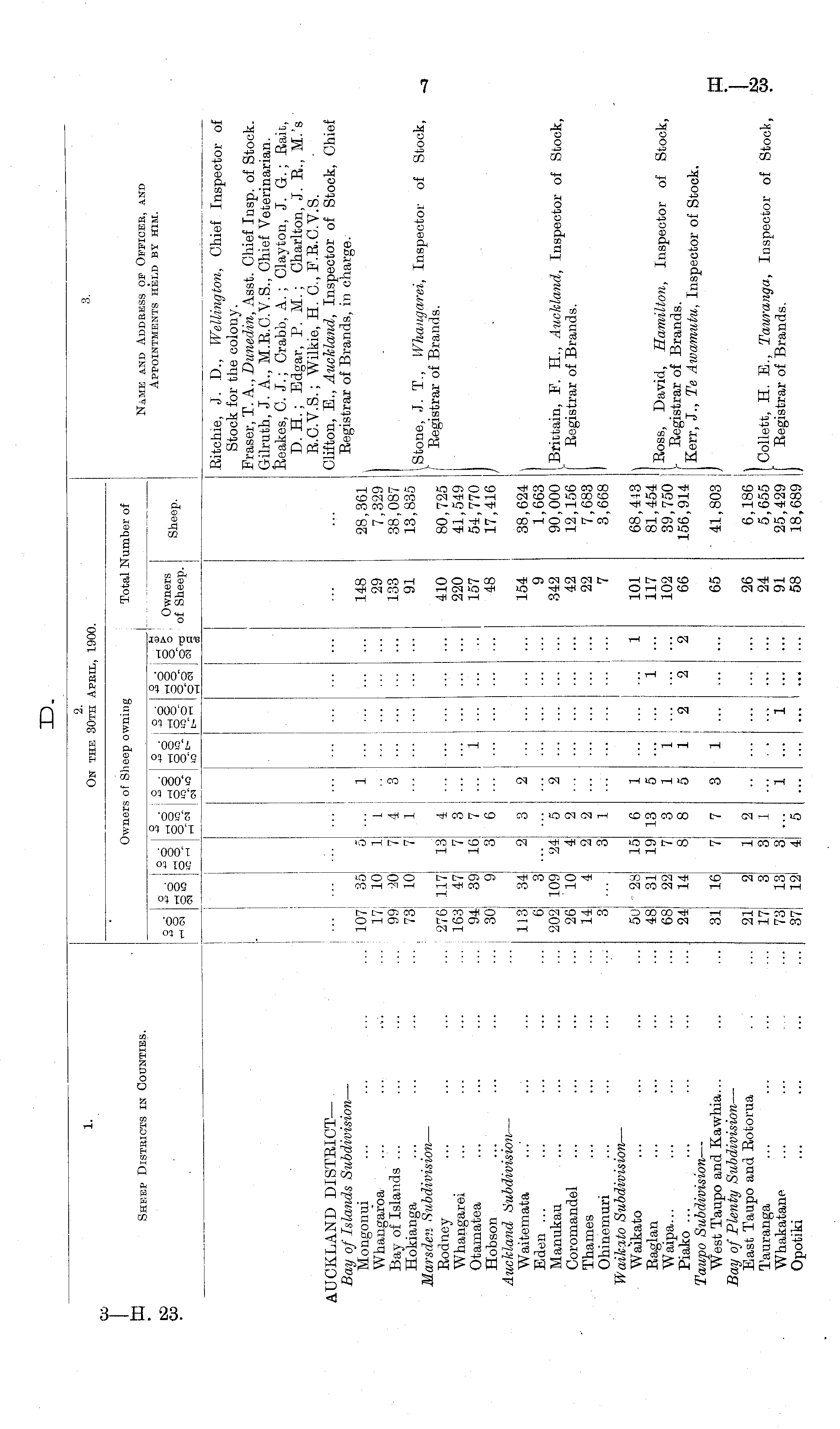 1. 2. On the 30th Apeil, 1900. 3. SSteEP Districts in Counties. Owners of Sheep owning Total Number of Name and Address op Offices, and Appointments held by him. 2d o -2 ° ° S ■ °o -4 0 j "" d "" d O.9. 4= Q ■" O _, O tH O o°. go o g Owners o"tJ of Sheep. ca Sheep. Bitchie, J. D., Wellington, Chief Inspector of Stock for the colony. Eraser, T. A., Dunedin, Asst. Chief Insp. of Stock. Gilruth, J. A., M.B.C.V.S., Chief Veterinarian. Beakes, C. J.; Crabb, A. ; Clayton, J. G.; Bait, D. H.; Edgar, P. M.; Charlton, J. B., M.'s B.C.V.S.; Wilkie, H. C, E.B.C.V.S. Clifton, E., Auckland, Inspector of Stock, Chief Begistrar of Brands, in charge. AUCKLAND DISTRICT— Bay of Islands Subdivision — Mongonui Whangaroa Bay of Islands ... Hokianga Marsden Subdivision — Boduey Wmangarei Otamatea Hobson Auckland Subdivision — Waitemata Eden ... Manukau Coromandel Thames Ohinemuri Waikato Subdivision — Waikato Eaglan Waipa... Piako ... Taupo Subdivision — West Taupo and Kawhia... Bay of Plenty Subdivision — East Taupo and Kotorua Tauranga Whakatane Opotiki ... 107 35 ... 17 10 ... 99 20 ... 73 10 ... 276| 117 ... : 163 47 ... ! 94: 39 ... 30i 9 113! 34 6 3 ... 202 109 ... 26 10 ... 14 4 3 ... ... 5u 28 ... 48 31 68 22 24 14 ... 31 16 ... 21 2 ... 17 3 ... 73 13 ... 37 12 5 1 71 13 16 3 2 24 4 2 3 1 4 1 4 3 7 6 3 5 2 2 1 2 2 1 3 "i 148 29 133 91 410 220 157 48 154 342 42 22 7 28,361 7,329 38,087 13,835 80,725 41,549 54,770 17,416 38,624 1,663 90,000 12,156 7,683 3,668 iStone, J. T., Whangarei, Inspector of Stock, j Begistrar of Brands. [Brittain, F. H., Auckland, Inspector of Stock, Begistrar of Brands. 15 19 7 8 6 13 3 8 1 5 1 5 i l "2 i 2 1 2 101 117 102 66 68,413 81,454 39,750 156,914 Boss, David, Hamilton, Inspector of Stock, - Begistrar of Brands. Kerr, J., Te Awamutu, Inspector of Stock. 7 7 3 l 65 41,803 1 3 3 4 2 1 1 i 26 24 91 58 6,186 5,655 25,429 18,689 Collett, H. E., Tauranga, Inspector of Stock, Begistrar of Brands. 5