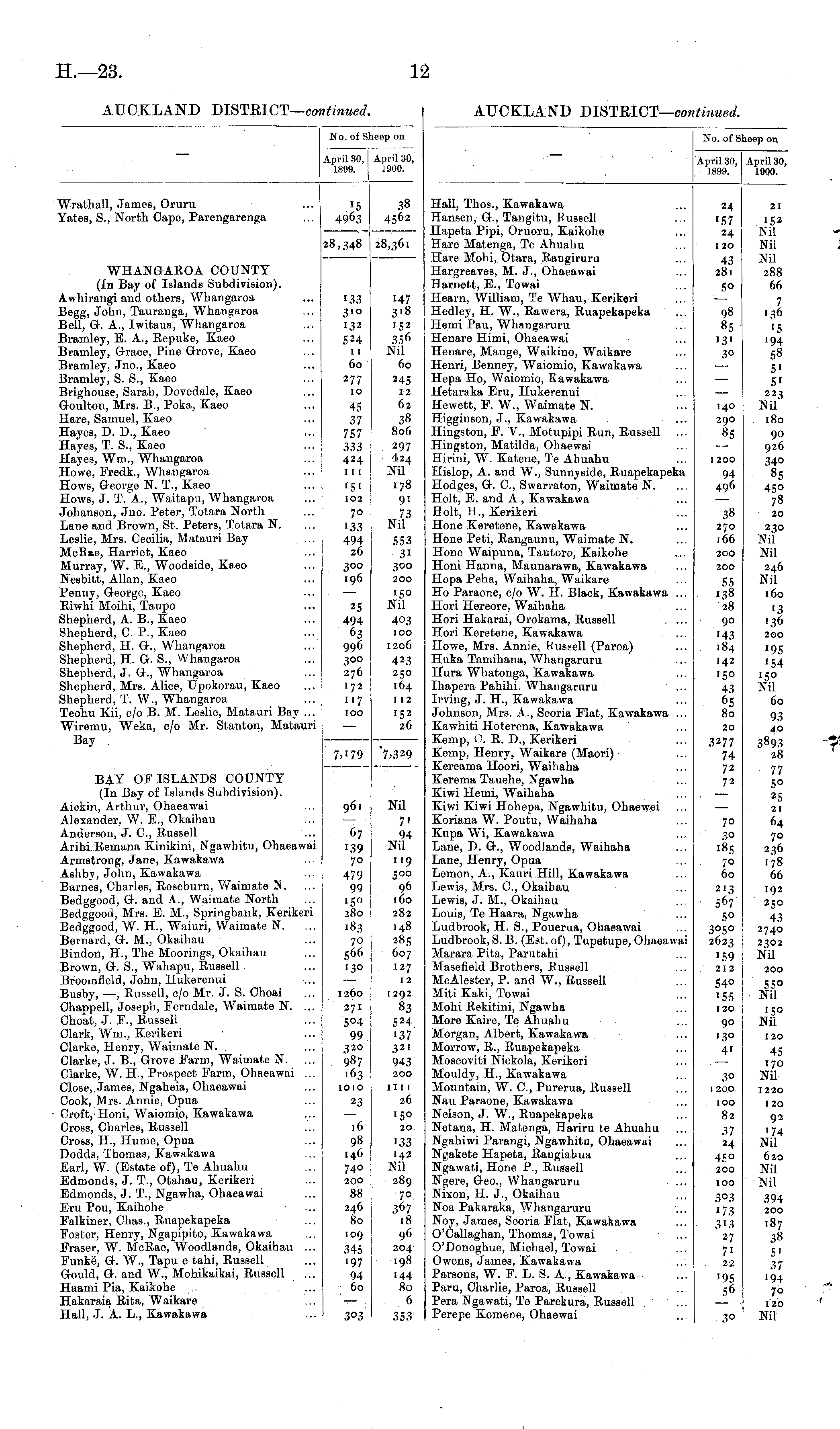 No. of Sheep on April 30, April 30, 1899. 1900. Wrathall, James, Oruru Yates, S., North Cape, Parengarenga '5 4903 28,348 38 45°2 28,361 WHANGAROA COUNTY (In Bay of Islands Subdivision). Awhirangi and others, Whangaroa Begg, John, Tauranga, Whangaroa Bell, G. A., Iwitaua, Whangaroa Bramley, E. A., Repuke, Kaeo Bramley, Grace, Pine Grove, Kaeo Bramley, Jno., Kaeo Bramley, S. S., Kaeo Brighouse, Sarah, Dovedale, Kaeo Goulton, Mrs. B., Poka, Kaeo Hare, Samuel, Kaeo Hayes, D. D., Kaeo Hayes, T. S., Kaeo Hayes, Wm., Whangaroa Howe, Fredk., Whangaroa Hows, George N. T., Kaeo Hows, J. T. A., Waitapu, Whangaroa Johanson, Jno. Peter, Totara North Lane and Brown, St. Peters, Totara N. Leslie, Mrs. Cecilia, Matauri Bay McRae, Harriet, Kaeo Murray, W. E., Woodside, Kaeo Nesbitt, Allan, Kaeo Penny, George, Kaeo Riwhi Moihi, Taupo Shepherd, A. B., Kaeo Shepherd, C. P., Kaeo Shepherd, H. G., Whangaroa Shepherd, H. G. S., Whangaroa Shepherd, J. G., Whangaroa Shepherd, Mrs. Alice, Upokorau, Kaeo Shepherd, T. W., Whangaroa Teohu Kii, c/o B. M. Leslie, Matauri Bay ... Wiremu, Weka, c/o Mr. Stanton, Matauri Bay 133 3'° 132 524 1 I 60 277 10 45 37 757 333 424 111 '5' 102 '47 3'8 '52 356 Nil 60 245 12 62 38 806 297 424 Nil 178 9' 73 Nil 70 '33 494 26 300 .96 553 3i 300 200 25 494 (>3 996 300 276 172 117 IOO 150 Nil 403 IOO 1206 423 250 164 I 12 152 26 7,179 '7»329 BAY OF ISLANDS COUNTY (In Bay of Islands Subdivision). Aiekin, Arthur, Ohaeawai Alexander, W. E., Okaihau Anderson, J. O, Russell AribiRemana Kinikini, Ngawhitu, Ohaeawai Armstrong, Jane, Kawakawa Ashby, John, Kawakawa Barnes, Charles, Roseburn, Waimate N. Bedggood, G. and A., Waimate North Bedggood, Mrs. E. M., Springbank, Kerikeri Bedggood, W. H., Waiuri, Waimate N. Bernard, G. M., Okaihau Bindon, H., The Moorings, Okaihau Brown, G. S., Wahapu, Russell Broomfleld, John, Hukerenui Busby, —, Russell, c/o Mr. J. S. Choal Chappell, Joseph, Ferndale, Waimate N. ... Choat, J. F., Russell Clark, Wm., Kerikeri Clarke, Henry, Waimate N. Clarke, J. B., Grove Farm, Waimate N. Clarke, W. H, Prospect Farm, Ohaeawai ... Close, James, Ngaheia, Ohaeawai Cook, Mrs. Annie, Opua Croft, Honi, Waiomio, Kawakawa Cross, Charles, Russell Cross, H, Hume, Opua Dodds, Thomas, Kawakawa Earl, W. (Estate of), Te Ahuahu Edmonds, J. T., Otahau, Kerikeri Edmonds, J. T., Ngawha, Ohaeawai Eru Pou, Kaihohe Falkiner, Chas., Ruapekapeka Foster, Henry, Ngapipito, Kawakawa Fraser, W. McRae, Woodlands, Okaihau ... Funke, G. W., Tapu e tahi, Russell Gould, G. and W., Mohikaikai, Russell Haami Pia, Kaikohe , ... Hakaraia Rita, Waikare Hall, J. A. L., Kawakawa 961 67 1.39 70 479 99 '5° 280 '83 70 566 130 1260 271 5°4 99 320 987 163 IOIO Nil 7' 94 Nil "9 500 96 160 282 148 285 607 127 12 1292 83 524 '37 321 943 200 23 1111 26 '5° 20 16 98 146 740 200 88 246 80 109 345 '97 94 60 '33 142 Nil 289 70 3«7 18 96 204 198 144 80 6 3°3 353