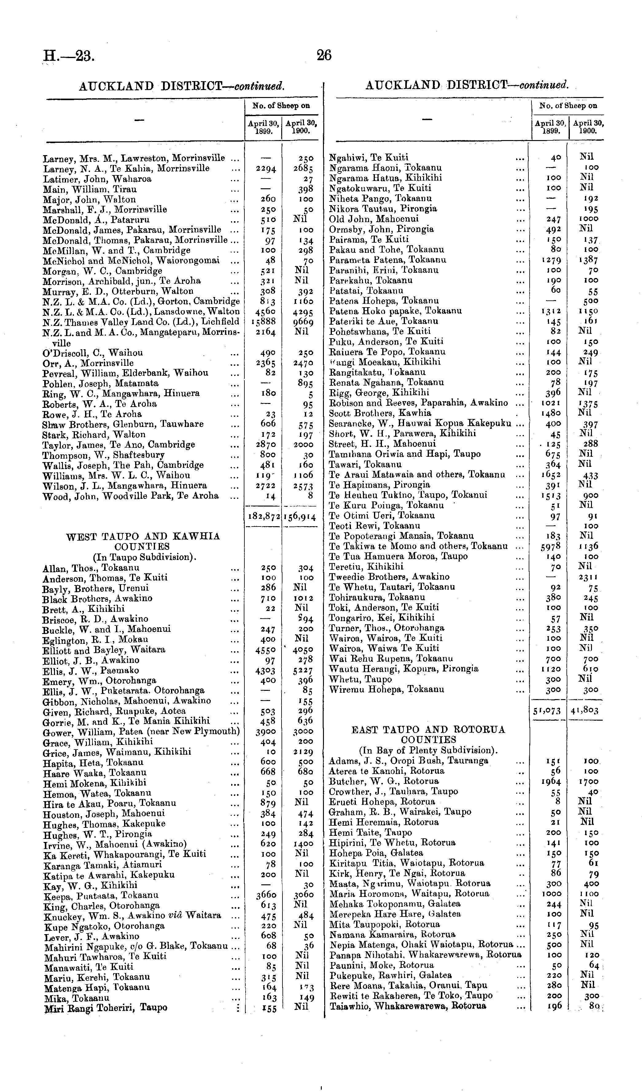 No. of Sheep on April 30, April 30, 1899. 1900. Ngahiwi, Te Kuiti Ngarama Haoni, Tokaanu Ngarama Hatua, Kihikihi Ngatokuwaru, Te Kuiti Niheta Pango, Tokaanu Nikora Tautau, Pirongia Old John, Mahoenui Ormsby, John, Pirongia Pairama, Te Kuiti Pakau and Tohe, Tokaanu Parameta Patena, Tokaanu Paranihi, Erini, Tokaanu Parekahu, Tokaanu Patatai, Tokaanu Patena Hohepa, Tokaanu Patena Hoko papake, Tokaanu Pateriki te Aue, Tokaanu Pohetawhana, Te Kuiti Puku, Anderson, Te Kuiti Raiuera Te Popo, Tokaanu Kangi Moeakau, Kihikihi Rangitakatu, tokaanu Renata Ngahana, Tokaanu Rigg, George, Kihikihi Robison and Reeves, Paparahia, Awakino ... Scott Brothers, Kawhia Searancke, W., Hauwai Kopua Kakepuku ... Short, W. 11., Parawera, Kihikihi Street, H. II., Mahoenui Tamihana Oriwia and Hapi, Taupo Tawari, Tokaanu Te Araui Matawaia and others, Tokaanu ... Te Hapimana, Pirongia Te Heuheu Tukino, Taupo, Tokanui Te Kuru Poinga, Tokaanu Te Otimi Ueri, Tokaanu Teoti Rewi, Tokaanu Te Popoterangi Manaia, Tokaanu Te Takiwa te Momo and others, Tokaanu ... Te Tua Hamuera Moroa, Taupo Teretiu, Kihikihi Tweedie Brothers, Awakino Te Whetu, Tautari, Tokaanu Tohiraukura, Tokaanu Toki, Anderson, Te Kuiti Tongariro, Kei, Kihikihi Turner, Thos., Otorohanga Wairoa, Wairoa., Te Kuiti Wairoa, Waiwa Te Kuiti Wai Rehu Rupena, Tokaanu Wautu Herangi, Kopura, Pirongia Whetu, Taupo Wiremu Hohepa, Tokaanu 40 100 100 247 492 '5° 80 1279 IOO 190 60 1312 145 82 IOO '44 IOO 200 78 396 1021 1480 400 45 ■ 125 675 364 1652 39' '5'3 5' 97 Nil IOO Nil Nil 192 '95 IOOO Nil '37 IOO '387 70 IOO 55 500 1150 161 Nil '5° 249 Nil '75 '97 Nil '375 Nil 397 Nil 288 Nil Nil 433 Nil 900 Nil 183 5978 140 70 9' 100 Nil 1 136 100 Nil 92 38° 100 57 253 100 2311 75 245 100 Nil 350 Nil Nil 700 610 Nil 300 IOO 700 1120 300 300 EAST TAUPO AND ROTORUA COUNTIES (In Bay of Plenty Subdivision). Adams, J. S., Oropi Bush, Tauranga Aterea te Kanohi, Rotorua Butcher, W. G., Rotorua Crowther, J., Tauhara, Taupo Erueti Hohepa, Rotorua Graham, R. B., Wairakei, Taupo Hemi Heremaia, Rotorua Hemi Taite, Taupo Hipirini, Te Whetu, Rotorua Hohepa Poia, Galatea Kiritapu Titia, Waiotapu, Rotorua Kirk, Henry, Te Ngai, Rotorua Maata, Ngirimu, Waiotapu Rotorua Maria Horomona, Waitapu, Rotorua Mehaka Tokoponamu, Galatea Merepeka Hare Hare, Oalatea Mita Taupopoki, Rotorua Namana Kamaraira, Rotorua Nepia Matenga, Ohaki Waiotapu, Rotorua ... Panapa Nihotahi, Whakarewarewa, Rotorua Paunini, Moke, Rotorua Pukepuke, Rawhiri, Galatea Rere Moana, Takahia, Oranui. Tapu Rewiti te Rakaherea, Te Toko, Taupo Taiawhio, Whakarewarewa, Rotorua 5',°73 41,803 100 '5' 56 1964 55 8 100 1700 40 Nil Nil Nil 5° 21 200 '5° 100 '5° 61 141 »5° 77 86 300 IOOO 79 400 1100 Nil Nil 95 Nil Nil 120 64 Nil Nil 244 IOO 117 250 50° IOO 50 220 280 200 .96 300 80.