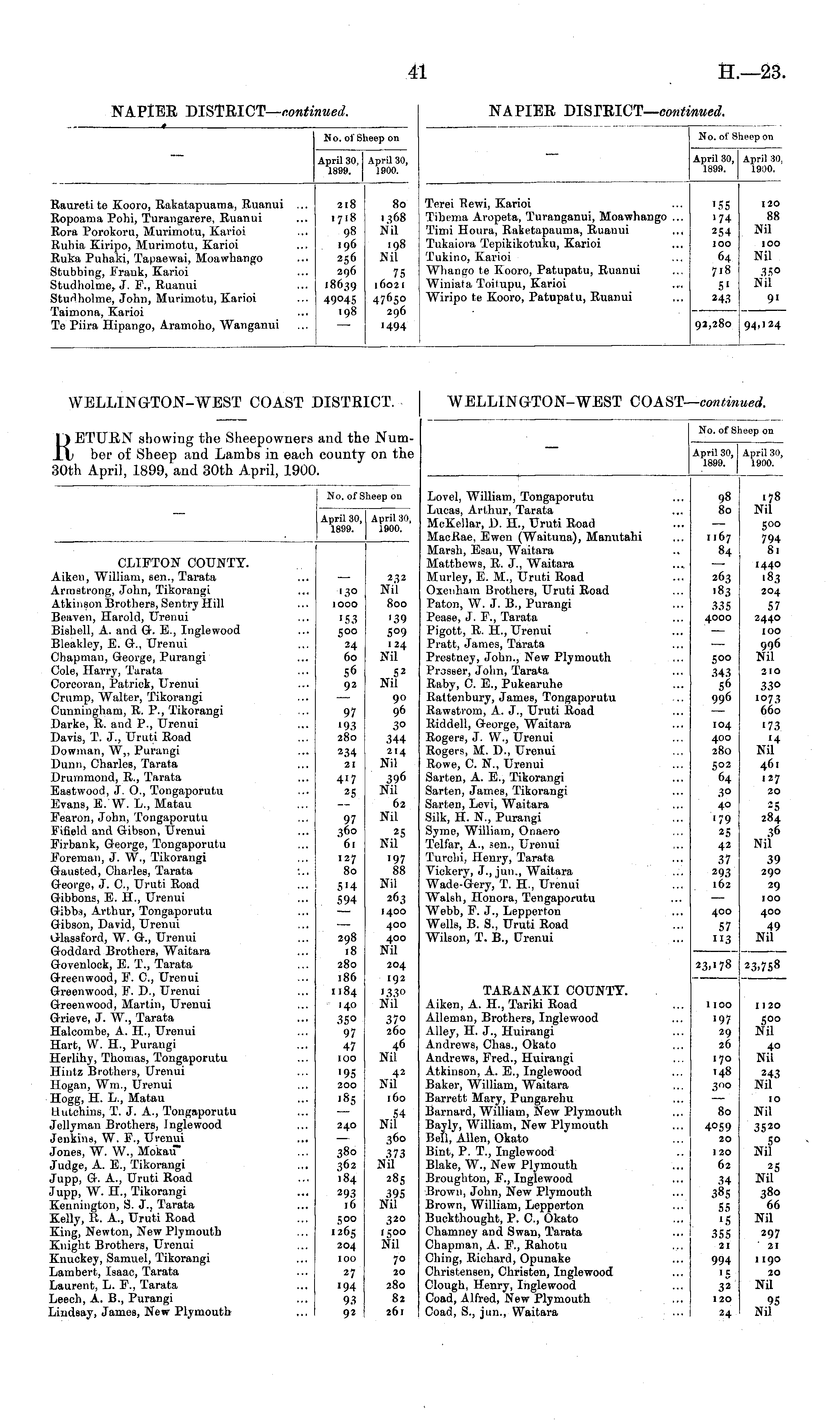No. of Sheep on April 30, April 30, 1899. 1900. Terei Rewi, Karioi Tihema Aropeta, Turanganui, Moawhango ... Timi Houra, Raketapauma, Ruanui Tukaiora Tepikikotuku, Karioi Tukino, Karioi Whango te Kooro, Patupatu, Ruanui Winiata Toiiupu, Karioi Wiripo te Kooro, Patupatu, Ruanui '55 '74 254 100 64 7'8 5' 243 120 88 Nil IOO Nil 35° Nil 9' 92,280 94,124