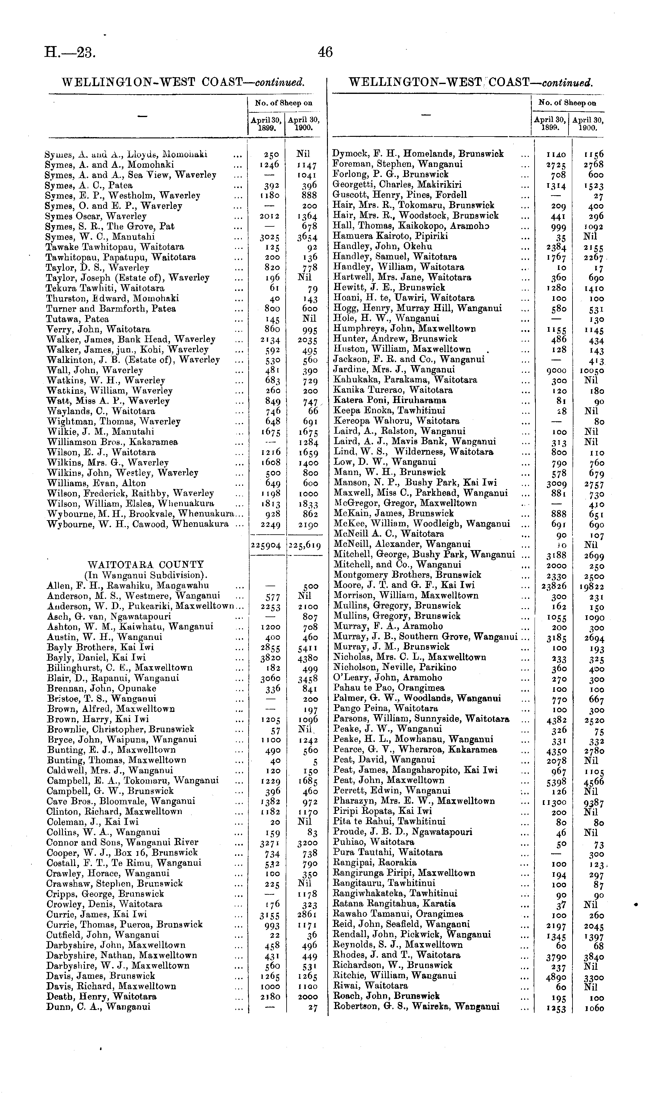 No. of Sheep on April 30, April 30, 1899. 1900. Symes, A. and A., Lloyds, Momohaki Symes, A. and A., Momohaki Symes, A. and A., Sea View, Waverley Symes, A, C, Patea Symes, E. P., Westholm, Waverley Symes, O. and E. P., Waverley Symes Oscar, Waverley Symes, S. R., The Grove, Pat Symes, W. C, Manutahi Tawake Tawhitopau, Waitotara Tawhitopau, Papatupu, Waitotara Taylor, D. S., Waverley Taylor, Joseph (Estate of), Waverley Tekura Tawhiti, Waitotara Thurston, Edward, Momohaki Turner and Barmforth, Patea Tutawa, Patea Verry, John, Waitotara Walker, James, Bank Head, Waverley Walker, James, jun., Kohi, Waverley Walkinton, J. B. (Estate of), Waverley Wall, John, Waverley Watkins, W. H., Waverley Watkins, William, Waverley Watt, Miss A. P., Waverley Way lands, C, Waitotara Wightman, Thomas, Waverley Wilkie, J. M., Manutahi Williamson Bros., Kakaramea Wilson, E. J., Waitotara Wilkins, Mrs. G., Waverley Wilkins, John, Westley, Waverley Williams, Evan, Alton Wilson, Frederick, Raithby, Waverley Wilson, William, Elslea, Whenuakura Wybourne, M. H., Brookvale, Whenuakura... Wybourne, W. II., Cawood, Whenuakura ... 250 1246 392 1180 2012 3°25 125 200 820 196 61 40 800 '45 860 2'34 592 53° 481 683 260 849 -46 648 1675 Nil "47 1041 396 888 200 '364 678 3654 92 136 778 Nil 79 '43 600 Nil 995 2°35 495 560 39° 729 200 747. 66 691 '675 1284 '659 1400 800 600 1216 1608 500 649 1198 1813 928 2249 IOOO 1833 862 2190 225904 225,619 WAITOTARA COUNTY (In Wanganui Subdivision). Allen, F. H., Rawahiku, Mangawahu Anderson, M. S., Westmere, Wanganui Anderson, W. D., Pukeariki, Maxwelltown... Asch, G. van, Ngawatapouri Ashton, W. M., Kaiwhatu, Wanganui Austin, W. H., Wanganui Bayly Brothers, Kai Iwi Bayly, Daniel, Kai Iwi BUlinghurst, C. E., Maxwelltown Blair, D., Rapanui, Wanganui Brennan, John, Opunake Bristoe, T. S., Wanganui Brown, Alfred, Maxwelltown Brown, Harry, Kai Iwi Brownlie, Christopher, Brunswick Bryce, John, Waipuna, Wanganui Bunting, E. J., Maxwelltown Bunting, Thomas, Maxwelltown Caldwell, Mrs. J., Wanganui Campbell, E. A., Tokomaru, Wanganui Campbell, G. W., Brunswick Cave Bros., Bloomvale, Wanganui Clinton, Richard, Maxwelltown Coleman, J., Kai Iwi Collins, W. A., Wanganui Connor and Sons, Wanganui River Cooper, W. J., Box 16, Brunswick Costall, F. T., Te Rimu, Wanganui Crawley, Horace, Wanganui Crawshaw, Stephen, Brunswick Cripps, George, Brunswick Crowley, Denis, Waitotara Currie, James, Kai Iwi Currie, Thomas, Pueroa, Brunswick Cutfield, John, Wanganui Darbyshire, John, Maxwelltown Darbyshire, Nathan, Maxwelltown Darbyshire, W. J., Maxwelltown Davis, James, Brunswick Davis, Richard, Maxwelltown Death, Henry, Waitotara Dunn, C. A., Wanganui 577 2253 1200 400 2855 3820 182 3060 336 1205 57 1100 49° 40 120 1229 396 1382 1182 500 Nil 2100 807 708 460 54" 4380 499 3458 841 200 '97 1096 Nii 1242 560 5 '5° 1685 460 972 1170 Nil 83 3200 738 79° 35° Nil 1178 323 2861 1171 36 496 449 53' 1265 I IOO 20 '59 327' 734 532 100 225 1 76 3'55 993 22 458 43' 560 1265 IOOO 2180 2000 27