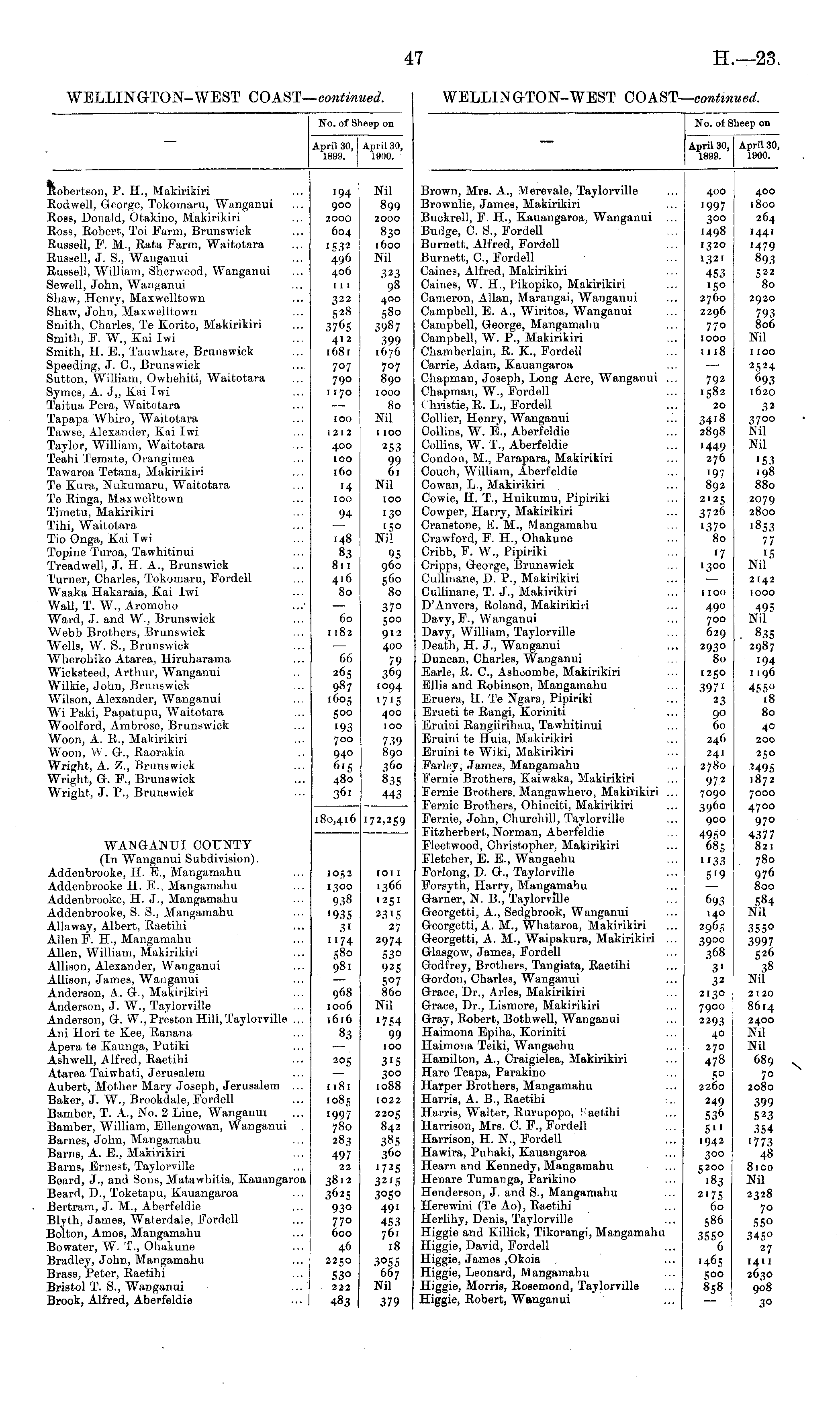 No. of Sheep on April 30, April 30, 1899. 1900. Brown, Mrs. A., Merevale, Taylorville Brownlie, James, Makirikiri Buckrell, F. H., Kauangaroa, Wanganui Budge, C. S., Fordell Burnett, Alfred, Fordell Burnett, C, Fordell Caines, Alfred, Makirikiri Caines, W. H., Pikopiko, Makirikiri Cameron, Allan, Marangai, Wanganui Campbell, E. A., Wiritoa, Wanganui Campbell, George, Mangamahu Campbell, W. P., Makirikiri Chamberlain, R. K., Fordell Carrie, Adam, Kauangaroa Chapman, Joseph, Long Acre, Wanganui ... Chapman, W., Fordell Christie, R. L., Fordell Collier, Henry, Wanganui Collins, W. E., Aberfeldie Collins, W. T., Aberfeldie Condon, M., Parapara, Makirikiri Couch, William, Aberfeldie Cowan, L., Makirikiri Cowie, H. T., Huikumu, Pipiriki Cowper, Harry, Makirikiri Cranstone, K. M., Mangamahu Crawford, F. H., Ohakune Cribb, F. W., Pipiriki Cripps, George, Brunswick Cullinane, D. P., Makirikiri Cullinane, T. J., Makirikiri D'Anvers, Roland, Makirikiri Davy, F., Wanganui Davy, William, Taylorville Death, H. J., Wanganui Duncan, Charles, Wanganui Earle, R. C, Ashoombe, Makirikiri EIUb and Robinson, Mangamahu Eruera, H. Te Ngara, Pipiriki Erueti te Rangi, Koriniti Eruini Rangiirihau, Tawhitinui Eruini te Huia, Makirikiri Eruini te Wiki, Makirikiri Farley, James, Mangamahu Fernie Brothers, Kaiwaka, Makirikiri Fernie Brothers. Mangawhero, Makirikiri ... Fernie Brothers, Ohineiti, Makirikiri Fernie, John, Churchill, Taylorville Fitzherbert, Norman, Aberfeldie Fleetwood, Christopher, Makirikiri Fletcher, E. E., Wangaehu Forlong, D. G., Taylorville Forsyth, Harry, Mangamahu Garner, N. B., Taylorville Georgetti, A., Sedgbrook, Wanganui Georgetti, A. M., Whataroa, Makirikiri Georgetti, A. M., Waipakura, Makirikiri ... Glasgow, James, Fordell Godfrey, Brothers, Tangiata, Raetihi Gordon, Charles, Wanganui Grace, Dr., Aries, Makirikiri Grace, Dr., Lismore, Makirikiri Gray, Robert, Both well, Wanganui Haimona Epiha, Koriniti Haimona Teiki, Wangaehu Hamilton, A., Craigielea, Makirikiri Hare Teapa, Parakino Harper Brothers, Mangamahu Harris, A. B., Raetihi Harris, Walter, Rurupopo, Kaetihi Harrison, Mrs. C. F., Fordell Harrison, H. N., Fordell Hawira, Puhaki, Kauangaroa Hearn and Kennedy, Mangamahu Henare Tumanga, Parikino Henderson, J. and S., Mangamahu Herewini (Te Ao), Raetihi Herlihy, Denis, Taylorville Higgie and Killick, Tikorangi, Mangamahu Higgie, David, Fordell Higgie, James ,Okoia Higgie, Leonard, Mangamahu Higgie, Morris, Rosemond, Taylorville Higgie, Robert, Wanganui 400 1997 3°° '498 132° 1321 453 ■5° 2760 2296 770 IOOO 1118 400 1800 264 1441 '479 893 522 80 2920 793 806 Nil 1100 792 1582 20 3418 2898 1449 276 '97 892 2125 3726 1370 80 '7 1300 2524 693 1620 32 3700 Nil Nil '53 198 880 2079 2800 '853 77 '5 Nil 2142 IOOO I IOO 490 700 629 2930 80 1250 3971 23 90 60 246 241 2780 972 7090 3960 900 4950 68; "33 5'9 495 Nil . 835 2987 '94 1196 455° 18 80 40 200 250 '-495 1872 7000 47°° 97° 4377 821 780 976 800 584 Nil 355° 3997 526 38 Nil 693 140 2965 3900 ■368 3' 32 2130 7900 2293 40 270 478 5° 2260 2120 8614 2400 Nil Nil 689 70 2080 249 536 5" 1942 300 5200 183 2175 60 586 355° 6 '465 500 858 399 523 354 '773 48 8100 Nil 2328 70 55° 345° 27 1411 2630 908 3°
