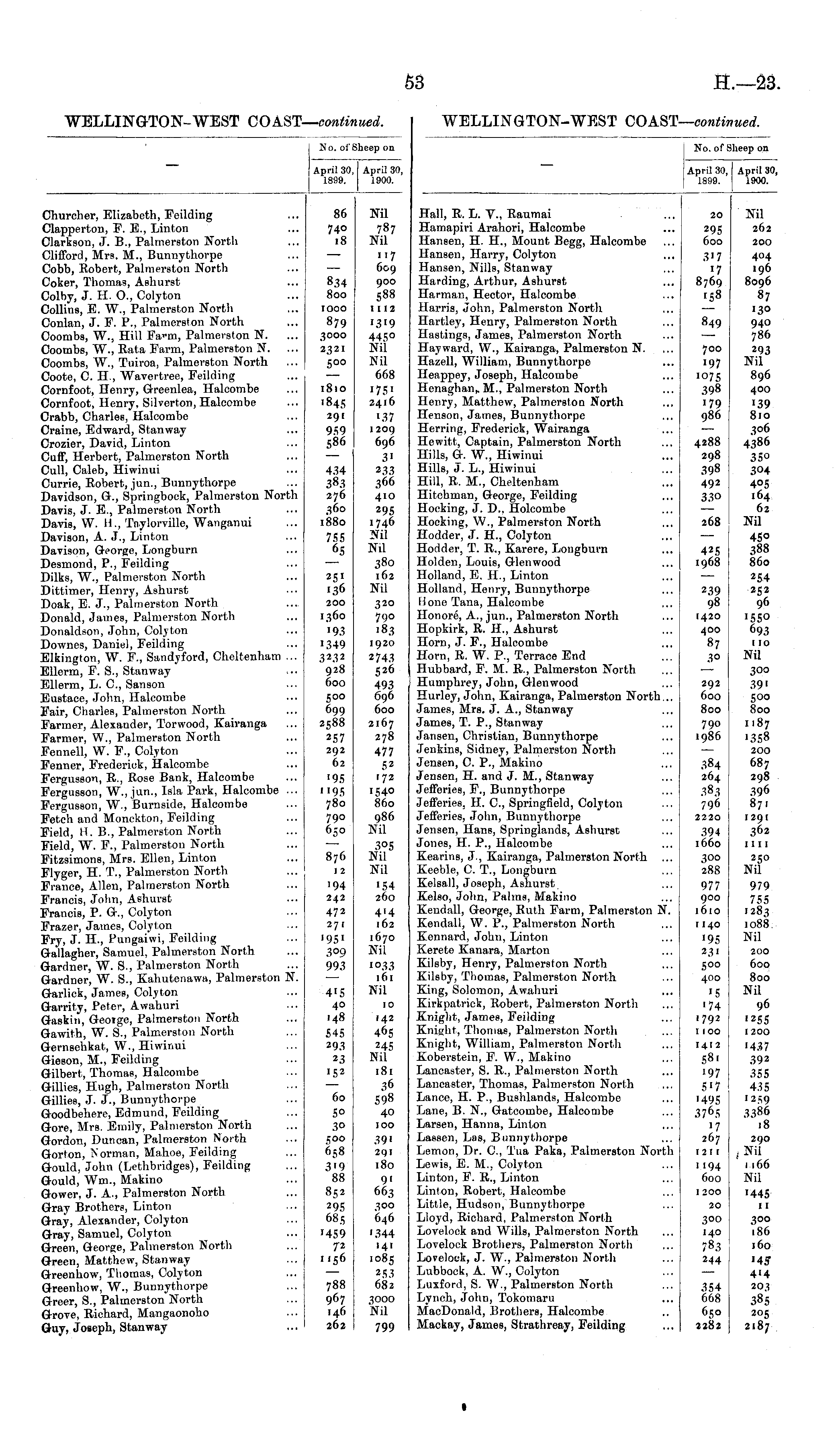 No. of Sheep on April 30, I April 30, 1899. 1900. Hall, R. L. V., Raumai Hamapiri Arahori, Halcombe Hansen, H. H., Mount Begg, Halcombe Hansen, Harry, Colyton Hansen, Nills, Stanway Harding, Arthur, Ashurst Harman, Hector, Halcombe Harris, John, Palmerston North Hartley, Henry, Palmerston North Hastings, James, Palmerston North Hayward, W., Kairanga, Palmerston N. Hazell, William, Bunnythorpe Heappey, Joseph, Halcombe Henaghan,. M., Palmerston North Henry, Matthew, PalmerBton North Henson, James, Bunnythorpe Herring, Frederick, Wairanga Hewitt, Captain, Palmerston North Hills, G. W., Hiwinui Hills, J. L., Hiwinui Hill, R. M., Cheltenham Hitchman, George, Feilding Hocking, J. D., Holcombe Hocking, W., Palmerston North Hodder,' J. H., Colyton Hodder, T. R., Karere, Longburn Holden, Louis, Glenwood Holland, E. H., Linton Holland, Henry, Bunnythorpe Hone Tana, Halcombe Honore, A., jun., Palmerston North Hopkirk, R. H., Ashurst Horn, J. F., Halcombe Horn, R. W. P., Terrace End Hubbard, F. M. R., Palmerston North Humphrey, John, Glenwood Hurley, John, Kairanga, Palmerston North,., James, Mrs. J. A., Stanway James, T. P., Stanway Jansen, Christian, Bunnythorpe Jenkins, Sidney, Palmerston North Jensen, C. P., Makino Jensen, H. and J. M., Stanway Jefferies, F., Bunnythorpe Jefferies, H. C, Springfield, Colyton Jefferies, John, Bunnythorpe Jensen, Hans, Springlands, Ashurst Jones, H. P., Halcombe Kearins, J., Kairanga, Palmerston North Keeble, C. T., Longburn Kelsall, Joseph, Ashurst Kelso, John, Palms, Makino Kendall, George, Ruth Farm, Palmerston N. Kendall, W. P., Palmerston North Kennard, John, Linton Kerete Kanara, Marton Kilsby, Henry, Palmerston North Kilsby, Thomas, Palmerston North King, Solomon, Awahuri Kirkpatrick, Robert, Palmerston North Knight, James, Feilding Knight, Thomas, Palmerston North Knight, William, Palmerston North Koberstein, F. W, Makino Lancaster, S. R., Palmerston North Lancaster, Thomas, PalmerBton North Lance, H. P., Bushlands, Halcombe Lane, B. N, Gatcombe, Halcombe Larsen, Hanna, Linton Lassen, Las, Bunnythorpe Lemon, Dr. C, Tua Paka, Palmerston North Lewis, E. M., Colyton Linton, F. R., Linton Linton, Robert, Halcombe Little, Hudson, Bunnythorpe Lloyd, Richard, Palmerston North Lovelock and Wills, Palmerston North Lovelock Brothers, Palmerston North Lovelock, J. W., Palmerston North Lubbock, A. W., Colyton Luxford, S. W., Palmerston North Lynch, John, Tokomaru MacDonald, Brothers, Halcombe Mackay, James, Strathreay, Feilding 20 295 600 Nil 262 3'7 '7 8769 .58 849 700 '97 '°75 398 '79 986 4288 298 398 492 330 268 200 404 196 8096 87 130 940 786 293 Nil 896 400 139 810 306 4386 35° 304 4°5 164 62 Nil 45° 388 860 254 252 96 1550 693 110 Nil 425 1968 239 98 1420 400 87 30 292 600 800 79° 1986 384 264 38.3 796 2220 300 39' 500 800 1187 '358 200 687 298 396 87. 1291 362 1111 250 Nil 979 755 1283 1088 Nil 394 1660 300 288 977 900 1610 1140 ■95 231 5°° 400 '5 174 1792 1100 1412 581 '97 517 1495 37 6 S '7 267 1211 200 600 800 Nil 96 1255 1200 14.37 392 355 435 ■259 3386 18 290 ,Nil 1166 Nil "94 600 1200 20 300 140 783 244 1445 11 300 186 160 '45 414 20? 385 205 2187 354 668 650 2282