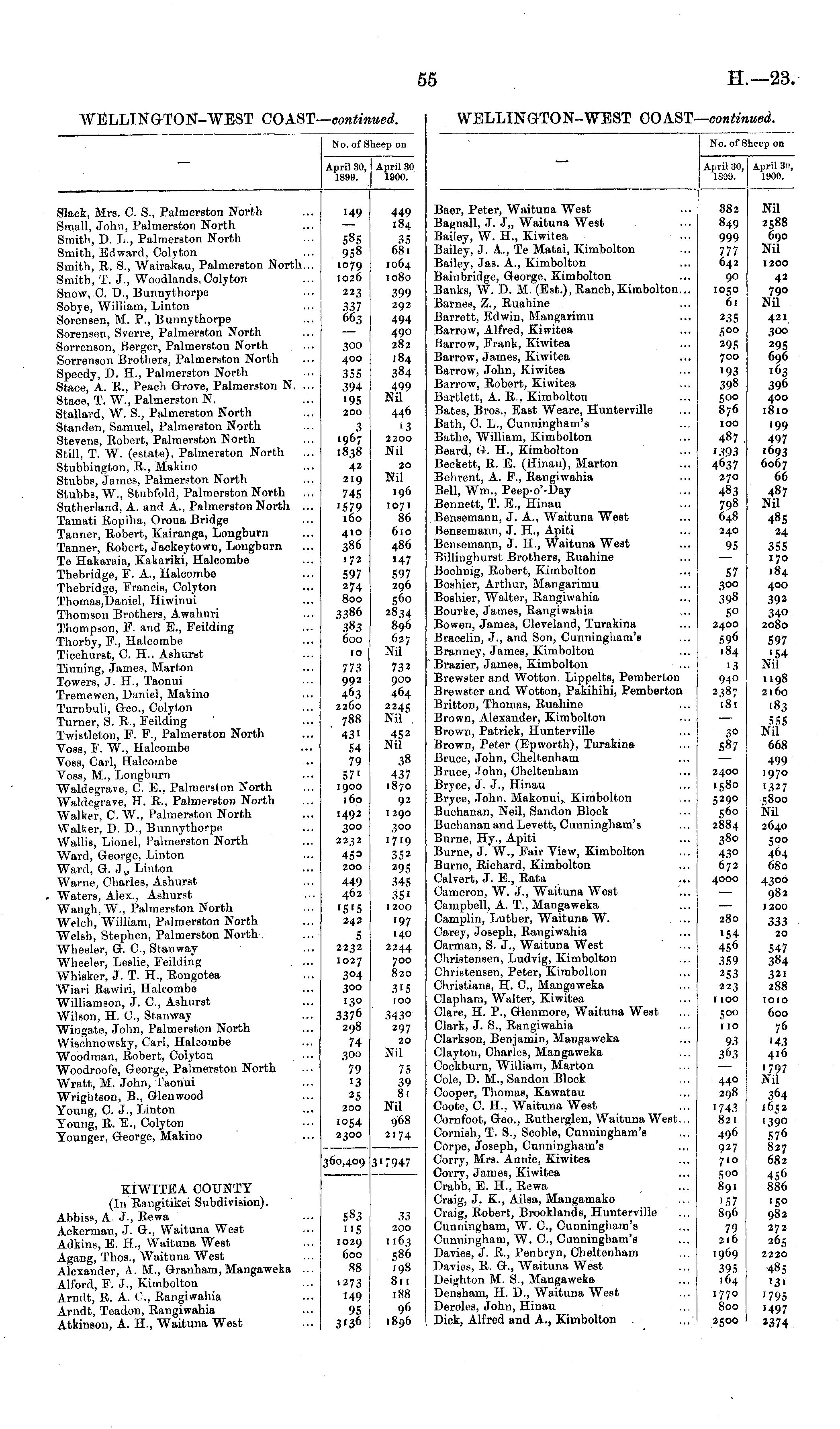 No. of Sheep on April 30, 1899. April 30, 1900. Baer, Peter, Waituna West Bagnall, J. J,, Waituna West Bailey, W. H., Kiwitea Bailey, J. A., Te Matai, Kimbolton Bailey, Jas. A., Kimbolton Bahibridge, George, Kimbolton Banks, W. D. M. (Est.), Ranch, Kimbolton... Barnes, Z., Ruahine Barrett, Edwin, Mangarimu Barrow, Alfred, Kiwitea Barrow, Frank, Kiwitea Barrow, James, Kiwitea Barrow, John, Kiwitea Barrow, Robert, Kiwitea Bartlett, A. R., Kimbolton Bates, Bros., East Weare, Hunterville Bath, C. L., Cunningham's Bathe, William, Kimbolton Beard, G. H., Kimbolton Beckett, R. E. (Hinau), Marton Behrent, A. F., Rangiwahia Bell, Wm., Peep-o'-Day Bennett, T. E., Hinau Bensemann, J. A., Waituna West Bensemann, J. H., Apiti Bensemann, J. H., Waituna West Billinghurst Brothers, Ruahine Bochnig, Robert, Kimbolton Boshier, Arthur, Mangarimu Boshier, Walter, Rangiwahia Bourke, James, Rangiwahia Bowen, James, Cleveland, Turakina Bracelin, J., and Son, Cunningham's Branney, James, Kimbolton Brazier, James, Kimbolton Brewster and Wotton. Lippelts, Pemberton Brewster and Wotton, Pakihihi, Pemberton Britton, Thomas, Ruahine Brown, Alexander, Kimbolton Brown, Patrick, Hunterville Brown, Peter (Epworth), Turakina Bruce, John, Cheltenham Bruce, John, Cheltenham Bryce, J. J., Hinau Bryce, John. Makonui, Kimbolton Buchanan, Neil, Sandon Block Buchanan and Levett, Cunningham's Burne, Hy., Apiti Burne, J. W., Fair View, Kimbolton Burne, Richard, Kimbolton Calvert, J. E., Rata Cameron, W. J., Waituna West Campbell, A. T., Mangaweka Camplin, Luther, Waituna W. Carey, Joseph, Rangiwahia Carman, S. J., Waituna West Christensen, Ludvig, Kimbolton Christensen, Peter, Kimbolton Christians, H. C, Mangaweka Clapham, Walter, Kiwitea Clare, H. P., Glenmore, Waituna West Clark, J. S., Rangiwahia Clarkson, Benjamin, Mangaweka Clayton, Charles, Mangaweka Cockburn, William, Marton Cole, D. M., Sandon Block Cooper, Thomas, Kawatau Coote, C. H, Waituna West Cornfoot, Geo., Rutherglen, Waituna West... Cornish, T. S., Scobie, Cunningham's Corpe, Joseph, Cunningham's Corry, Mrs. Annie, Kiwitea Corry, James, Kiwitea Crabb, E. H., Rewa Craig, J. K, Ailsa, Mangamako Craig, Robert, Brooklands, Hunterville Cunningham, W. C, Cunningham's Cunningham, W. C, Cunningham's Davies, J. R., Penbvyn, Cheltenham Davies, R. G., Waituna West Deighton M. S., Mangaweka Densham, H. D., Waituna West Deroles, John, Hinau Dick, Alfred and A., Kimbolton 382 849 999 777 642 90 1050 61 Nil 2588 690 Nil 235 5°° 295 700 '93 398 500 876 100 487, '393 4637 270 483 798 648 240 95 57 300 398 50 2400 596 184 '3 940 2387 '181 3° 587 2400 1580 5290 560 2884 380 43° 672 4000 1200 42 79° Nil 421 300 295 696 163 396 400 1810 '99 497 1693 6067 66 487 Nil 485 24 355 170 184 400 392 340 2080 597 '54 Nil 1198 2160 '83 555 Nil 668 499 1970 1327 i;8oo Nil 2640 500 464 680 43°° 982 1200 333 20 547 384 321 288 1010 600 76 '43 416 '797 Nil 364 1652 1390 576 827 682 456 886 '5° 982 272 265 2220 485 '3' '795 '497 2374 280 '54 456 359 253 223 1100 500 no 93 363 44° 298 '743 821 496 927 710 500 891 '57 896 79 216 1969 395 164 1770 800 2500
