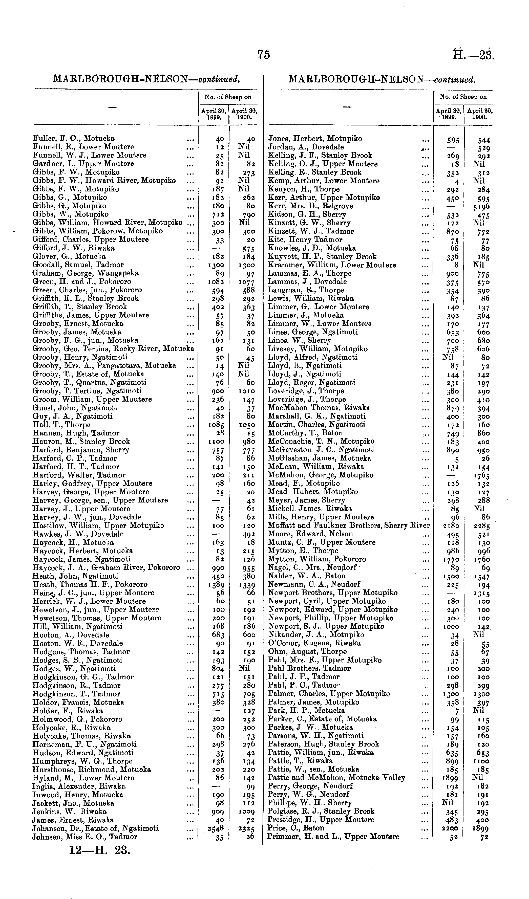 No. of Sheep on April 30, April 30, 1899. 1900. Fuller, F. O., Motueka Funnell, E., Lower Moutere Funnell, W. J., Lower Moutere Gardner, I., Upper Moutere Gibbs, F. W., Motupiko Gibbs, F. W., Howard River, Motupiko Gibbs, F. W., Motupiko Gibbs, G., Motupiko Gibbs, G., Motupiko Gibbs, W„ Motupiko Gibbs, William, Howard River, Motupiko ... Gibbs, William, Pokorow, Motupiko Gifford, Charles, Upper Moutere Gifford, J. W., Riwaka Glover, G., Motueka Goodall, Samuel, Tadmor Graham, George, Wangapeka Green, H. and J., Pokororo Green, Charles, jun., Pokororo Griffith, E. L., Stanley Brook Griffith, T., Stanley Brook Griffiths, James, Upper Moutere Grooby, Ernest, Motueka Grooby, James, Motueka Grooby, F. G., jun., Motueka Grooby, Geo. Tertius, Rocky River, Motueka Grooby, Henry, Ngatimoti Grooby, Mrs. A., Pangatotara, Motueka Grooby, T., Estate of, Motueka Grooby, T., Quartus, Ngatimoti Grooby, T. Tertius, Ngatimoti Groom, William, Upper Moutere Guest, John, Ngatimoti Guy, J. A., Ngatimoti Hall, T., Thorpe Hannen, Hugh, Tadmor Hanron, M., Stanley Brook Harford, Benjamin, Sherry Harford, C. P., Tadmor Harford, H. T., Tadmor Harford, Walter, Tadmor Harley, Godfrey, Upper Moutere Harvey, George, Upper Moutere Harvey, George, sen., Upper Moutere Harvey, J, Upper Moutere Harvey, J. W., jun., Dovedale Hastilow, William, Upper Motupiko Hawkes, J. W., Dovedale Haycock, H., Motueka Haycock, Herbert, Motueka Haycock, James, Ngatimoti Haycock, J. A., Graham River, Pokororo ... Heath, John, Ngatimoti Heath, Thomas H. F., Pokororo Heine, J. C, jun., Upper Moutere Herrick, W. J., Lower Moutere Hewetson, J., jun., Upper Mouter? Hewetson, Thomas, Upper Moutere HiU, William, Ngatimoti Hocton, A., Dovedale Hocton, W. R., Dovedale Hodgens, Thomas, Tadmor Hodges, S. B., Ngatimoti Hodges, W., Ngatimoti Hodgkinson, G. G., Tadmor Hodgkinson, R., Tadmor Hodgkinson, T., Tadmor Holder, Francis, Motueka Holder, F., Riwaka Holmwood, G., Pokororo Holyoake, R., Riwaka Holyoake, Thomas, Riwaka Horneman, F. U., Ngatimoti Hudson, Edward, Ngatimoti Humphreys, W. G., Thorpe Hursthouse, Richmond, Motueka Hyland, M., Lower Moutere Inglis, Alexander, Riwaka Inwood, Henry, Motueka Jackett, Jno., Motueka Jenkins, W.. Riwaka James, Ernest, Riwaka Johansen, Dr., Estate of, Ngatimoti Johnsen, Miss E. O., Tadmor 4° 12 25 82 82 92 187 182 180 712 300 300 33 182 1300 89 1082 594 298 402 57 85 97 161 9' 5° '4 140 76 900 236 40 182 1085 28 1100 757 87 Hi 200 98 25 40 Nil Nil 82 273 Nil Nil 262 80 79° Nil 300 20 575 .84 1300 97 1077 588 292 363 37 82 5° 131 60 45 Nil Nil 60 1010 '47 37 80 1050 '5 980 777 86 '5° 211 160 20 77 85 100 42 61 62 120 163 '3 82 492 18 215 126 955 380 '339 66 5' 192 191 186 600 990 45° '389 56 60 100 200 168 683 go 142 '93 804 121 277 7'5 38° 91 '52 190 Nil '5' 280 200 3,00 66 2g8 37 136 202 86 7°5 328 127 252 300 73 276 42 '34 220 190 98 gog 40 2548 35 142 99 '95 112 1009 72 2325 26