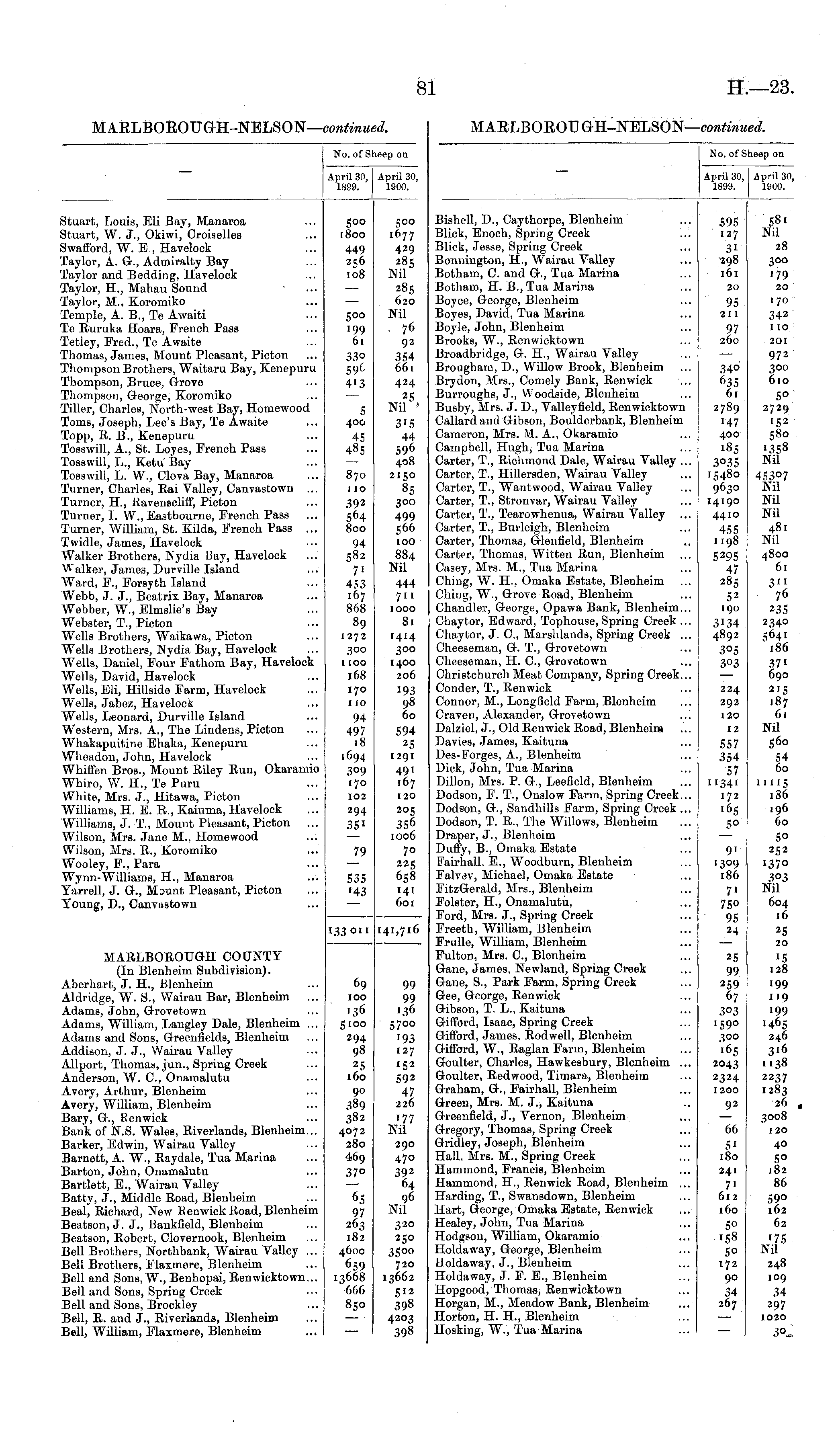 No. of Sheep on April 30, April 30, 1899. 1900. Bishell, D., Caythorpe, Blenheim Blick, Enoch, Spring Creek Blick, Jesse, Spring Creek Bonnington, H., Wairau Valley Botham, C. and &., Tua Marina Botham, H. B., Tua Marina Boyce, George, Blenheim Boyes, David, Tua Marina Boyle, John, Blenheim Brooks, W., Renwicktown Broadbridge, G. H., Wairau Valley Brougham, D., Willow Brook, Blenheim Brydon, Mrs., Comely Bank, Renwick Burroughs, J., Woodside, Blenheim Busby, Mrs. J. D., Valleyfield, Renwicktown Callard and Gibson, Boulderbank, Blenheim Cameron, Mrs. M. A., Okaramio Campbell, Hugh, Tua Marina Carter, T., Richmond Dale, Wairau Valley ... Carter, T., Hillersden, Wairau Valley Carter, T., Wantwood, Wairau Valley Carter, T., Stronvar, Wairau Valley Carter, T., Tearowhenua, Wairau Valley Carter, T., Burleigh, Blenheim Carter, Thomas, Glenfield, Blenheim Carter, Thomas, Witten Run, Blenheim Casey, Mrs. M., Tua Marina Ching, W. H., Omaka Estate, Blenheim Ching, W., Grove Road, Blenheim Chandler, George, Opawa Bank, Blenheim... Chaytor, Edward, Tophouse, Spring Creek ... Chaytor, J. C, Marshlands, Spring Creek ... Cheeseman, G. T., Grovetown Cheeseman, H. C, Grovetown Christchurch Meat Company, Spring Creek... Conder, T., Renwick Connor, M., Longfield Farm, Blenheim Craven, Alexander, Grovetown Dalziel, J., Old Renwick Road, Blenheim Davies, James, Kaituna Des-Forges, A., Blenheim Dick, John, Tua Marina Dillon, Mrs. P. G., Leefield, Blenheim Dodson, F. T., Onslow Farm, Spring Creek... Dodson, G., Sandhills Farm, Spring Creek ... Dodson, T. R., The Willows, Blenheim Draper, J., Blenheim Duffy, B., Omaka Estate Fairhall, E., Woodburn, Blenheim Falvev, Michael, Omaka Estate FitzGerald, Mrs., Blenheim Folster, H., Onamalutu, Ford, Mrs. J., Spring Creek Freeth, William, Blenheim Frulle, William, Blenheim Fulton, Mrs. C, Blenheim Gane, James, Newland, Spring Creek Gane, S., Park Farm, Spring Creek Gee, George, Renwick Gibson, T. L., Kaituna Gifford, Isaac, Spring Creek Gifford, James, Rodwell, Blenheim Gifford, W., Raglan Farm, Blenheim Goulter, Charles, Hawkesbury, Blenheim ... Goulter, Redwood, Timara, Blenheim Graham, G., Fairhall, Blenheim Green, Mrs. M. J., Kaituna Greenfield, J., Vernon, Blenheim Gregory, Thomas, Spring Creek Gridley, Joseph, Blenheim Hall, Mrs. M., Spring Creek Hammond, Francis, Blenheim Hammond, H., Renwick Road, Blenheim ... Harding, T., Swansdown, Blenheim Hart, George, Omaka Estate, Renwick Healey, John, Tua Marina Hodgson, William, Okaramio Holdaway, George, Blenheim Holdaway, J., Blenheim Holdaway, J. F. E., Blenheim Hopgood, Thomas, Renwicktown Horgan, M., Meadow Bank, Blenheim Horton, H. H., Blenheim Hosking, W., Tua Marina 595 127 31 298 161 20 95 211 97 260 34° 635 61 2789 •47 400 185 30.35 15480 9630 14190 4410 455 1198 5295 47 285 52 190 31.34 4892 305 303 224 292 120 12 557 354 57 "341 172 '65 5° 58l Nil 28 300 '79 20 170 342 110 201 972 300 610 5° 2729 152 580 '358 Nil 45.3° 7 Nil Nil Nil 481 Nil 4800 61 3" 76 2.35 2340 564' 186 37' 690 215 .87 61 Nil 560 54 60 11115 186 196 60 9' '3°9 186 7' 75° 95 24 5° 252 '37° 3°3 Nil 604 16 25 20 25 99 259 67 303 1590 300 ''65 2043 2324 1200 '5 128 '99 "9 '99 1465 246 316 1138 2237 1283 26 3008 120 40 5° 182 86 92 66 5' 180 241 7' 612 160 5° '58 50 172 go 34 267 59° 162 62 '75 Nil 248 109 34 297 1020 3°^