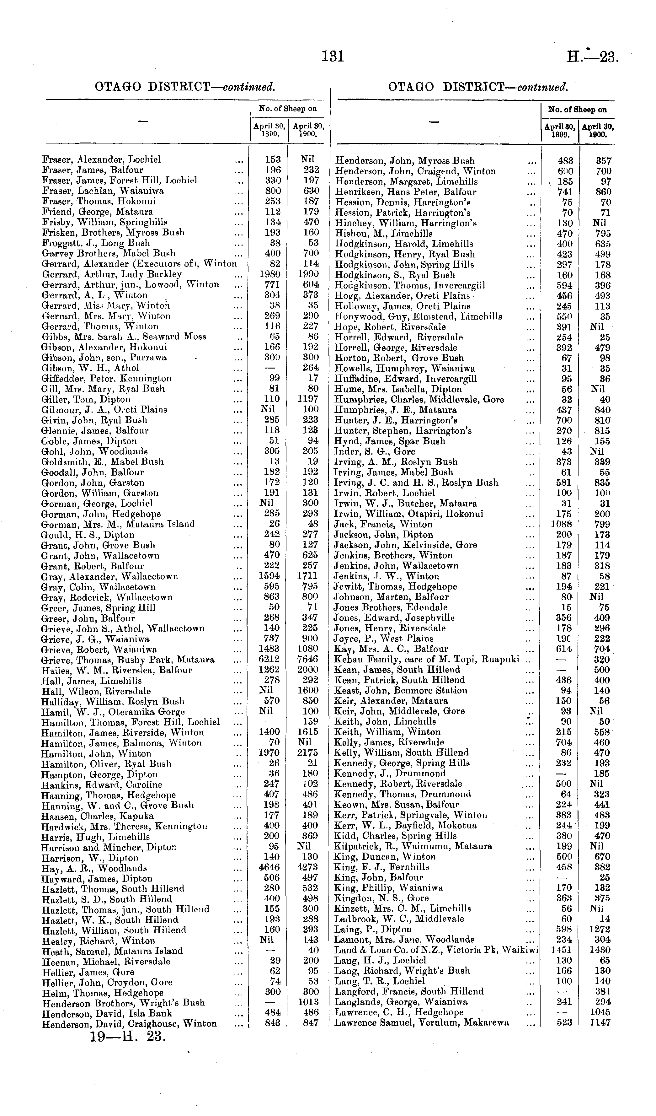 No. of Sheep on April 30, April 30, 1899. 1900. Henderson, John, Myross Bush Henderson, John, Craigend, Winton Henderson, Margaret, Limehills Henriksen, Hans Peter, Balfour Hession, Dennis, Harrington's Hession, Patrick, Harrington's Hinchey, William, Harrington's Hishon, M., Limehills Hodgkinson, Harold, Limehills Hodgkinson, Henry, Ryal Bush Hodgkinson, John, Spring Hills Hodgkinson, S., Ryal Bush Hodgkinson, Thomas, Invercargill Hong, Alexander, Oreti Plains Holloway, James, Oreti Plains Honywood, Guy, Ehnstead, Limehills Hope, Robert, Riversdale Horrell, Edward, Riversdale Horrell, George, Riversdale Horton, Robert, Grove Bush Howells, Humphrey, Waianiwa Huffadine, Edward, Invercargill Hume, Mrs. Isabella, Dipton Humphries, Charles, Middlevale, Gore Humphries, J. E., Mataura Hunter, J. E., Harrington's Hunter, Stephen, Harrington's Hynd, James, Spar Bush Inder, S. G., Gore Irving, A. M., Roslyn Bush Irving, James, Mabel Bush Irving, J. C. and H. S., Roslyn Bush Irwin, Robert, Lochiel Irwin, W. J., Butcher, Mataura Irwin, William, Otapiri, Hokonui Jack, Francis, Winton Jackson, John, Dipton Jackson, John, Kelvinside, Gore Jenkins, Brothers, Winton Jenkins, John, Wallacetown Jenkins, J. W., Winton Jewitt, ThomaB, Hedgehope Johnson, Marten, Balfour Jones Brothers, Edendale Jones, Edward, Josephville Jones, Henry, Riversdale Joyce, P., West Plains Kay, Mrs. A. C, Balfour Kehau Family, care of M. Topi, Ruapuki ... Kean, James, South Hillend Kean, Patrick, South Hillend Keast, John, Benmore Station Keir, Alexander, Mataura Keir, John, Middlevale, Gore Keith, John, Limehills Keith, William, Winton Kelly, James, Riversdale Kelly, William, South Hillend Kennedy, George, Spring Hills Kennedy, J., Drummond Kennedy, Robert, Riversdale Kennedy, Thomas, Drummond Keown, Mrs. Susan, Balfour Kerr, Patrick, Springvale, Winton Kerr, W. L., Bayfield, Mokotua Kidd, Charles, Spring Hills Kilpatrick, R., Waimumu, Mataura King, Duncan, Winton King, F. J., Fernhills King, John, Balfour King, Phillip, Waianiwa Kingdon, N. S., Gore Kinzett, Mrs. C. M., Limehills Ladbrook, W. C, Middlevale Laing, P., Dipton Lamont, Mrs. Jane, Woodlands Land & Loan Co. of N.Z., Victoria Pk, Waikiwi Lang, H. J., Lochiel Lang, Richard, Wright's Bush Lang, T. R., Lochiel Langford, Francis, South Hillend Langlands, George, Waianiwa Lawrence, C. II., Hedgehope Lawrence Samuel, Verulum, Makarewa 483 600 \ 185 741 75 70 130 470 400 423 297 160 594 456 245 550 391 254 392 67 31 95 56 32 437 700 270 126 43 373 61 581 100 31 175 1088 200 179 187 183 87 194 80 15 356 178 19C 614 357 700 97 860 70 71 Nil 795 635 499 178 168 396 493 113 35 Nil 25 479 98 35 36 Nil 40 840 810 815 155 Nil 339 55 835 100 31 200 799 173 114 179 318 58 221 Nil 75 409 296 222 704 320 500 400 140 56 Nil 50 558 460 470 193 185 Nil 323 441 483 199 470 Nil 670 382 25 132 375 Nil 14 1272 304 1430 65 130 140 381 294 1045 1147 436 94 150 93 90 215 704 86 232 500 64 224 383 244 380 199 500 458 170 363 56 60 598 234 1451 130 166 100 241 523