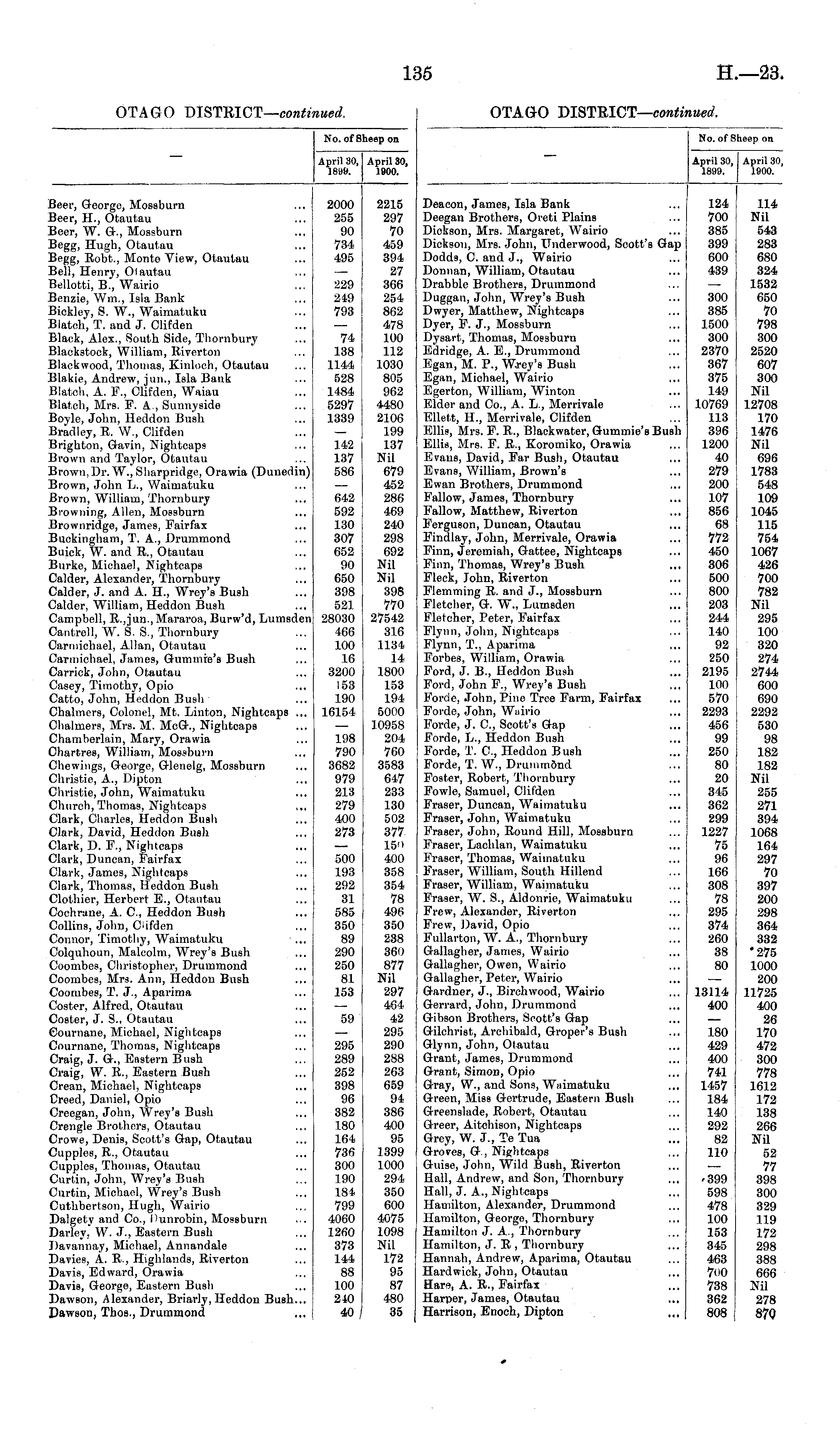 No. of Sheep on April 30, April 30, 1899. 1900. Beer, George, Mossburn Beer, H., Otautau Beer, W. G., Mossburn Begg, Hugh, Otautau Begg, Robt., Monte View, Otautau Bell, Henry, Olautau Bellotti, B., Wairio Benzie, Wm., Isla Bank Bickley, S. W, Waimatuku Blatch, T. and J. Clifden Black, Alex., South Side, Thornbury Blackstock, William, Riverton Blackwood, Thomas, Kinloch, Otautau Blakie, Andrew, jun., Isla Bank Blatch, A. F., Clifden, Waiau Blatch, Mrs. F. A., Sunnyside Boyle, John, Heddon Bush Bradley, R. W., Clifden Brighton, Gavin, Nightcaps Brown and Taylor, Otautau Brown, Dr. W., Sharpridge, Orawia (Dunedin) Brown, John L., Waimatuku Brown, William, Thornbury Browning, Allen, Mossburn Brownridge, James, Fairfax Buckingham, T. A., Drummond Buick, W. and R., Otautau Burke, Michael, Nightcaps Calder, Alexander, Thornbury Calder, J. and A. H., Wrey's Bush Calder, William, Heddon Bush Campbell, R., jun., Mararoa, Burw'd, LuniBden Cantrell, W. S. S., Thornbury Carmichael, Allan, Otautau Carmichael, James, Gummie's Bush Carrick, John, Otautau Casey, Timothy, Opio Catto, John, Heddon Bush Chalmers, Colonel, Mt. Linton, Nightcaps ... Chalmers, Mrs. M. McG., Nightcaps Chamberlain, Mary, Orawia Chartres, William, Mossburn Chewings, George, Glenelg, Mossburn Christie, A., Dipton Christie, John, Waimatuku Church, Thomas, Nightcaps Clark, Charles, Heddon Bush Clark, David, Heddon Bush Clark, D. F., Nightcaps Clark, Duncan, Fairfax Clark, James, Nightcaps Clark, Thomas, Heddon Bush Clothier, Herbert E., Otautau Cochrane, A. C, Heddon Bush Collins, John, C'ifden Connor, Timothy, Waimatuku Colquhoun, Malcolm, Wrey's Bush Coombes, Christopher, Drummond Coombes, Mrs. Ann, Heddon Bush Coombes, T. J., Aparima Coster, Alfred, Otautau Coster, J. 8., Otautau Cournane, Michael, Nightcaps Cournane, Thomas, Nightcaps Craig, J. G., Eastern Bush Craig, W. R., Eastern Bush Crean, Michael, Nightcaps Creed, Daniel, Opio Creegan, John, Wrey's Bush Crengle Brothers, Otautau Crowe, Denis, Scott's Gap, Otautau Cupples, R., Otautau Cupples, Thomas, Otautau Curtin, John, Wrey's Bush Curtin, Michael, Wrey's Bush Cuthbertson, Hugh, Wairio Dalgety and Co., Dunrobin, Mossburn Darley, W. J., Eastern Bush Davannay, Michael, Annandale Davies, A. R, Highlands, Riverton Davis, Edward, Orawia Davis, George, Eastern Bush Dawson, Alexander, Briarly, Heddon Bush... Dawson, Thos., Drummond 2000 255 90 734 495 2215 297 70 459 394 27 366 254 862 478 100 112 1030 805 962 4480 2106 199 137 Nil 679 452 286 469 240 298 692 Nil Nil 398 770 27542 316 1134 14 1800 153 194 5000 10958 204 760 3583 647 233 130 502 377 15H 400 358 354 78 496 350 238 360 877 Nil 297 464 42 295 290 288 263 659 94 386 400 95 1399 1000 294 350 600 4075 1098 Nil 172 95 87 480 35 229 249 793 74 138 1144 528 1484 5297 1339 142 137 586 642 592 130 307 652 90 650 398 521 28030 466 100 16 3200 153 190 16154 198 790 3682 979 213 279 400 273 500 193 292 31 585 350 89 290 250 81 153 59 295 289 252 398 96 382 180 164 736 300 190 184 799 4060 1260 373 144 88 100 240 40