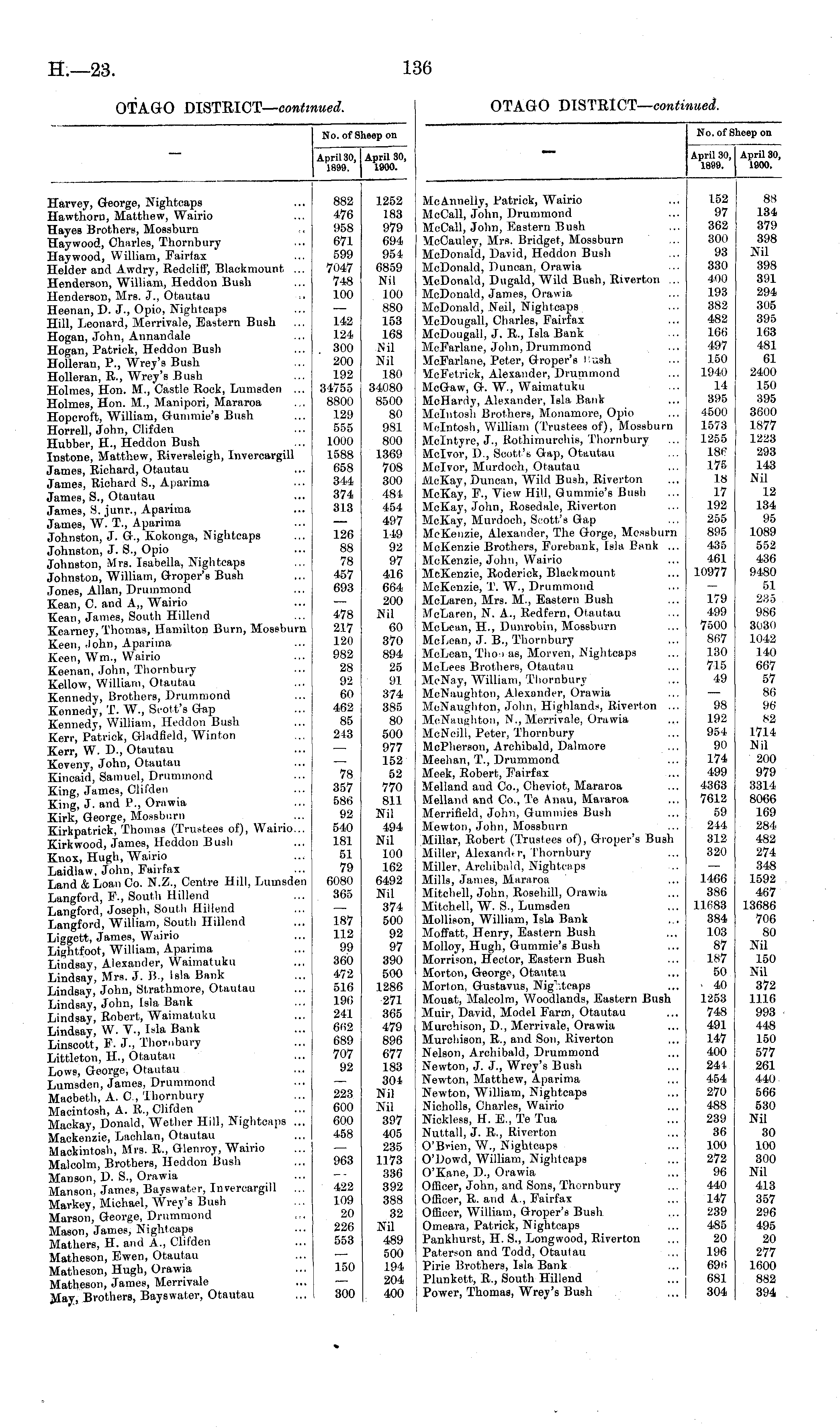 No. of Sheep on April 30, 1899. April 30, 1900. McAnnelly, Patrick, Wairio McCall, John, Drummond McCall, John, Eastern Bush McCauley, Mrs. Bridget, Mossburn McDonald, David, Heddon Bush McDonald, Duncan, Orawia McDonald, Dugald, Wild Bush, Riverton ... McDonald, James, Orawia McDonald, Neil, Nightcaps McDougall, Charles, Fairfax McDougall, J. R., Isla Bank McFarlane, John, Drummond McFarlane, Peter, Groper's i:ush McFetrick, Alexander, Drummond McGaw, G. W., Waimatuku McHardy, Alexander, Isla Bank Mcintosh Brothers, Monamore, Opio Mcintosh, William (Trustees of), Mossburn Mclntyre, J., Rothimurchis, Thornbury Mclvor, D., Scott's Gap, Otautau Mclvor, Murdoch, Otautau McKay, Duncan, Wild Bush, Riverton McKay, F., View Hill, Gummie's Bush McKay, John, Rosedale, Riverton McKay, Murdoch, Scott's Gap McKenzie, Alexander, The Gorge, Mossburn McKenzie Brothers, Forebank, Isla Bank ... McKenzie, John, Wairio McKenzie, Roderick, Blackmount McKenzie, I. W., Drummond McLaren, Mrs. M., Eastern Bush McLaren, N. A., Redfern, Otautau McLean, H., Dunrobin, Mossburn McLean, J. B., Thornbury McLean, Thoo as, Morven, Nightcaps McLees Brothers, Otautau McNay, William, Thornbury McNaughton, Alexander, Orawia McNaughton, John, Highlands, Riverton ... McNaughton, N., Merrivale, Orawia McNeill, Peter, Thornbury McPherson, Archibald, Dalmore Meehan, T., Drummond Meek, Robert, Fairfax Melland and Co., Cheviot, Mararoa Melland and Co., Te Anau, Mararoa Merrifield, John, Guinmies Bush Mewton, John, Mossburn Millar, Robert (Trustees of), Groper's Bush Miller, Alexandn-, Thornbury Miller, Archibald, Nightcaps Mills, James, Mararoa Mitchell, John, Rosehill, Orawia Mitchell, W. S., Lumsden Mollison, WiUiam, Isla Bank Moffatt, Henry, Eastern Bush Molloy, Hugh, Gummie's Bush Morrison, Hector, Eastern Bush Morton, George, Otautau Morton, Gustavus, Nightcaps Mouat, Malcolm, Woodlands, Eastern Bush Muir, David, Model Farm, Otautau Murchison, D., Merrivale, Orawia Murchison, R., and Son, Riverton Nelson, Archibald, Drummond Newton, J. J., Wrey's Bush Newton, Matthew, Aparima Newton, William, Nightcaps Nicholls, Charles, Wairio Nickless, H. E., Te Tua Nuttall, J. R., Riverton O'Brien, W., Nightcaps O'Dowd, William, Nightcaps O'Kane, D., Orawia Officer, John, and Sons, Thornbury Officer, R. and A., Fairfax Officer, William, Groper's Bush Omeara, Patrick, Nightcaps Pankhurst, H. S., Longwood, Riverton Paterson and Todd, Otautau Pirie Brothers, Isla Bank Plunkett, R., South Hillend Power, Thomas, Wrey's Bush 152 97 362 300 93 330 400 193 382 482 166 497 150 1940 14 395 4500 1573 1255 186' 175 18 17 192 255 895 435 461 10977 88 134 379 398 Nil 398 391 294 305 395 163 481 61 2400 150 395 3600 1877 1223 293 143 Nil 12 134 95 1089 552 436 9480 51 285 986 3030 1042 140 667 57 86 96 82 1714 Nil 200 979 3314 8066 169 284 482 274 348 1592 467 13686 706 80 Nil 150 Nil 372 1116 993 448 150 577 261 440 566 530 Nil 30 100 300 Nil 413 357 296 495 20 277 1600 882 394 179 499 7500 867 130 715 49 98 192 954 90 174 499 4363 7612 59 244 312 320 1466 386 11683 384 103 87 187 50 40 1253 748 491 147 400 244 454 270 488 239 36 100 272 96 440 147 239 485 20 196 696 681 304