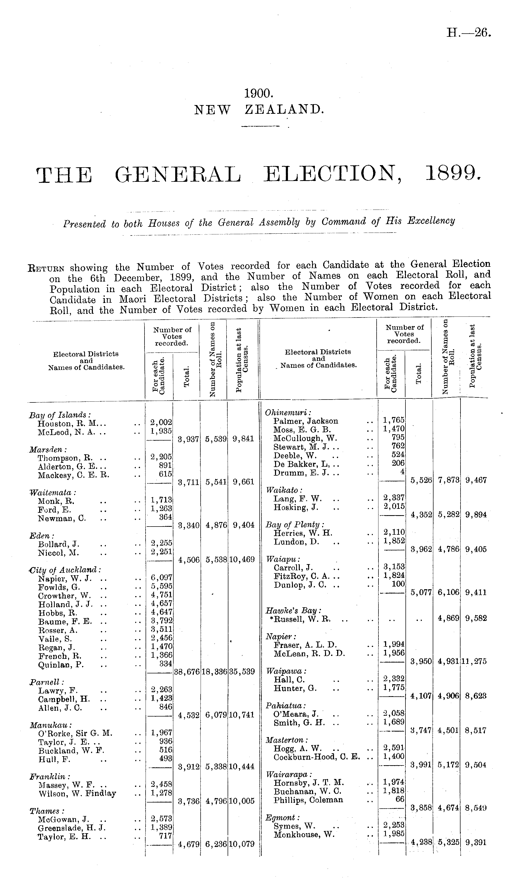 Return showing the Number of Votes recorded for each Candidate at the General Election on the 6th December, 1899, and the Number of Names on each Electoral Roll, and Population in each Electoral District; also the Number of Votes recorded for each Candidate in Maori Electoral Districts; also the Number of Women on each Electoral Roll, and the Number of Votes recorded by Women in each Electoral District.