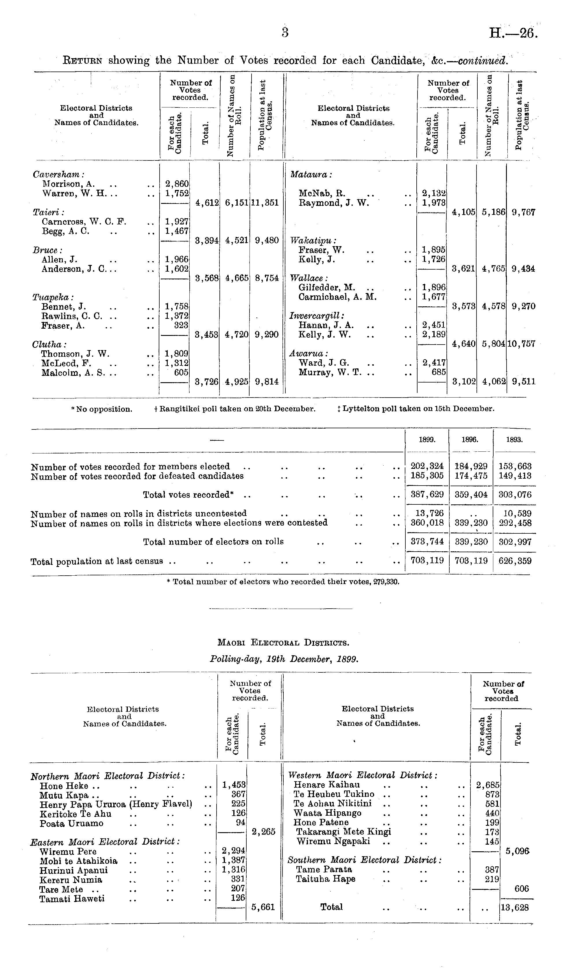 Electoral Districts and Names of Candidates. Number of Votes recorded. _3 © j S a H a o a> I !« CD a s 65 m a a O cc "S ° »o o a ■ o ft Electoral Districts and Names of Candidates. o 03 o3T3 Numi Vo recoi ber of tes :ded. a o CO a o3 I* <1> .Q a "A CD a c o ; 30 ~o 3 Pi o Cti "3 o Caversham: Morrison, A. Warren, W. H. .. 2,860 1,752 4,61! Mataura: McNab, R. Raymond, 3. W. 4,612 6,151 11,351 2,132 1,973 Taieri : Oarncross, W. C. F. Begg, A. C. 1,927 1,467 9,480 4,105 5,186 9,767 Bruce: Allen, J. Anderson, J. C. .. 3,39' 3,394 4,521 Wakatipu: Eraser, W. Kelly, J. 9,434 1,966 1,602 8,754 1,895 1,726 3,621 ; 4,765 Tuapeka: Bennet, J. Rawlins, 0. C. Fraser, A. 3,56! 3,568 4,665 Wallace: Gilfedder, M. .. Carmichael, A. M. 1,896 1,677 1,758 1,372 323 Invercargill: Hanan, J. A. Kelly, J. W. 3,573 4,578 9,270 9,290 2,451 2,189 10,757 Clutha: Thomson, J. W. McLeod, F. Malcolm, A. S. .. 3,455 3,453 4,720 1,809 1,312 605 4,640| 5,804 Awarua: Ward, J. G. Murray, W. T. .. 2,417 685 9,511 3.72( 3,726 4,925 9,814 3,102 4, 162 * No opposition. + Rangiti] ;ei poll takeu o: 20th D, member. t Lyttelton poll ti bkei on 15tl Decei iber. 1899. 1896. 1893. Number of votes recorded for members elected Number of votes recorded for defeated candidates 202,324 185,305 184,929 174,475 153,663 149,413 Total votes recorded* 359,404 303,076 387,629 Number of names on rolls in districts uncontested Number of names on rolls in districts where elections were contested 13,726 360,018 339!230 10,539 292,458 Total number of electors on rolls 373,744 339,230 302,997 Total population at last census 703,119 703,119 626,359 * Total number of electors who recorded their votes, 279,330.