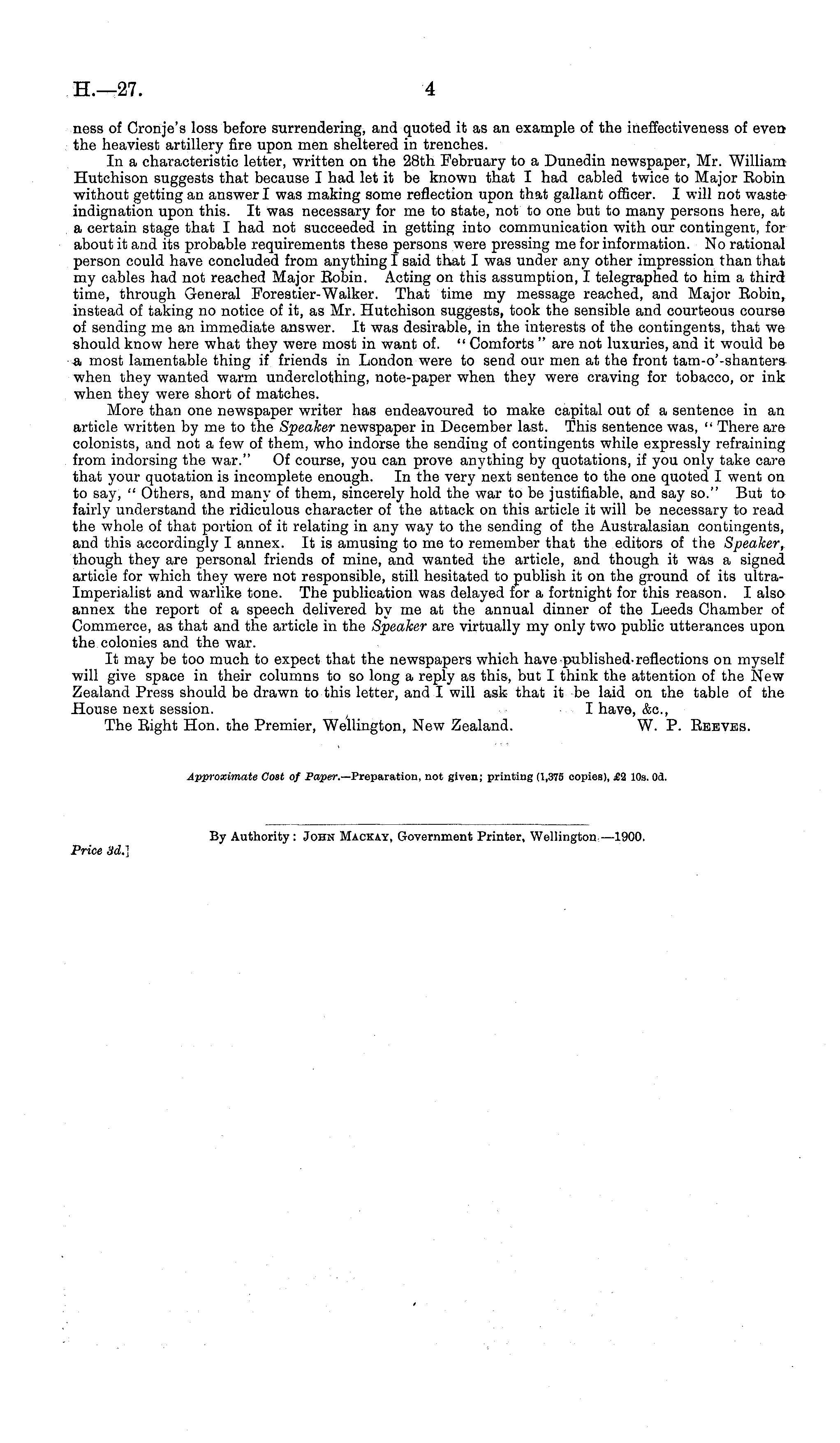 ness of Cronje's loss before surrendering, and quoted it as an example of the ineffectiveness of even the heaviest artillery fire upon men sheltered in trenches. In a characteristic letter, written on the 28th February to a Dunedin newspaper, Mr. William Hutchison suggests that because I had let it be known that I had cabled twice to Major Robin without getting an answer I was making some reflection upon that gallant officer. I will not waste indignation upon this. It was necessary for me to state, not to one but to many persons here, at a certain stage that I had not succeeded in getting into communication with our contingent, for about it and its probable requirements these persons were pressing me for information. No rational person could have concluded from anything I said that I was under any other impression than that my cables had not reached Major Robin. Acting on this assumption, I telegraphed to him a third time, through General Forestier-Walker. That time my message reached, and Major Robin, instead of taking no notice of it, as Mr. Hutchison suggests, took the sensible and courteous course of sending me an immediate answer. It was desirable, in the interests of the contingents, that we should know here what they were most in want of. " Comforts " are not luxuries, and it would be & most lamentable thing if friends in London were to send our men at the front tam-o'-shantera when they wanted warm underclothing, note-paper when they were craving for tobacco, or ink when they were short of matches. More than one newspaper writer has endeavoured to make capital out of a sentence in an article written by me to the Speaker newspaper in December last. This sentence was, " There are colonists, and not a few of them, who indorse the sending of contingents while expressly refraining from indorsing the war." Of course, you can prove anything by quotations, if you only take care that your quotation is incomplete enough. In the very next sentence to the one quoted I went on to say, " Others, and many of them, sincerely hold the war to be justifiable, and say so." But to fairly understand the ridiculous character of the attack on this article it will be necessary to read the whole of that portion of it relating in any way to the sending of the Australasian contingents, and this accordingly I annex. It is amusing to me to remember that the editors of the Speaker, though they are personal friends of mine, and wanted the article, and though it was a signed article for which they were not responsible, still hesitated to publish it on the ground of its ultraImperialist and warlike tone. The publication was delayed for a fortnight for this reason. I also annex the report of a speech delivered by me at the annual dinner of the Leeds Chamber of Commerce, as that and the article in the Speaker are virtually my only two public utterances upon the colonies and the war. It may be too much to expect that the newspapers which have published-reflections on myself will give space in their columns to so long a reply as this, but I think the attention of the New Zealand Press should be drawn to this letter, and I will ask that it be laid on the table of the House next session. I have, &c, The Right Hon. the Premier, Wellington, New Zealand. W. P. Reeves.