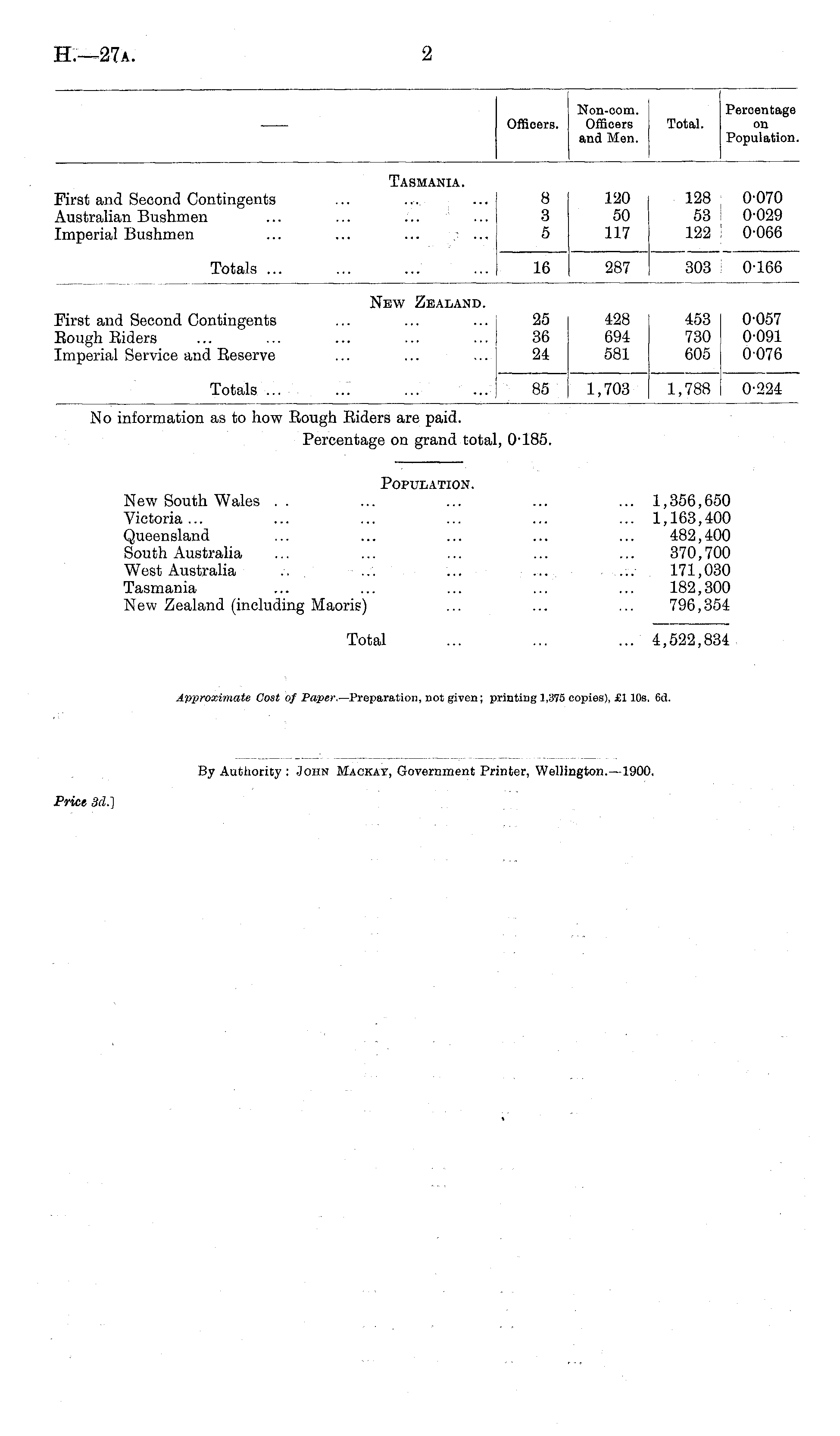 Population. New South Wales .. ... ... ... ... 1,356,650 Victoria... ... ... ... ... ... 1,163,400 Queensland ... ... ... ... ... 482,400 South Australia ... ... ... ... ... 370,700 West Australia .. ... ... .... ... 171,030 Tasmania ... ... ... ... ... 182,300 New Zealand (including Maoris) ... ... ... 796,354 Total ... ... ... 4,522,834 Approximate Cost of Paper.— Preparation, not given; printing 1,375 copies), £1 10s. 6d.