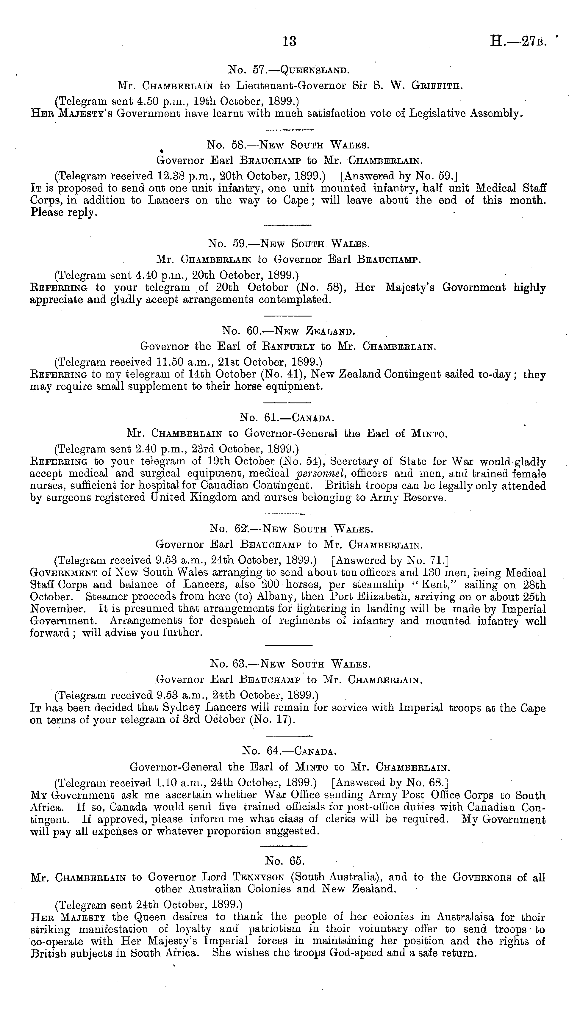 No. 57.—Queensland. Mr. Chamberlain to Lieutenant-Governor Sir S. W. Griffith. (Telegram sent 4.50 p.m., 19th October, 1899.) Her Majesty's Government have learnt with much satisfaction vote of Legislative Assembly.
