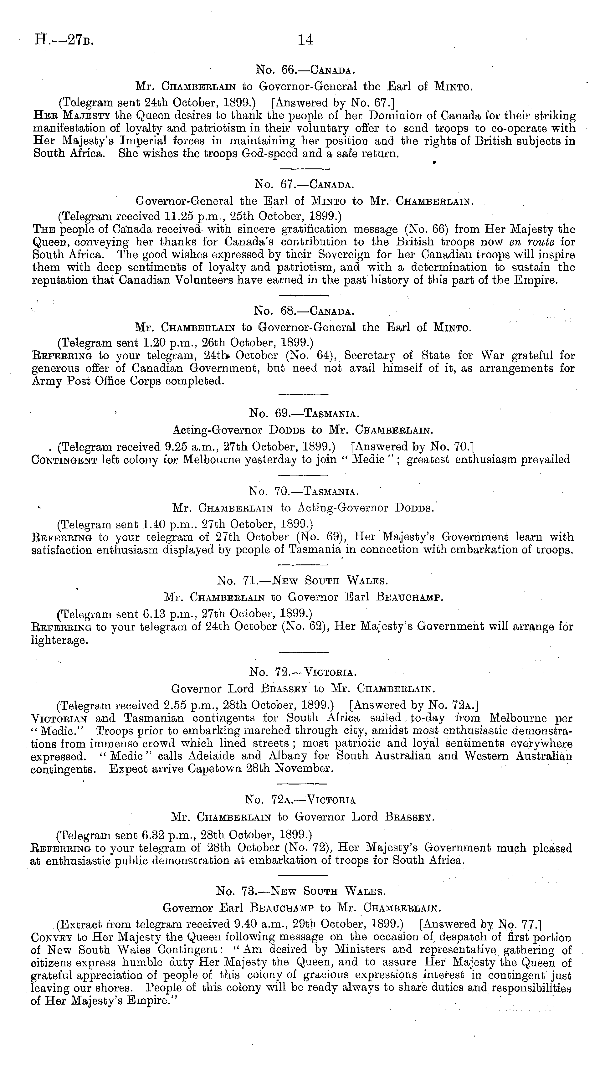 No. 72.—Victoria. Governor Lord Brassey to Mr. Chamberlain. (Telegram received 2.55 p.m., 28th October, 1899.) [Answered by No. 72a.] Victorian and Tasmanian contingents for South Africa sailed to-day from Melbourne per " Medic." Troops prior to embarking marched through city, amidst most enthusiastic demonstrations from immense crowd which lined streets ; most patriotic and loyal sentiments everywhere expressed. "Medic" calls Adelaide and Albany for South Australian and Western Australian contingents. Expect arrive Capetown 28th November.